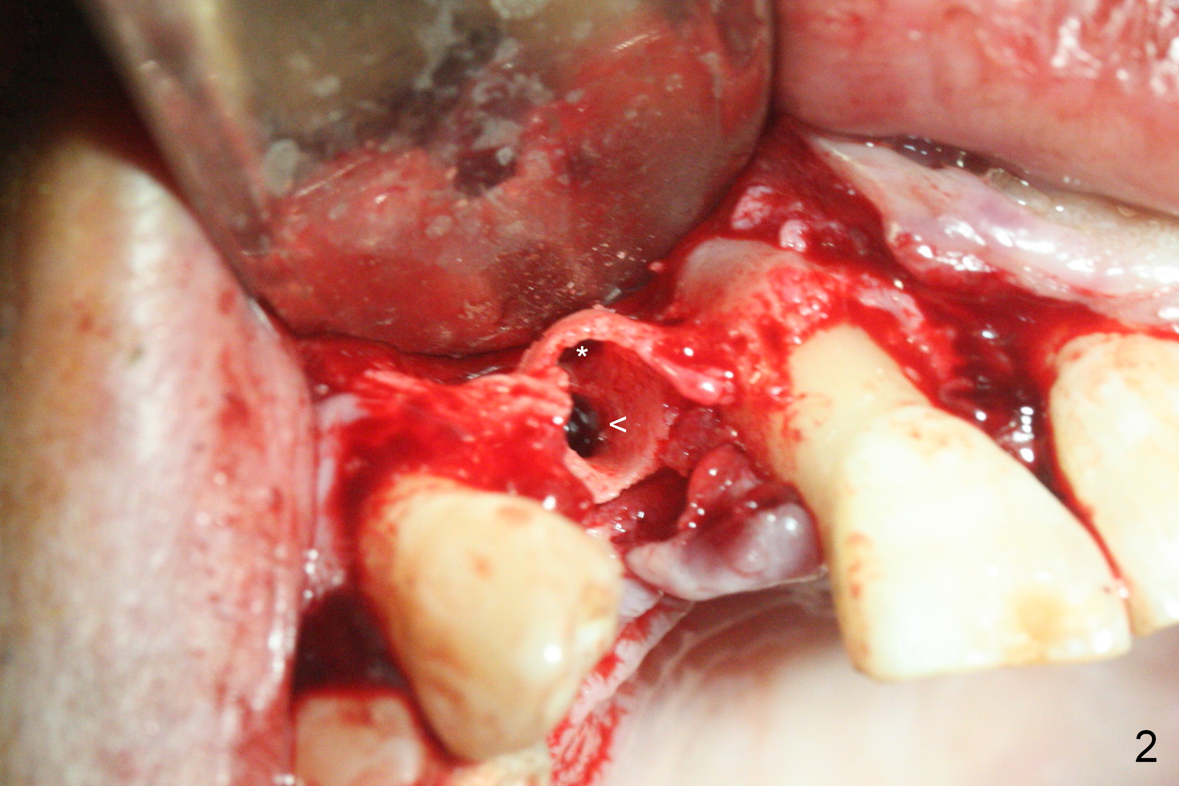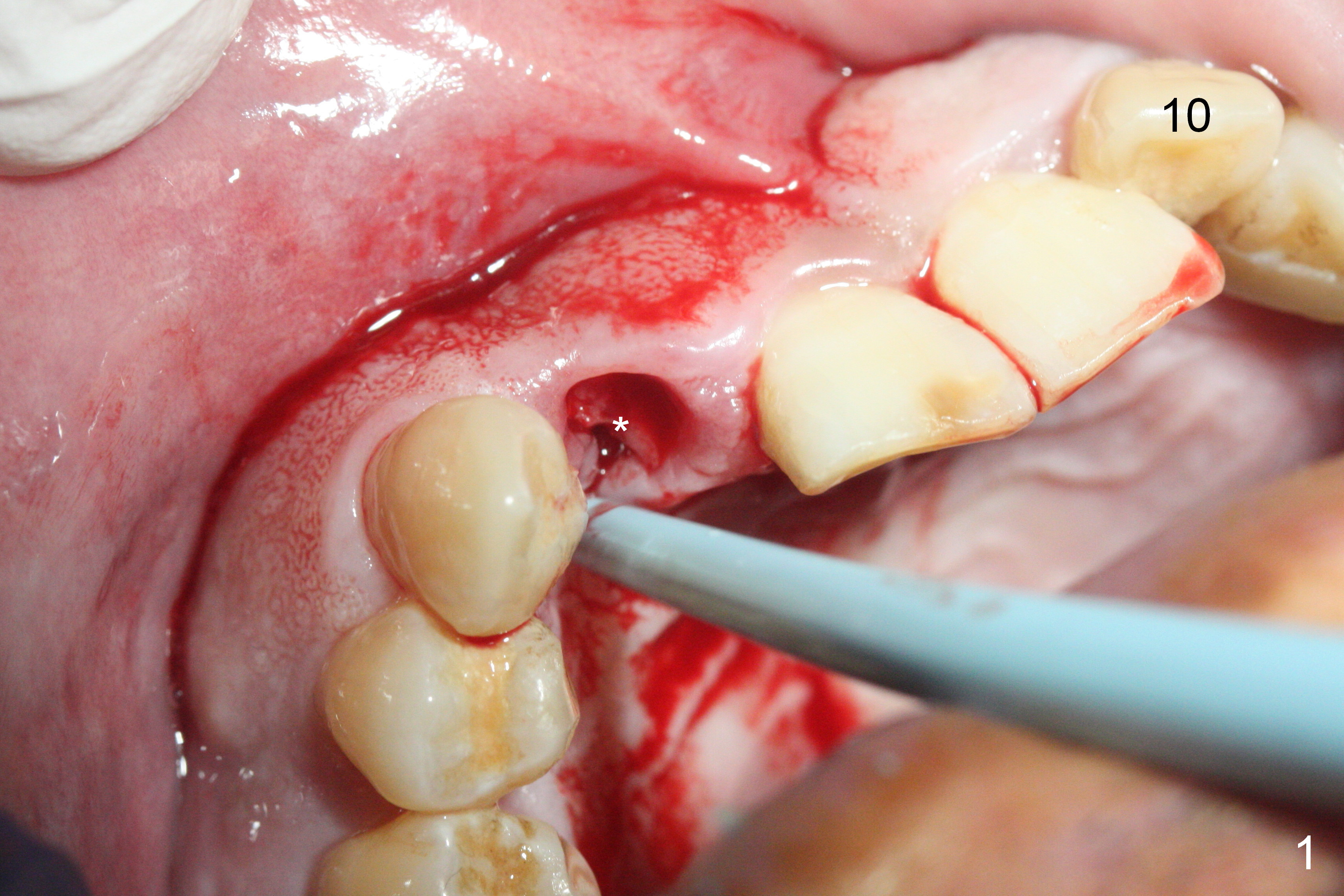 Access to the fractured root is limited after the crown is removed (Fig.1 *). Note the buccally-positioned tooth #10. After explanation the patient accepts in advance the possibility of the similar or same position of the restoration at #7.