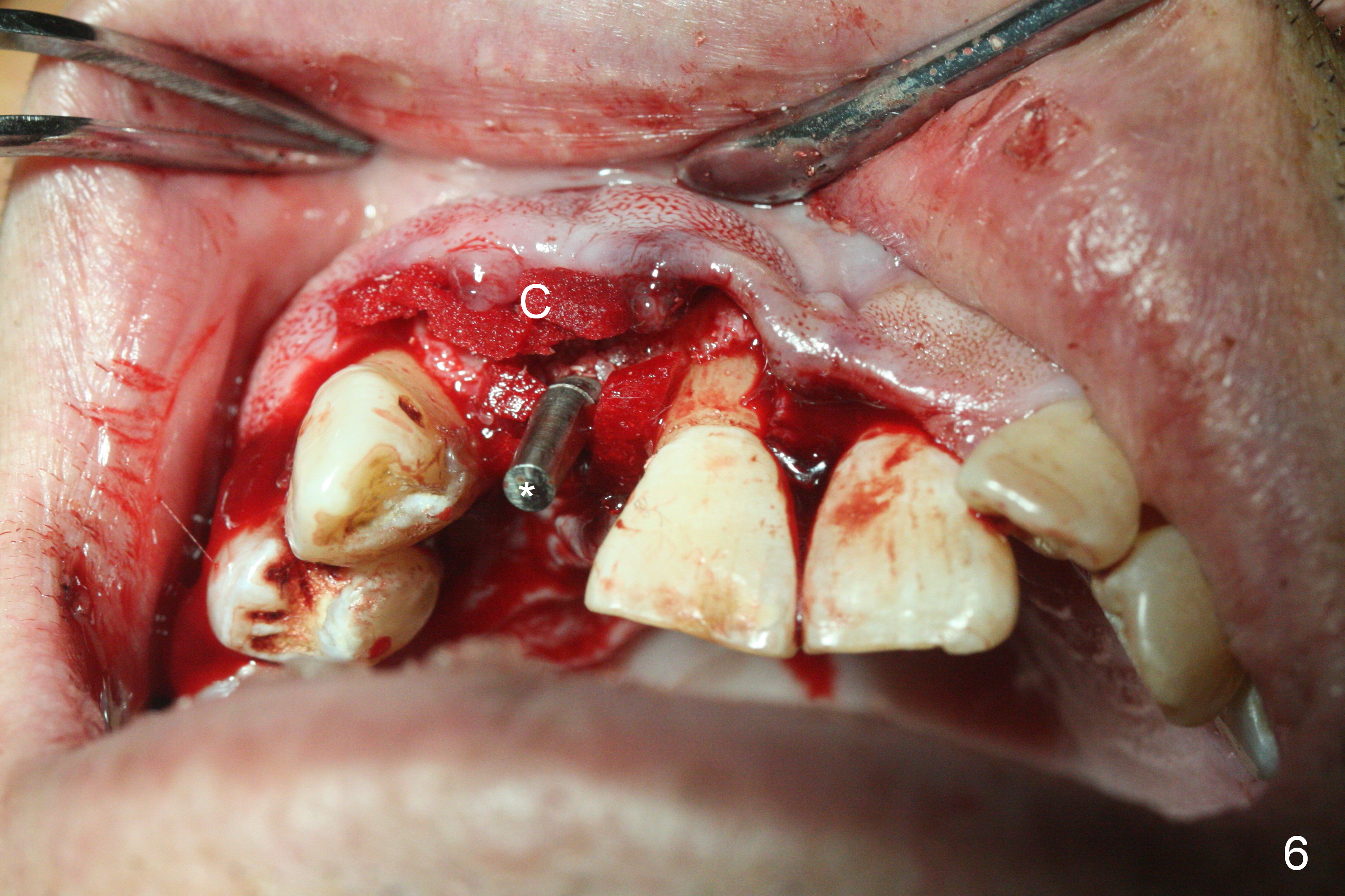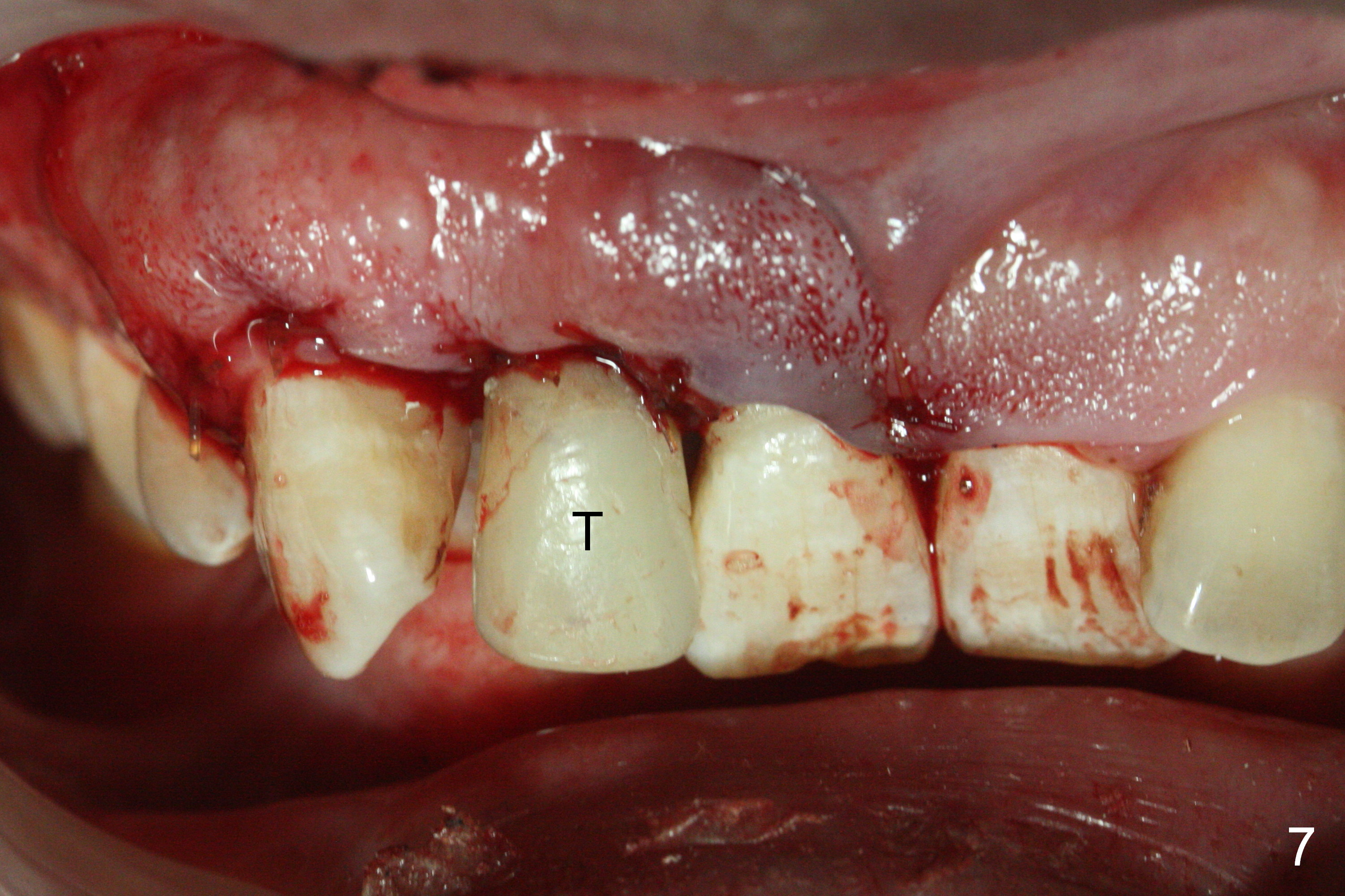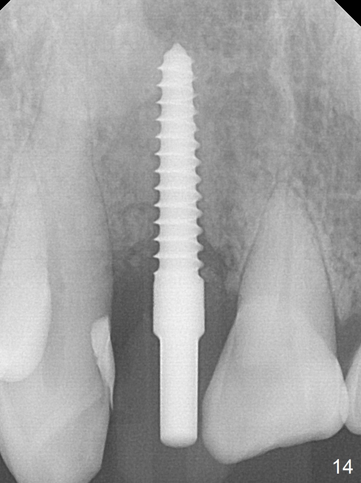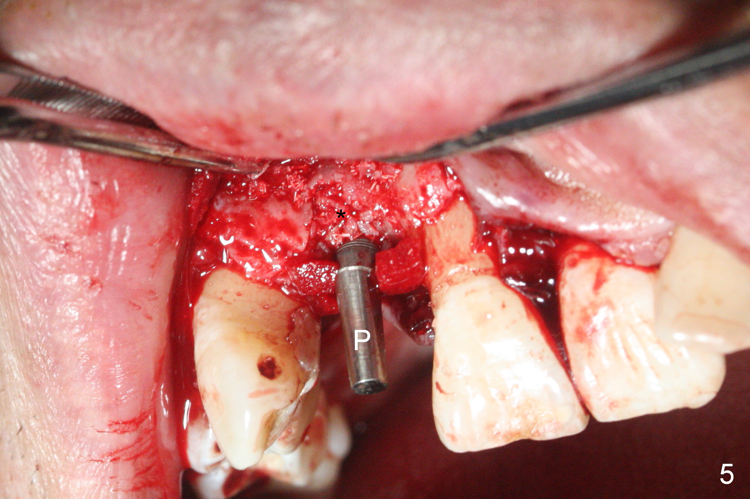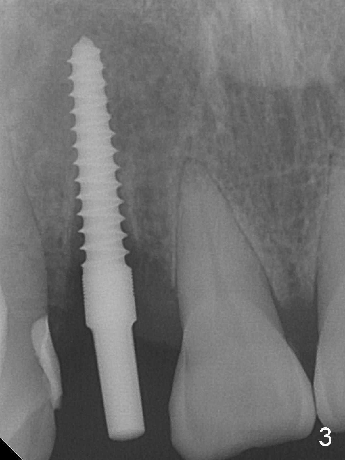 When the flaps are raised, the buccal plate is found to be perforated (Fig.2 *); osteotomy is being established in the narrow palatal wall (<). When a 3x17 mm (tissue-level) 15 ° 1-piece implant is placed (Fig.3,5 P), the incisal end of the implant is between the incisal edge of the central incisors and that of the tooth #10 (Fig.6) so that the temporary crown (Fig.7 T) is slightly buccal with sufficient palatal clearance with the opposing dentition.