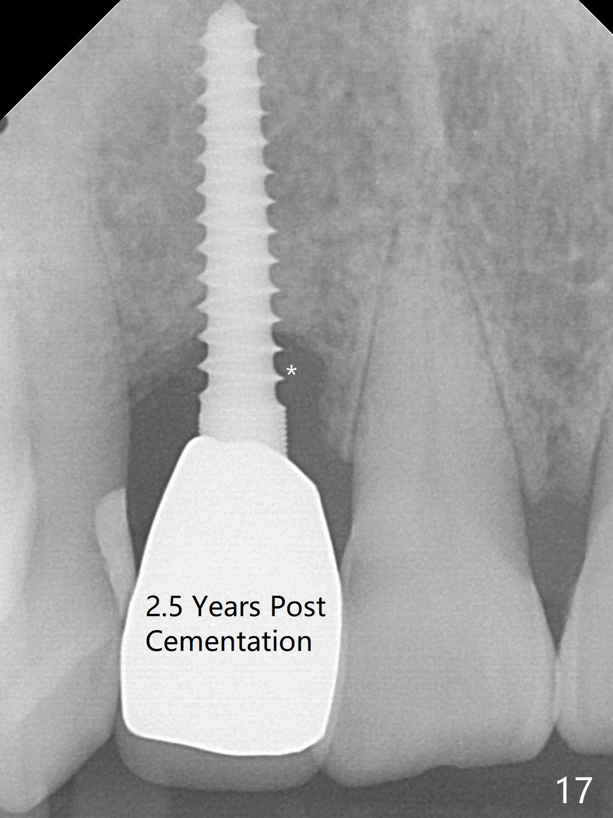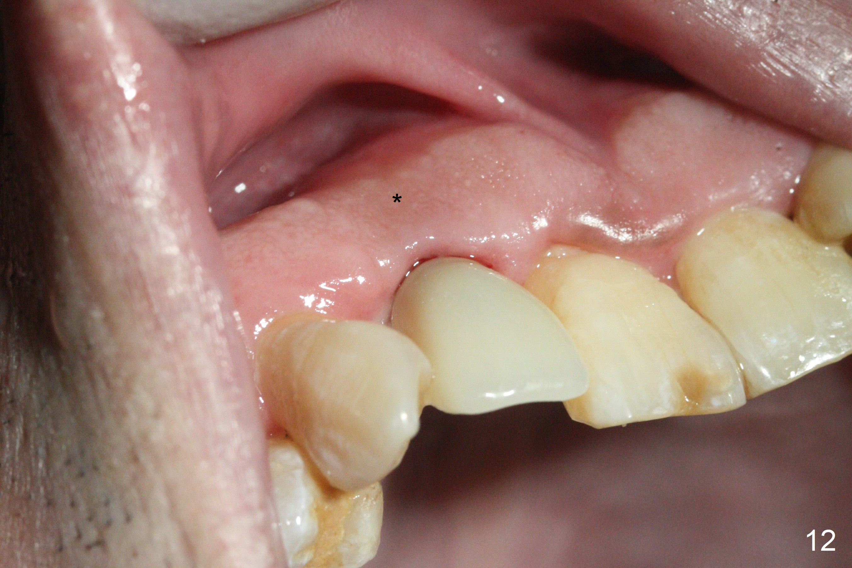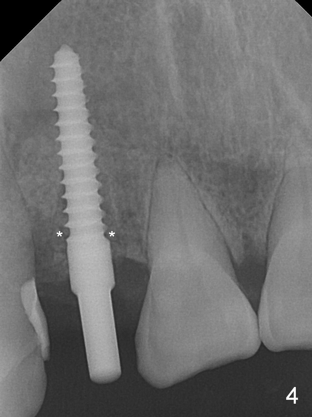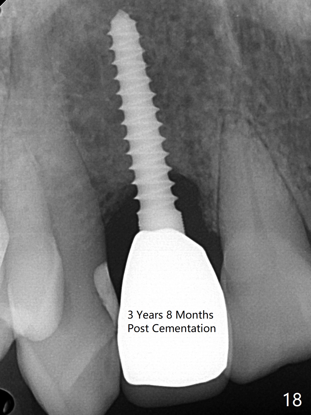 Sixteen days postop, the patient is doing fine, although the labial fistula has not disappeared (Fig.8 <). The detached distolabial papilla is healing (Fig.9 *) with mild bone graft exposure (^). The lacerated distopalatal papilla is also healing (Fig.10 *). These complications are related to flap surgery. The apical portion of the socket appears to have reduced 4 months postop (Fig.14). When the definitive restoration is delivered 5 months postop, there is gingival recession, including the distal of #8 (Fig.11 arrows, which is expected to improve over time) due to flap surgery. The labial plate collapse is minimal (Fig.12 *), while the palatal laceration (Fig.10) has healed (Fig.13). When the patient returns 1.5 years post cementation, there is increased bone density next to the coronal portion of the implant, equivalent to the bone graft (Fig.15 *). The fistula is absent (Fig.16). The crestal bone loss remains 2.5 years post cementation (Fig.17 *), although there is no sign of periimplantitis (magnification). Oral hygiene is poor. There is no change in the soft (gingival recession; data not shown) or hard tissues 3 years 8 months post cementation (Fig.18).