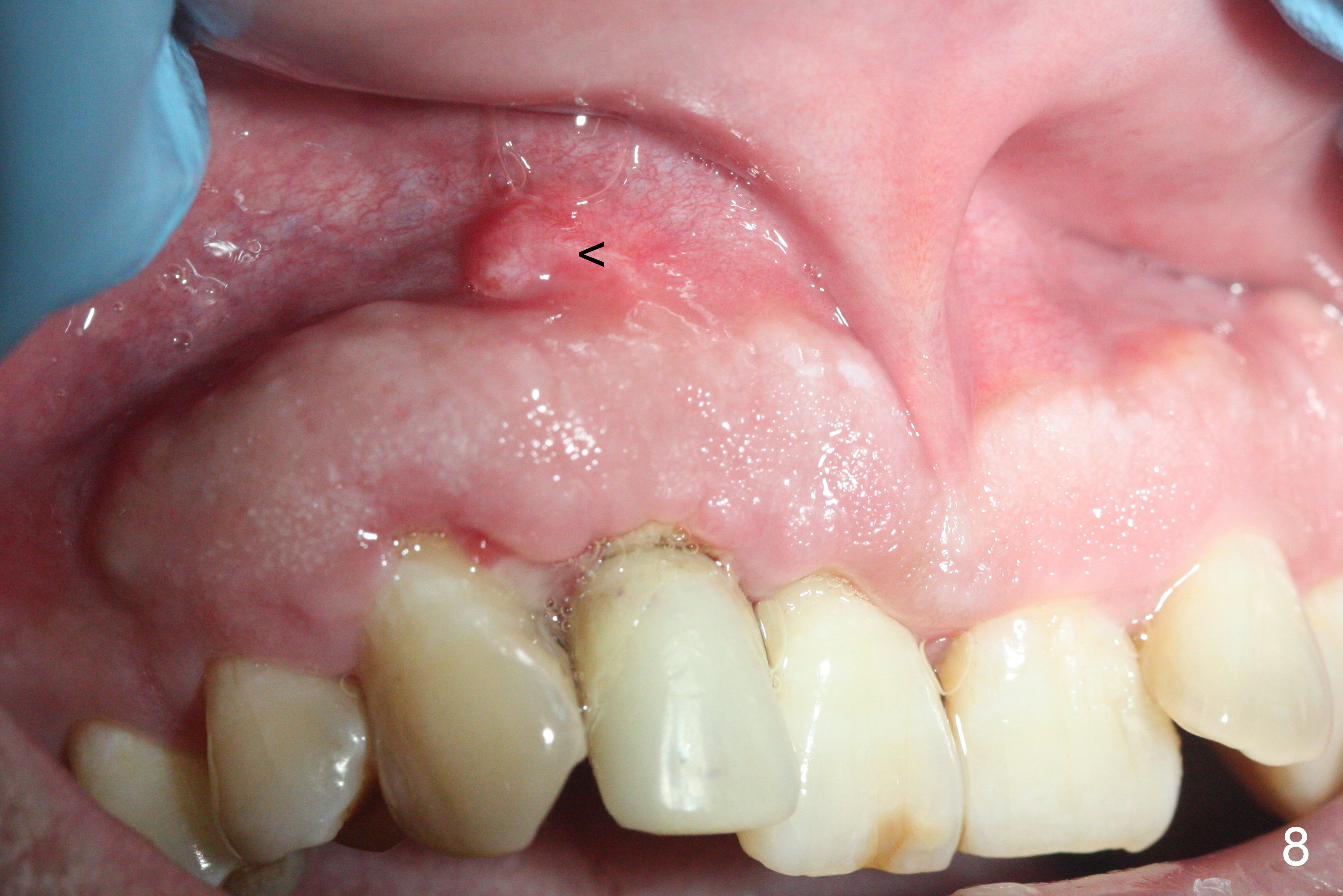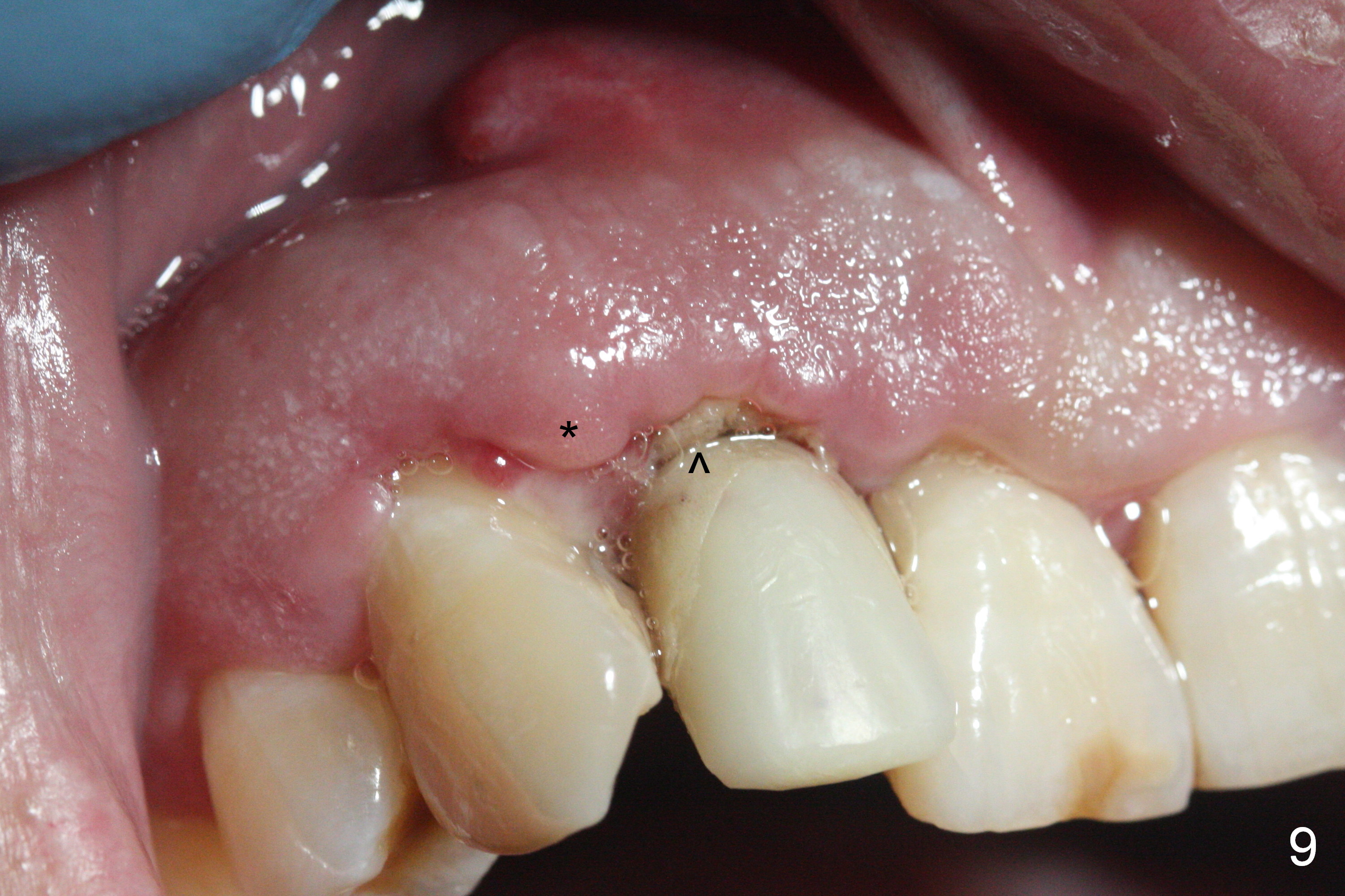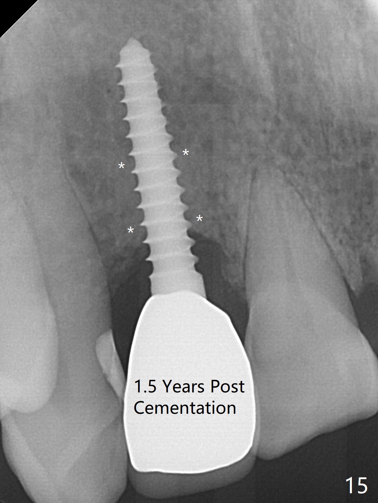 Sixteen days postop, the patient is doing fine, although the labial fistula has not disappeared (Fig.8 <). The detached distolabial papilla is healing (Fig.9 *) with mild bone graft exposure (^). The lacerated distopalatal papilla is also healing (Fig.10 *). These complications are related to flap surgery. The apical portion of the socket appears to have reduced 4 months postop (Fig.14). When the definitive restoration is delivered 5 months postop, there is gingival recession, including the distal of #8 (Fig.11 arrows, which is expected to improve over time) due to flap surgery. The labial plate collapse is minimal (Fig.12 *), while the palatal laceration (Fig.10) has healed (Fig.13). When the patient returns 1.5 years post cementation, there is increased bone density next to the coronal portion of the implant, equivalent to the bone graft (Fig.15 *). The fistula is absent (Fig.16). The crestal bone loss remains 2.5 years post cementation (Fig.17 *), although there is no sign of periimplantitis (magnification). Oral hygiene is poor. There is no change in the soft (gingival recession; data not shown) or hard tissues 3 years 8 months post cementation (Fig.18).