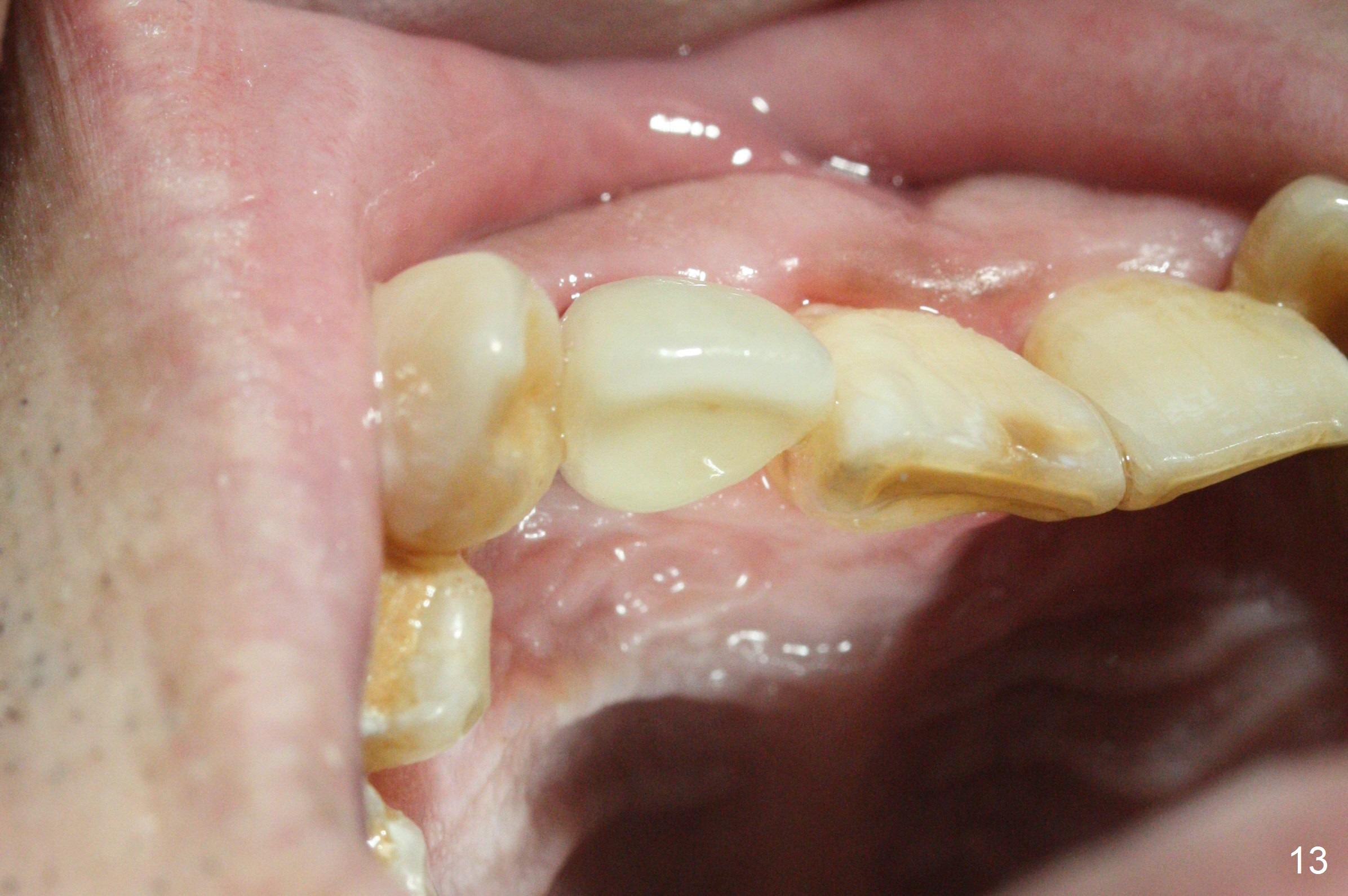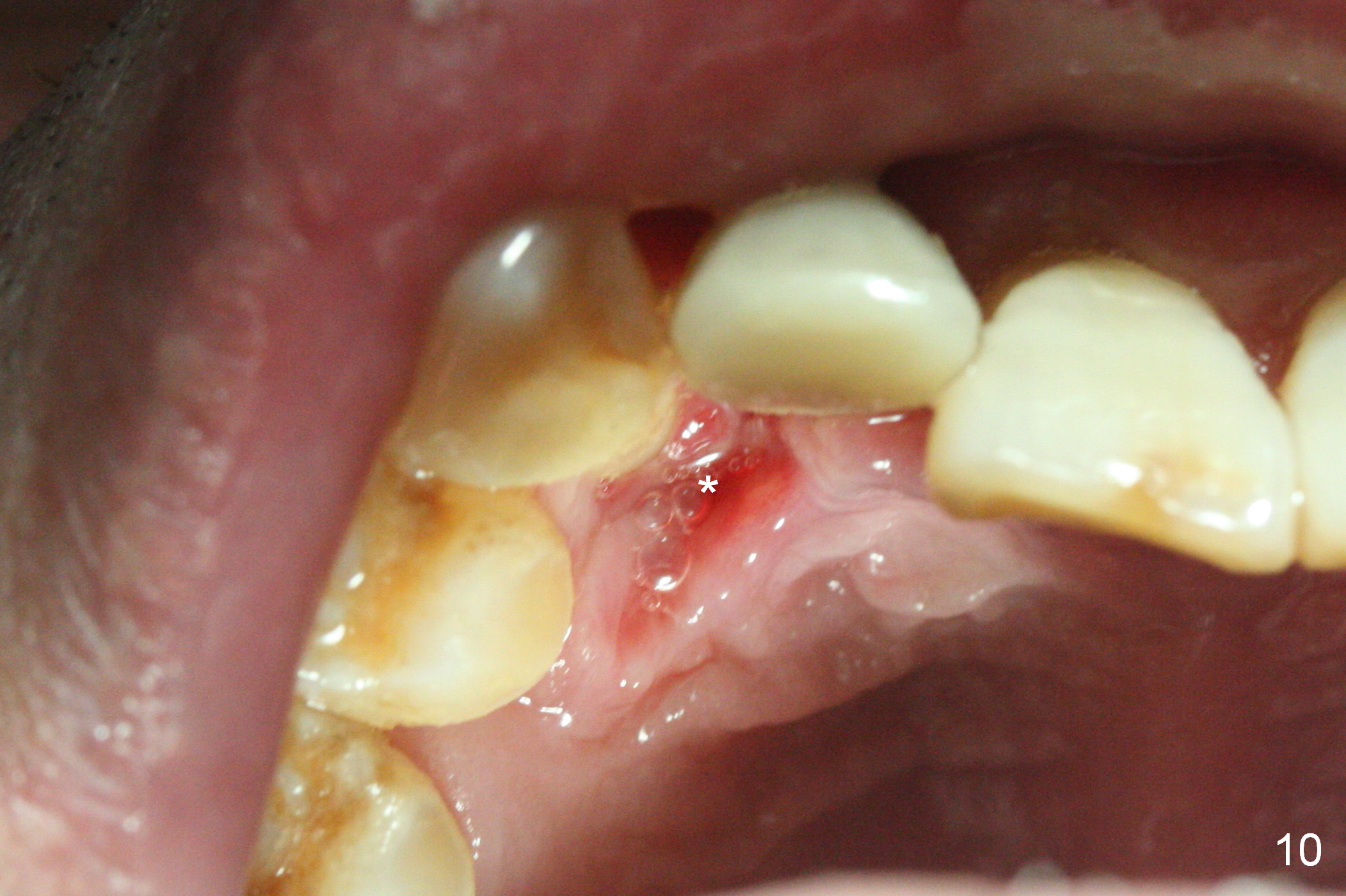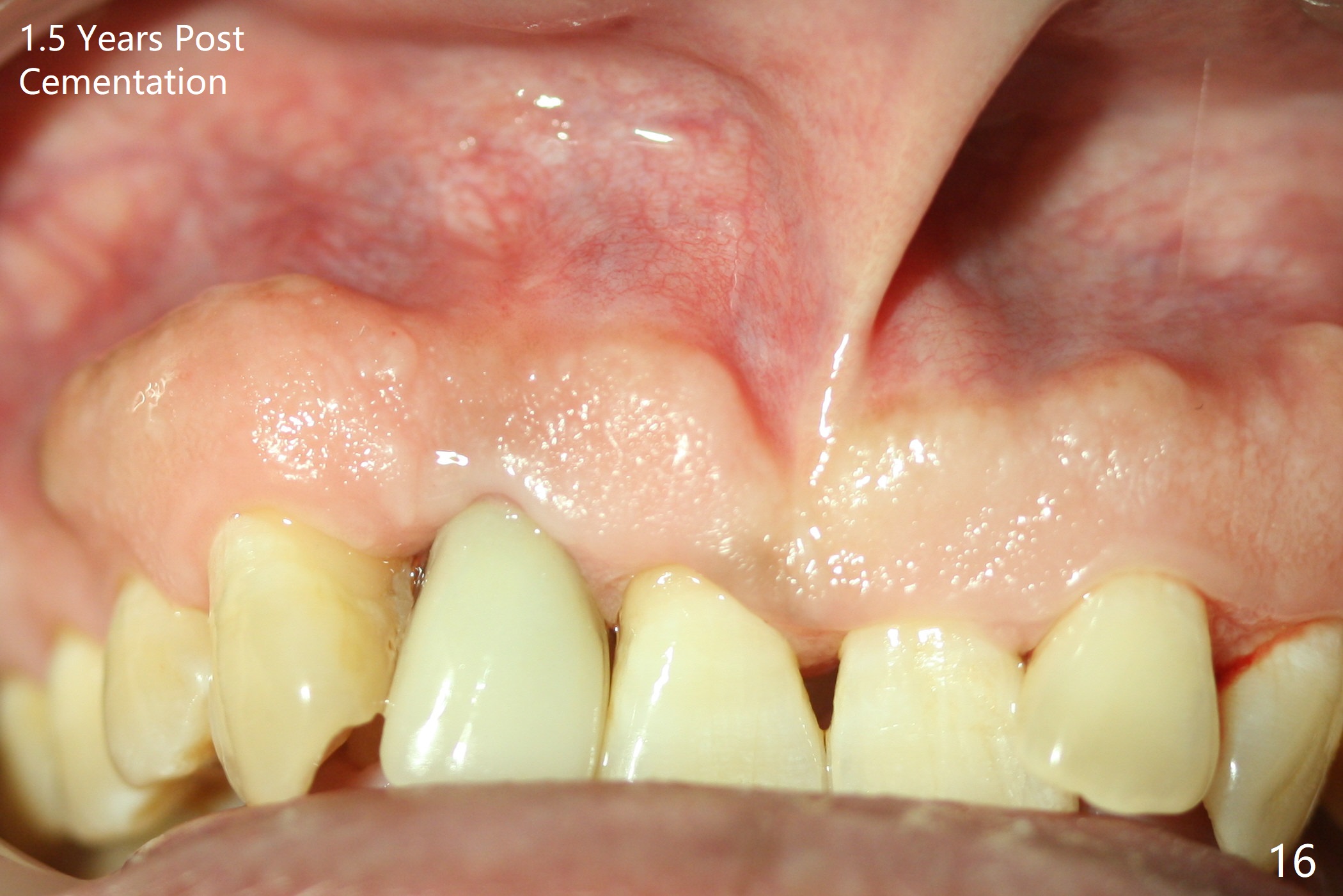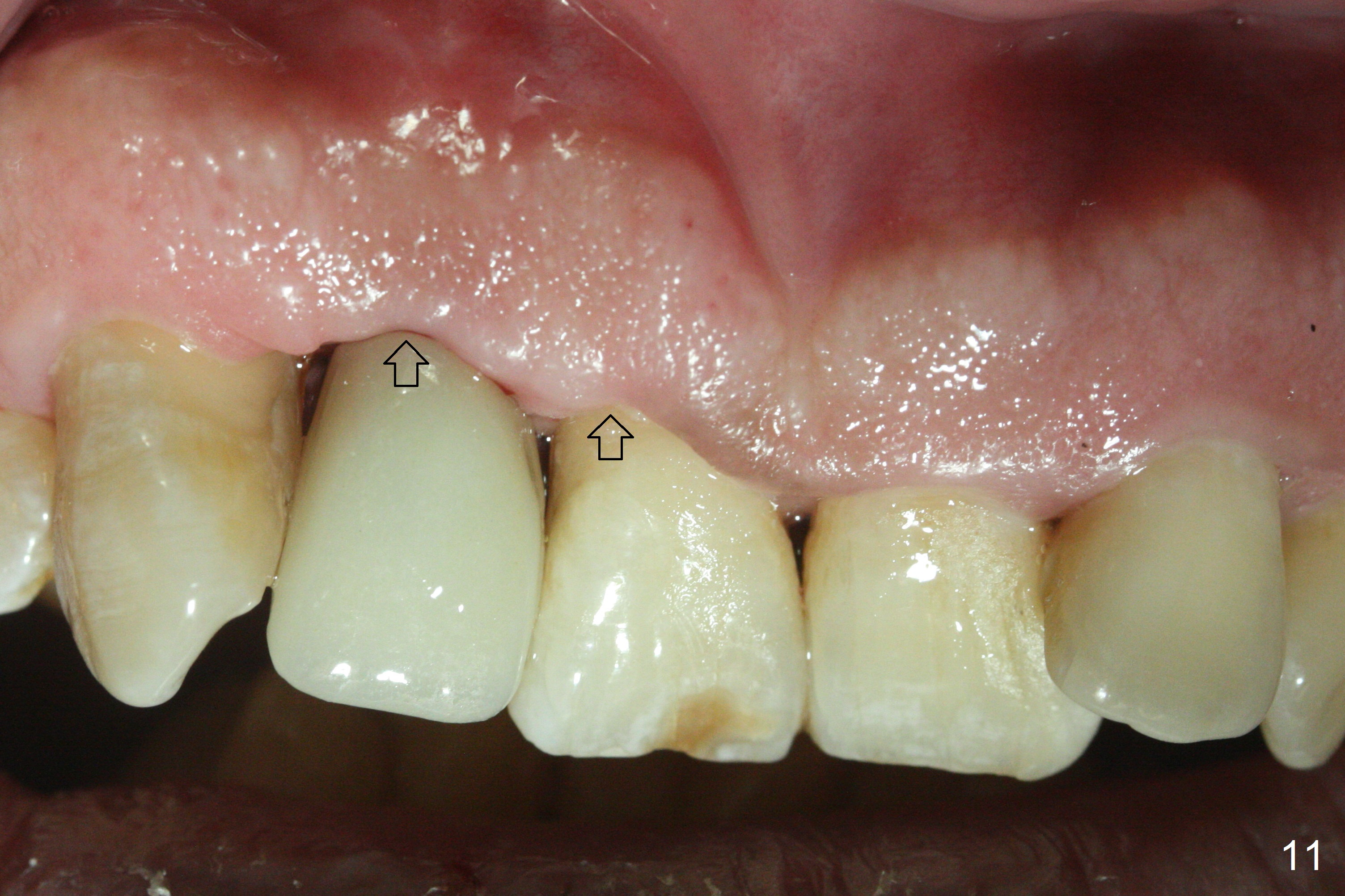 Sixteen days postop, the patient is doing fine, although the labial fistula has not disappeared (Fig.8 <). The detached distolabial papilla is healing (Fig.9 *) with mild bone graft exposure (^). The lacerated distopalatal papilla is also healing (Fig.10 *). These complications are related to flap surgery. The apical portion of the socket appears to have reduced 4 months postop (Fig.14). When the definitive restoration is delivered 5 months postop, there is gingival recession, including the distal of #8 (Fig.11 arrows, which is expected to improve over time) due to flap surgery. The labial plate collapse is minimal (Fig.12 *), while the palatal laceration (Fig.10) has healed (Fig.13). When the patient returns 1.5 years post cementation, there is increased bone density next to the coronal portion of the implant, equivalent to the bone graft (Fig.15 *). The fistula is absent (Fig.16). The crestal bone loss remains 2.5 years post cementation (Fig.17 *), although there is no sign of periimplantitis (magnification). Oral hygiene is poor. There is no change in the soft (gingival recession; data not shown) or hard tissues 3 years 8 months post cementation (Fig.18).