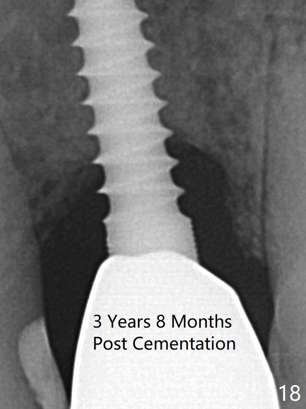 The peri-implant space (Fig.3) is filled with bone graft (Fig.4 *). The apical portion of the socket appears to have reduced 4 months postop (Fig.14). When the patient returns 1.5 years post cementation, there is increased bone density next to the coronal portion of the implant, equivalent to the bone graft (Fig.15 *). The crestal bone loss remains 2.5 years post cementation (Fig.17 *), although there is no sign of periimplantitis. Oral hygiene is poor. There is no change in the soft or hard tissues 3 years 8 months post cementation (Fig.18).