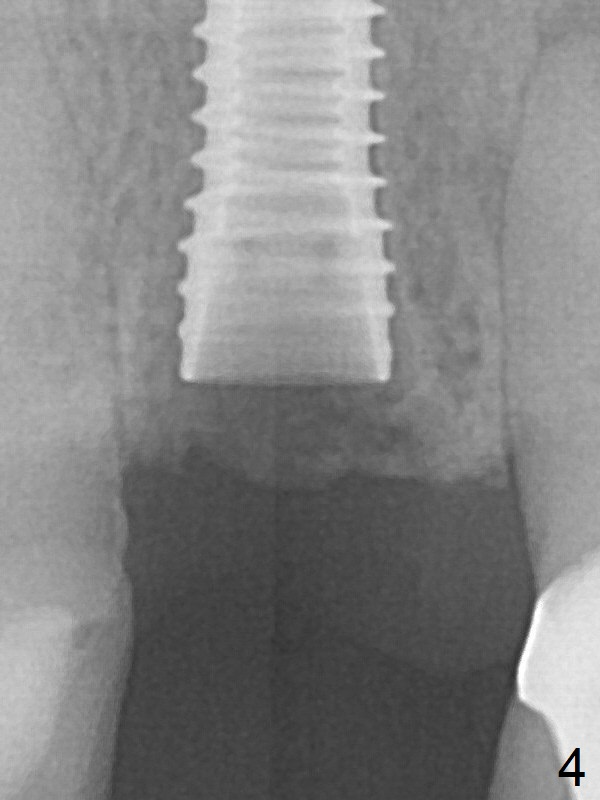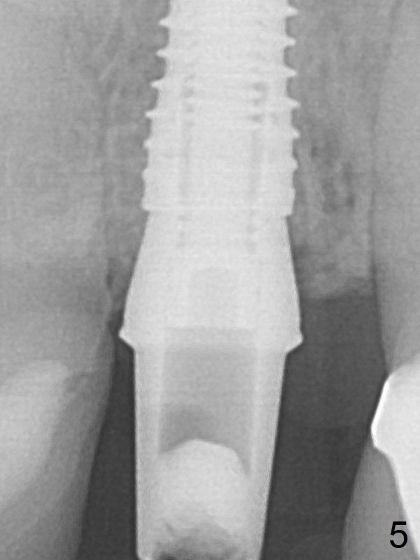 A 3.8x16 mm implant is placed (Fig.4 (with 2 mm buccal gap)) at the level as planned (Fig.2). Insertion torque is acceptable. After placing a 4.5x5(3) mm gold-coated abutment and allograft (Fig.5), an immediate provisional is fabricated (the existing crown is lost). The patient is pleased with the quick, painless procedure.