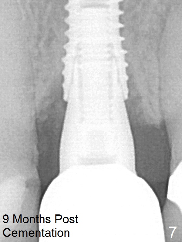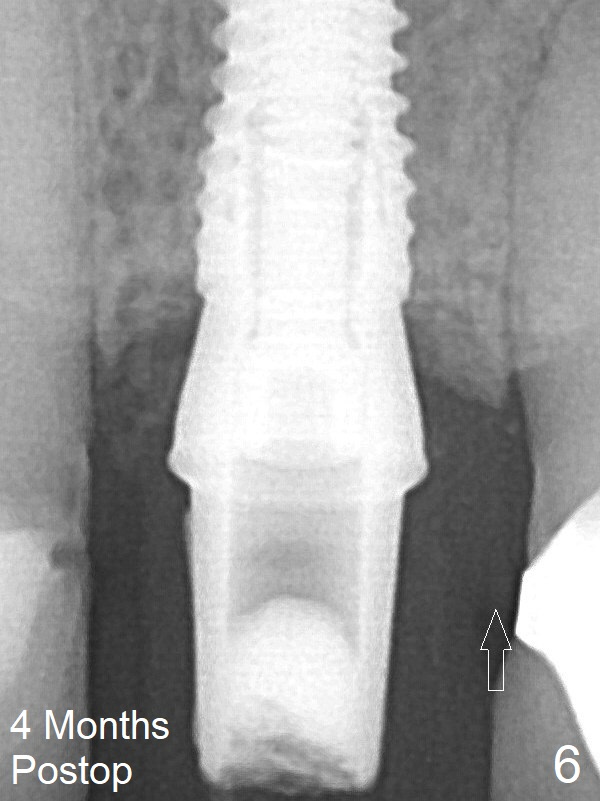 She returns for impression 4 months postop; the abutment margin is substantially subgingival (Fig.6 arrow). The abutment is changed to 4.5x4(4) mm one before impression. There is no bone resorption 9 months post cementation (14 months postop, Fig.7).