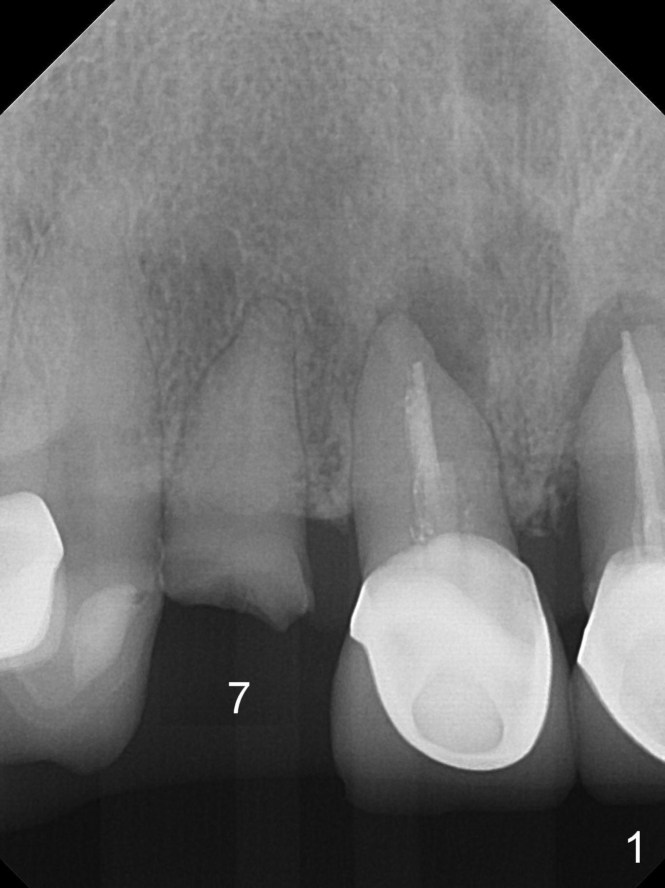 A 60-year-old woman has multiple restoration and no lower posterior teeth (replaced with RPD). The tooth #7 fractures (Fig.1). When an immediate implant is placed (Fig.2, no Antibiotic) with immediate provisional (using the existing crown), occlusal clearance is critical. Check overbite often and take photos. If the root seems to be ankylosed, socket shield will be performed.