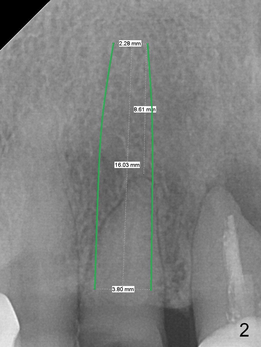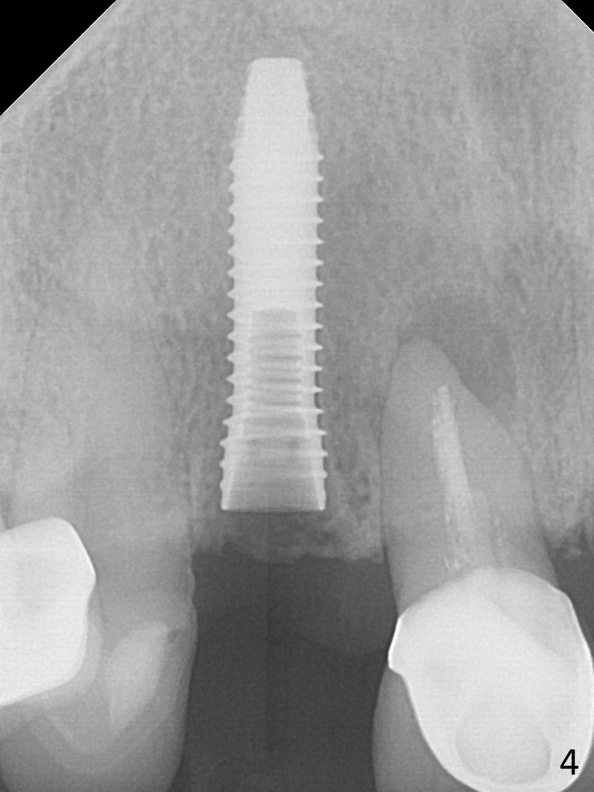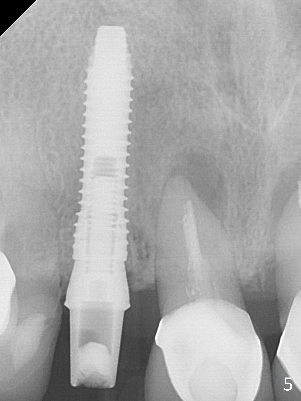 In fact the residual root (Fig.3) is easy to remove. A 3.8x16 mm implant is placed (Fig.4 (with 2 mm buccal gap)) at the level as planned (Fig.2). Insertion torque is acceptable. After placing a 4.5x5(3) mm gold-coated abutment and allograft (Fig.5), an immediate provisional is fabricated (the existing crown is lost). The patient is pleased with the quick, painless procedure.
