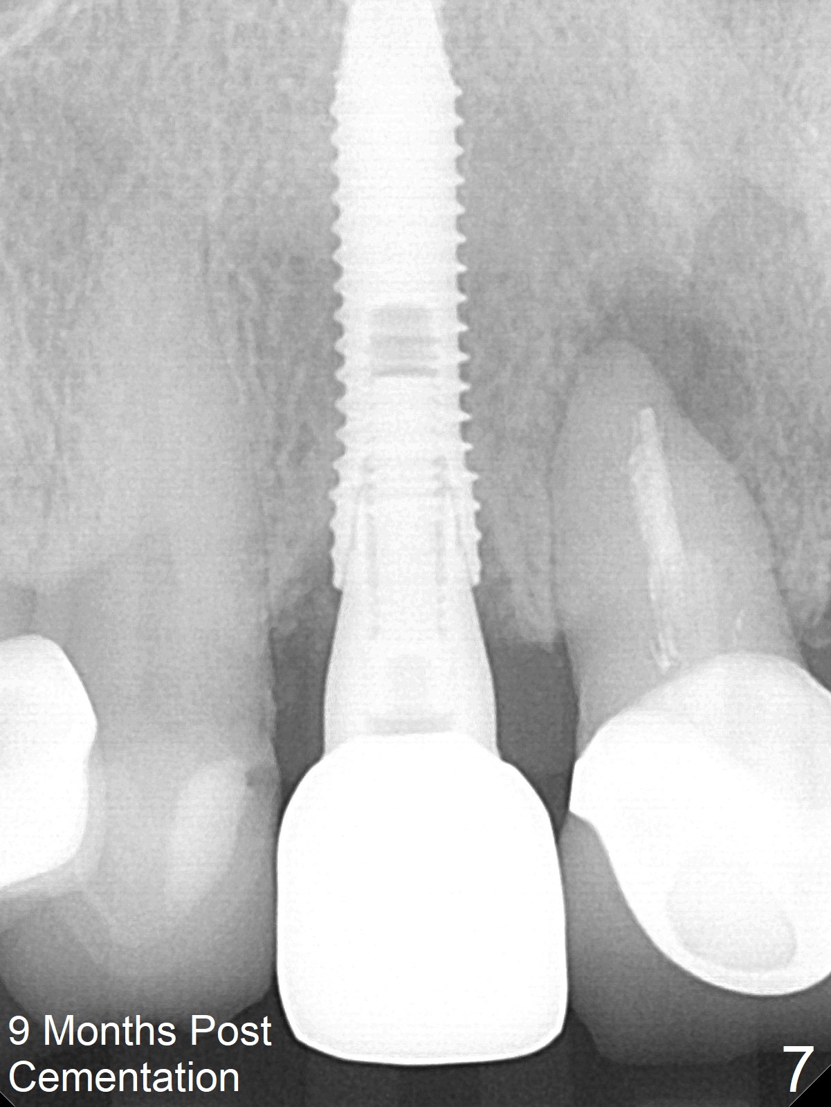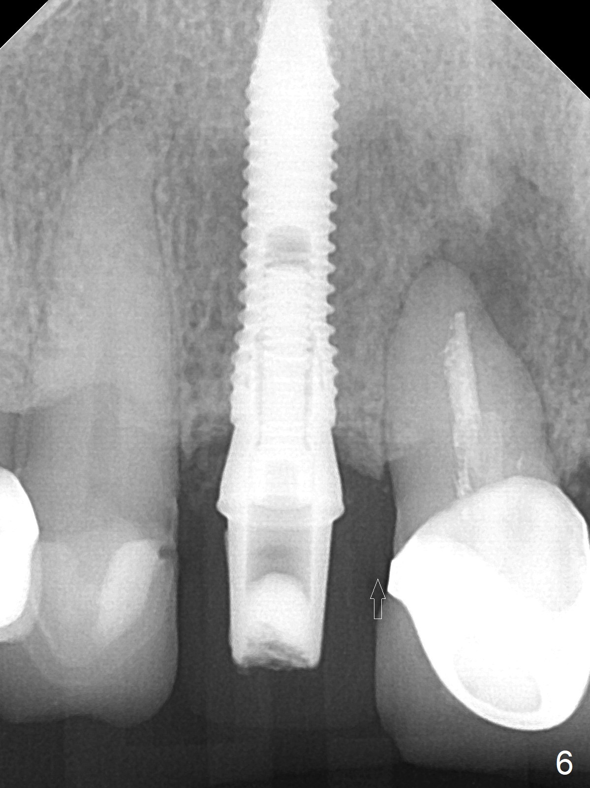 She returns for impression 4 months postop; the abutment margin is substantially subgingival (Fig.6 arrow). The abutment is changed to 4.5x4(4) mm one before impression. There is no bone resorption 9 months post cementation (Fig.7).