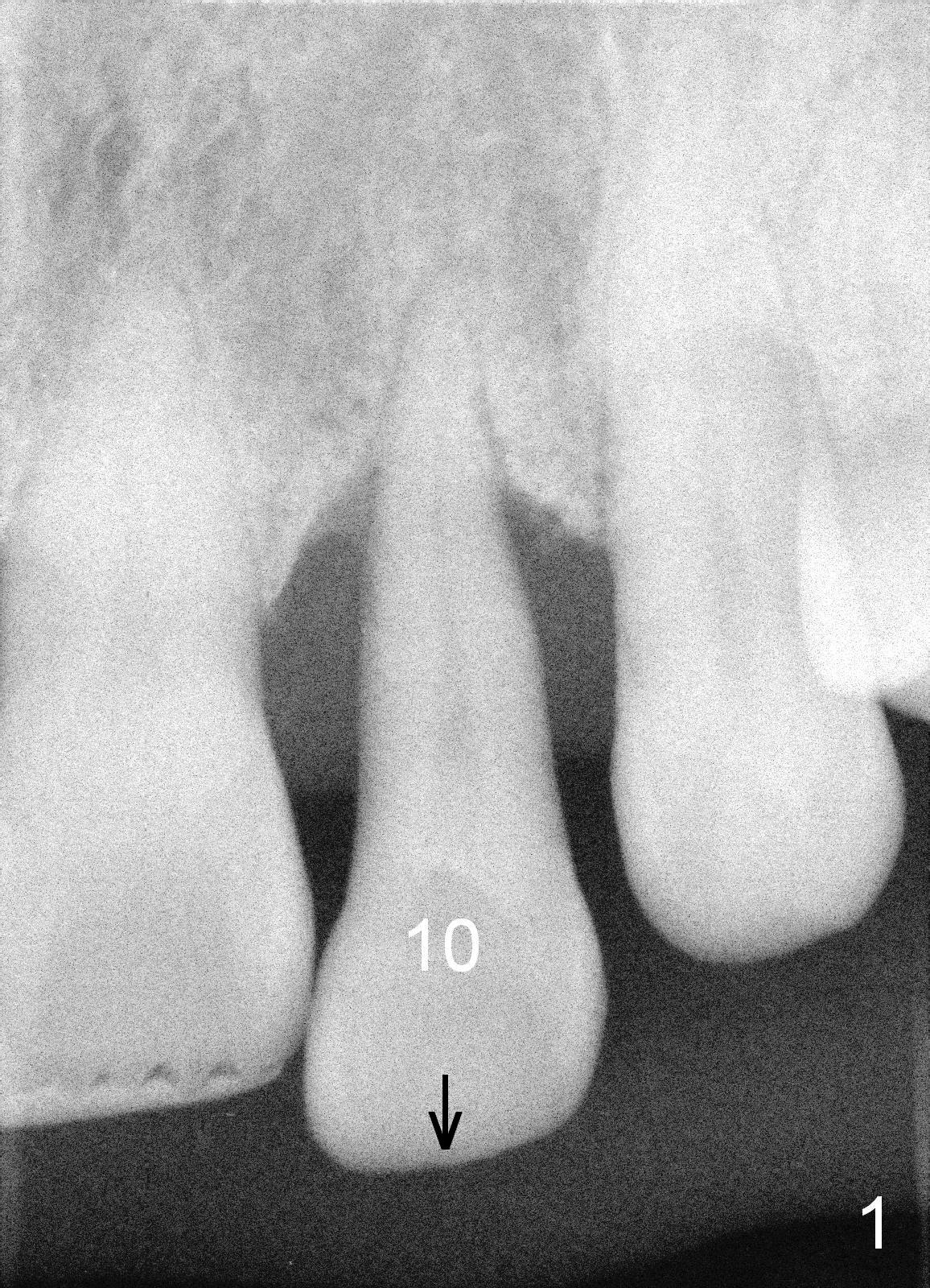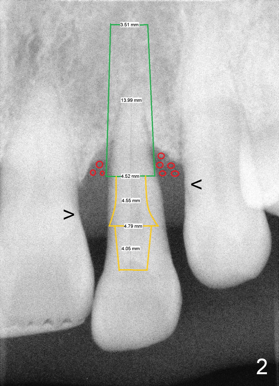 A 46-year-old lady has severe chronic periodontitis. The tooth #10 has drifted inferiorly and labially (Fig.1). One month and a half after #31 immediate implant, she wants to take care of #10. After extraction, measure the socket and tooth dimension. The implant (green box in Fig.2) diameter should be at least 2 mm smaller than the buccopalatal width of the socket. The platform of the implant should be 2-3 mm superior to the CEJ (cementoenamel junction (arrowheads)) of the neighboring teeth. The exposed implant threads will be covered by bone graft (red circles). Since the gingiva is thick (coronoapically), the abutment (gold color) cuff is expected to be 3-4 mm.