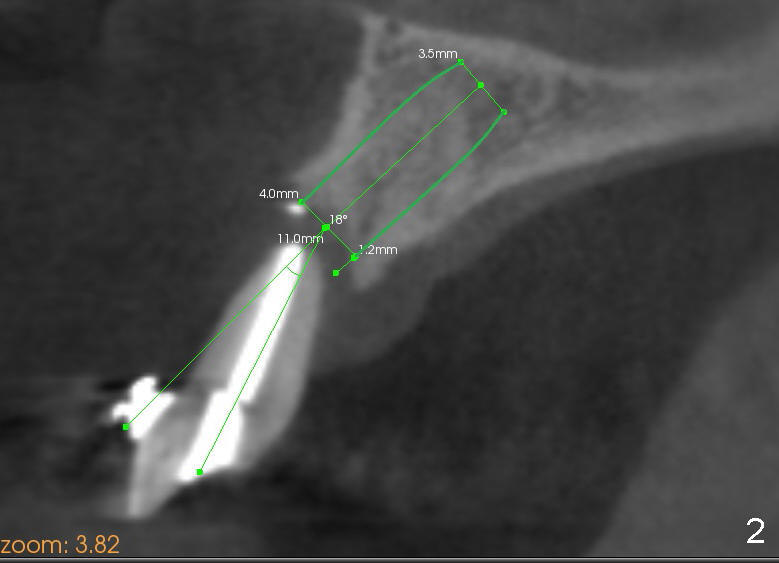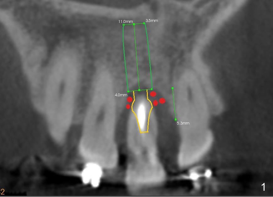 The tooth #8 of a 46-year-old lady has an endo-perio disease, complicated by occlusal trauma (Fig.1 (sagittal), 2 (coronal) CT sections).