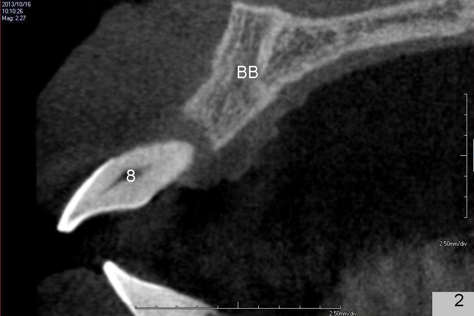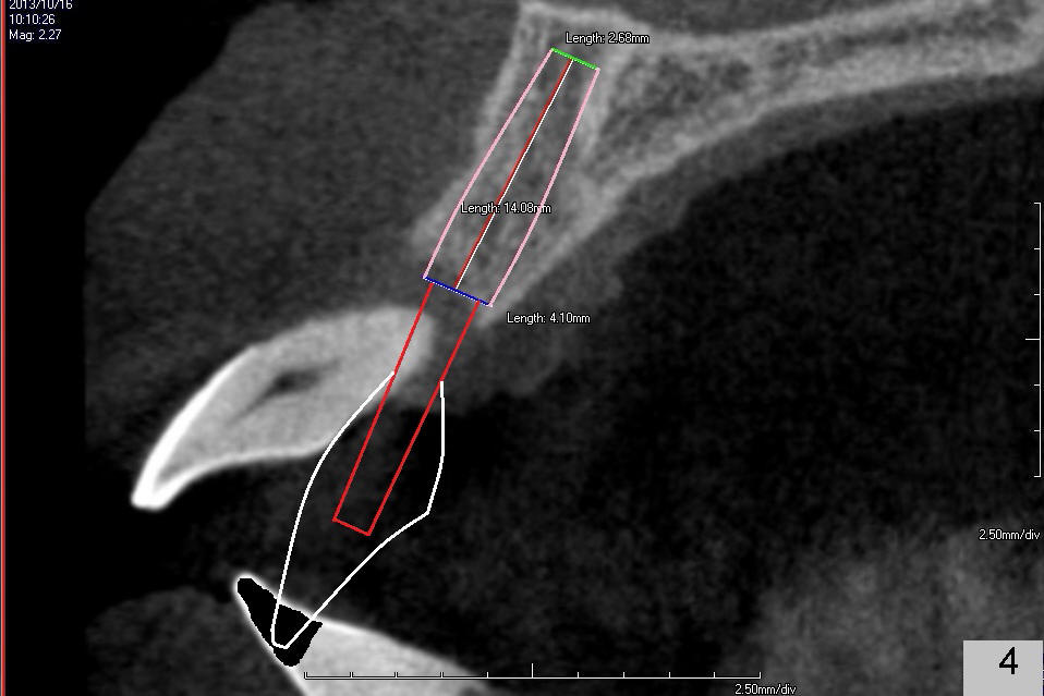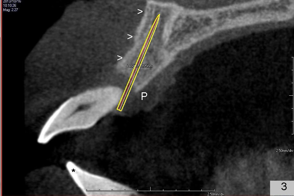 A 49-year-old man has severe chronic periodontitis. The upper central incisors are protrusive and mobile (Fig.1,2: #8,9), but the basal bone is wide and tall (BB in Fig.2). Immediate implants are going to be placed. To avoid malpositioning of the implant, initial osteotomy begins close to the palatal plate (Fig.3: P), while the axis of the osteotomy is parallel to and close to the buccal plate (>). The implant (Fig.4 pink), abutment (red) and the crown (white) will be in a favorable trajectory. To reduce protrusion, the incisal edge of the lower central will be trimmed (compare Fig.3 * and Fig.4 black area).