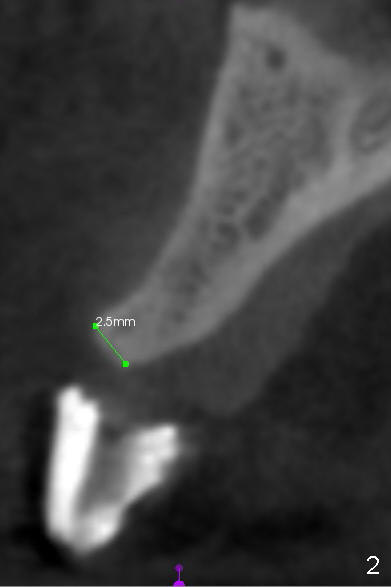 A 48-year-old lady requests fixed prosthesis at the site of #7, which is atrophic (Fig.1 CT coronal section), 2.5 mm wide (Fig.2). This CT image suggests that the bone density is moderate to high. Implant placement at the site of #14 confirms the bone density.