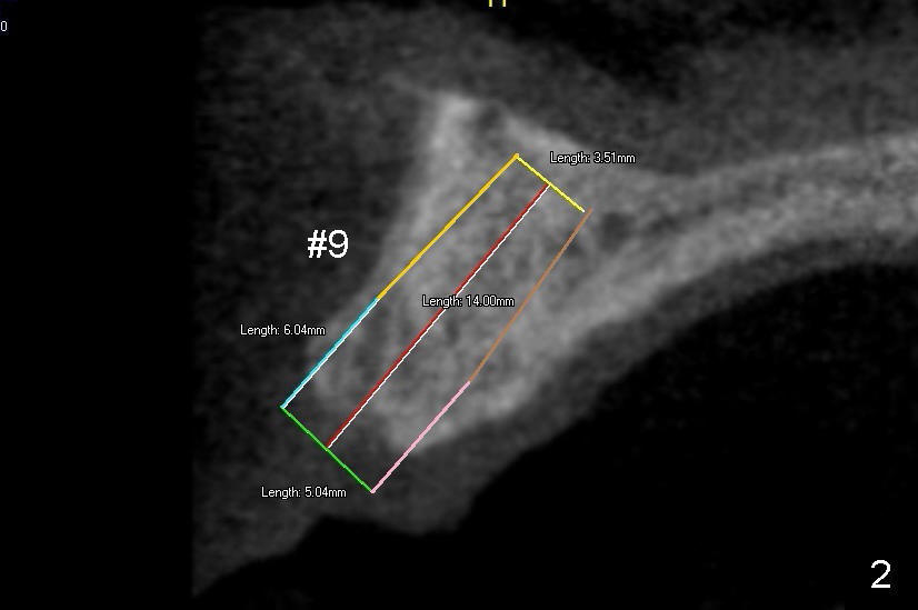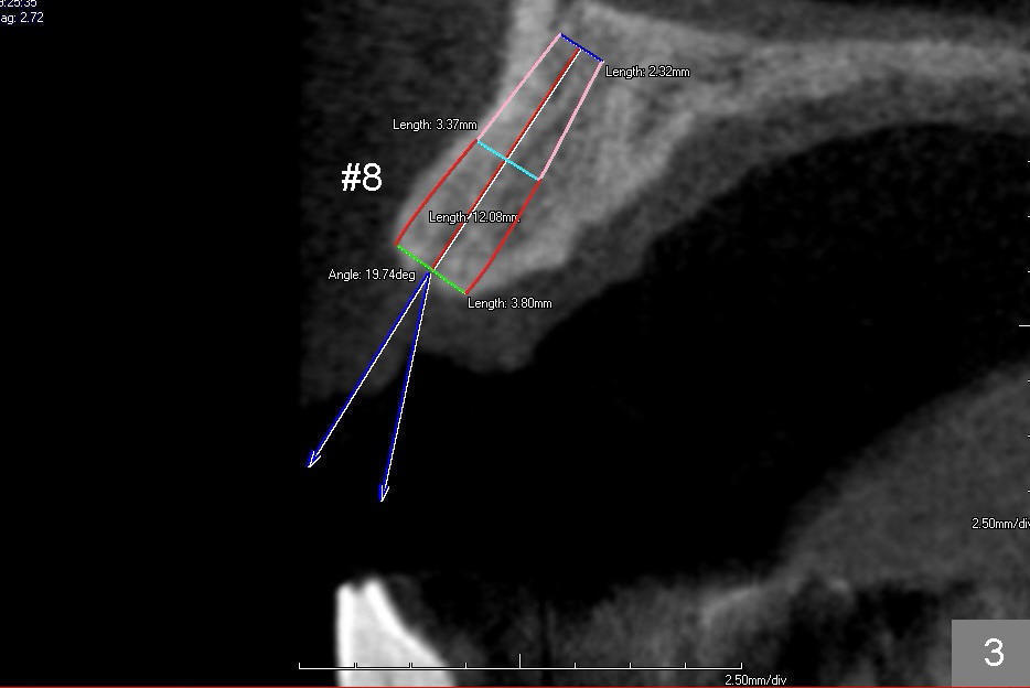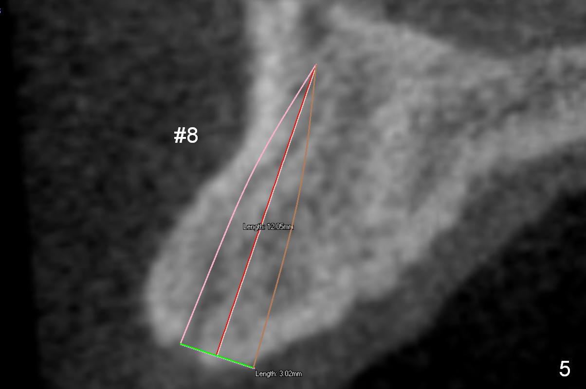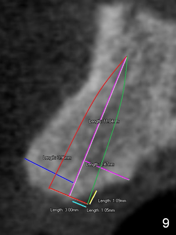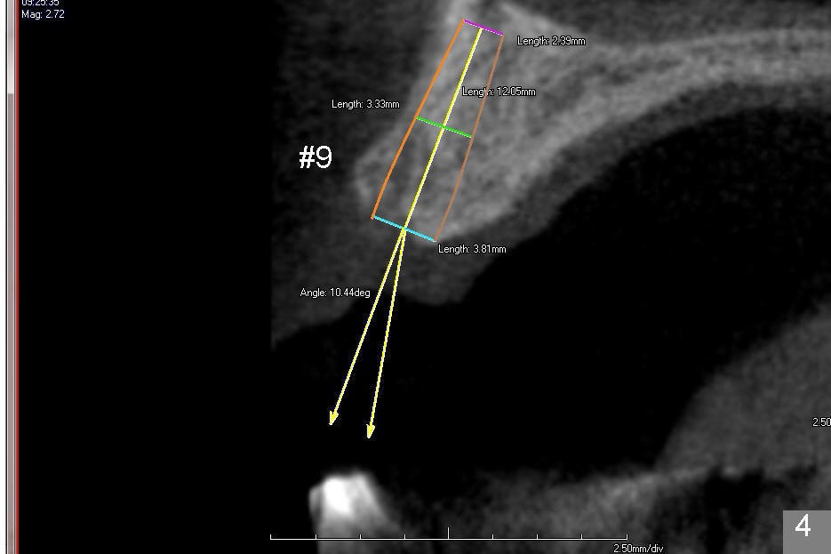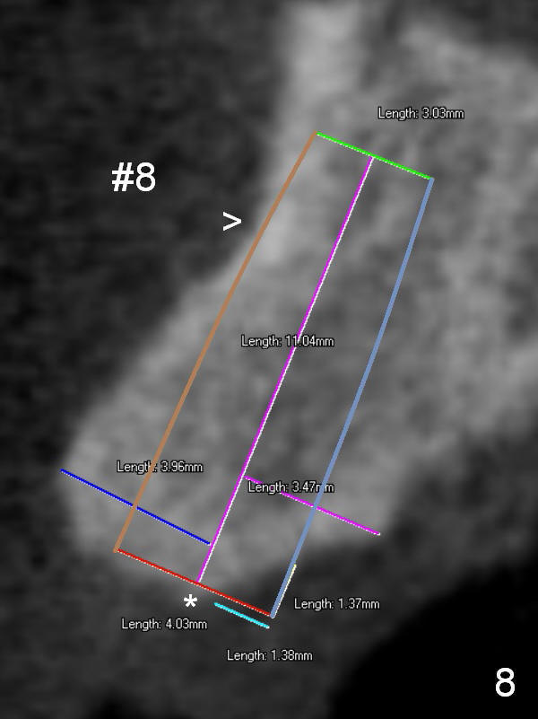 For the best trajectory, osteotomy at #8 should be initiated as palatally as possible (Fig.8 *). When a 4x11 mm 2-piece implant is placed, there is possibility that the apical buccal plate may be perforated (>). In contrast, a 3x11 mm 1-piece implant is more skinny with less coronal palatal thread exposure (Fig.9). The latter will be covered with bone graft and collagen dressing.