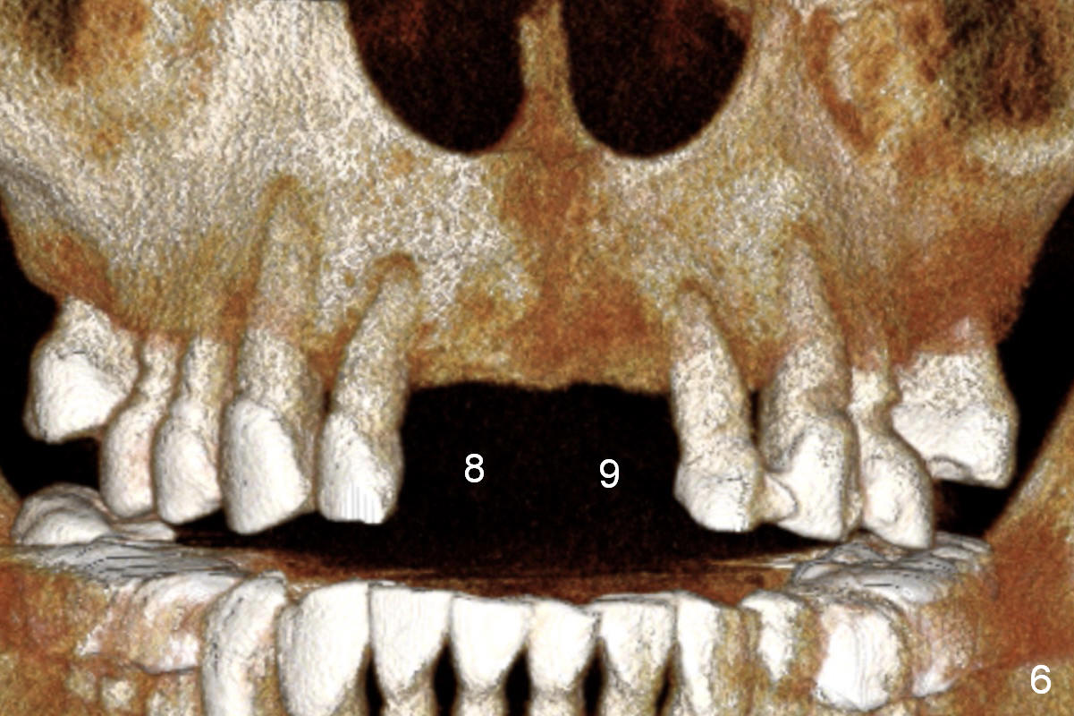 There are two types of implant design for the upper central incisors. The first one is to place implants as large as possible (Fig.1,2), i.e., place the implants in the middle of the alveolar bone, irrespective of the occlusion with the opposing.