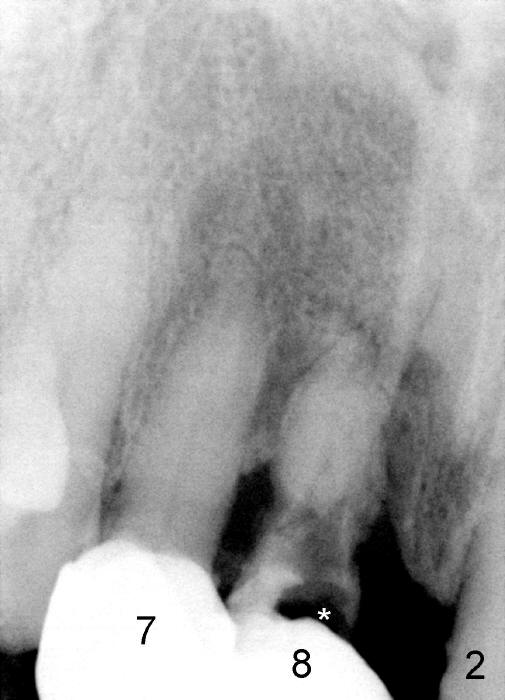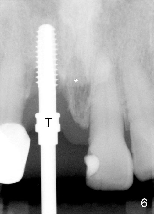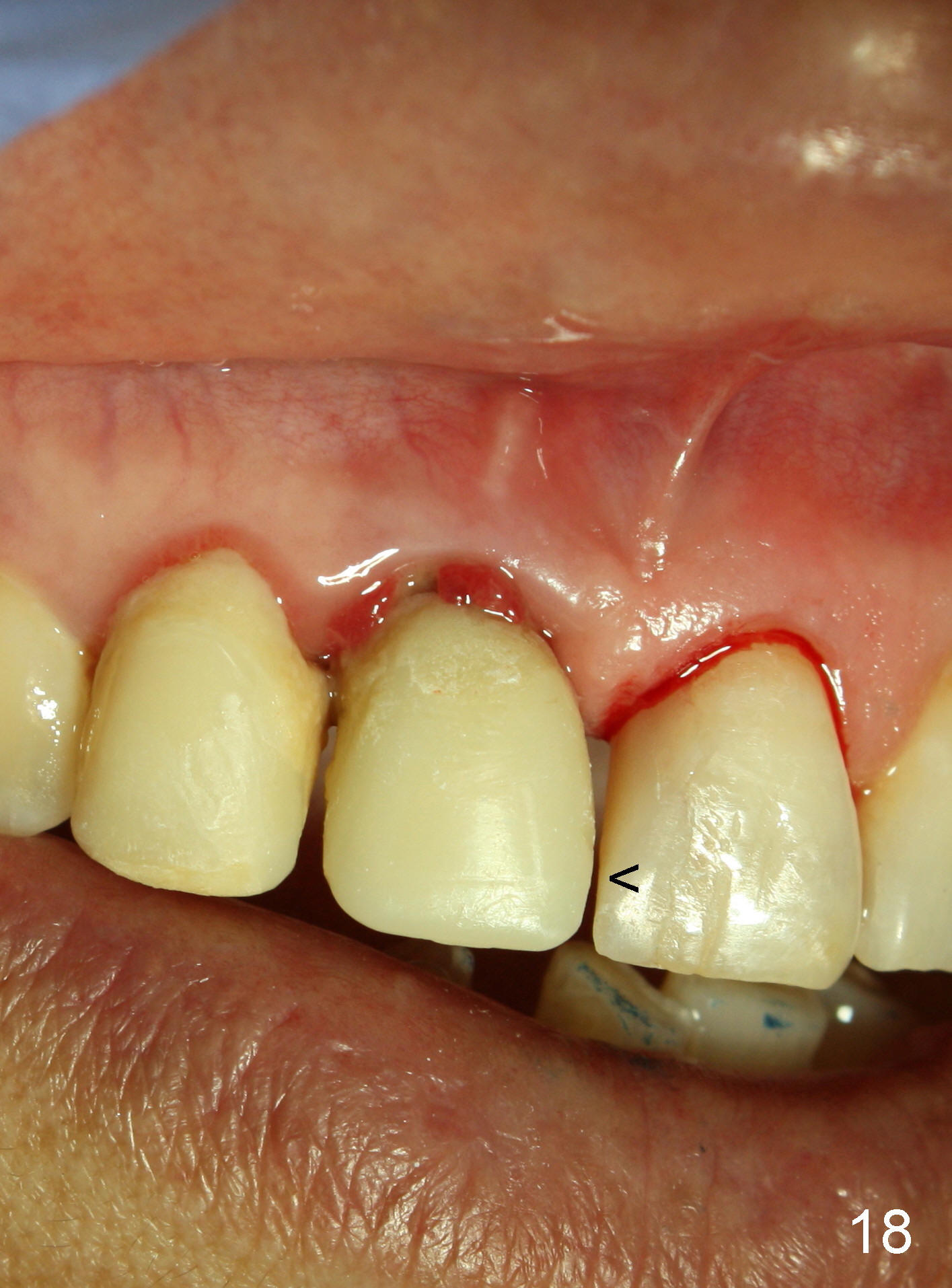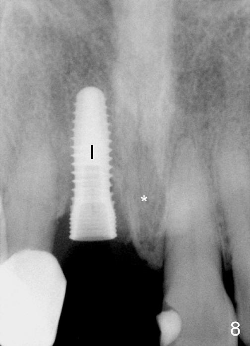 Four-month follow up shows that bone graft from the tuberosity appears to have healed with the implant microthreads (Fig.17 *); there is a diastema between #8 and 9 (arrowheads). Before removal of the provisionals of #7 and 8 for final impression, new composite is added to the mesial surface of #9 as the first step of closure of the diastema (Fig.18 <).