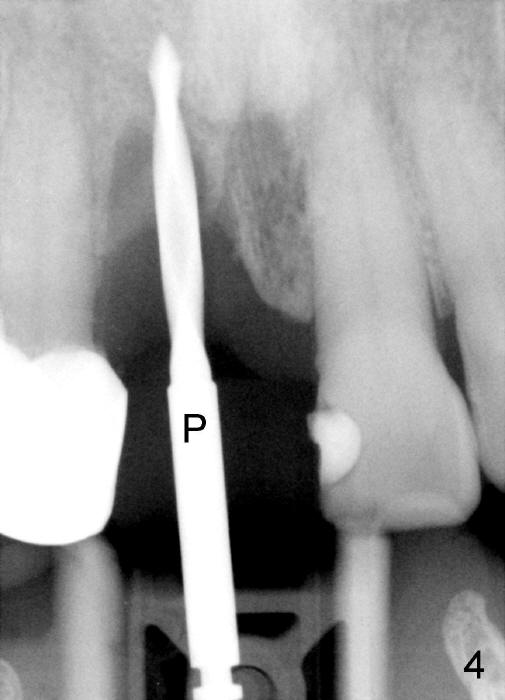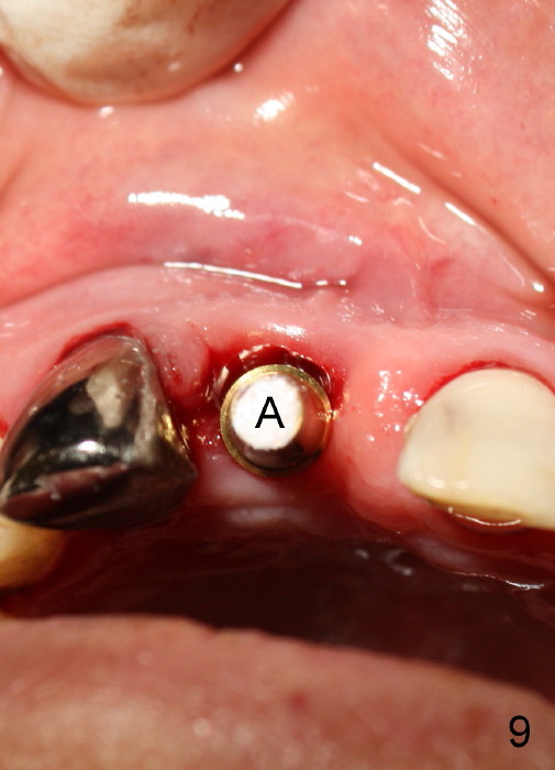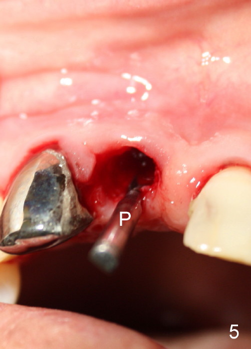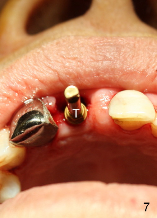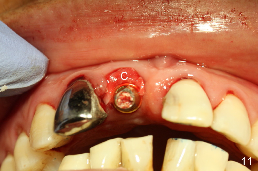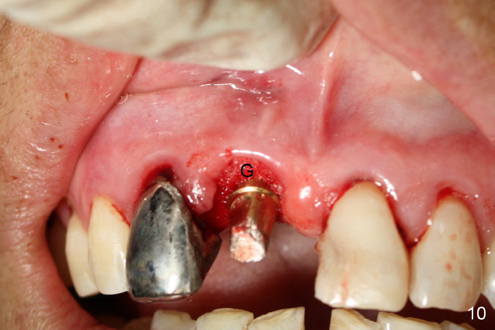 A 64-year-old lady requests replacing #7 and 8 crowns (Fig.1,2). When #8 is extracted, the labial plate is found to be missing (Fig.3). Following 2 mm pilot drill (Fig.4,5 P), 3.8 mm tap drill (Fig.6,7 T) and 4.5x14 mm implant (Fig.8 I) and 4.8 mm abutment (Fig.9 A), corticocancellous bone is harvested from the left tuberosity and placed in the labial gap of the socket (Fig.10 G). Collagen dressing is placed over the bone graft (Fig.11 C). The former is secured in place by an immediate provisional (P).