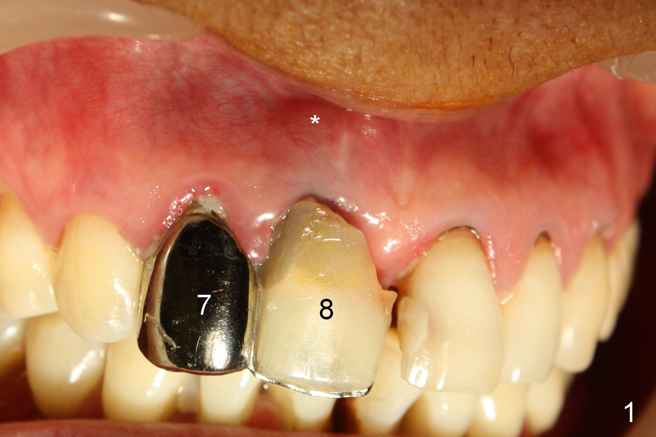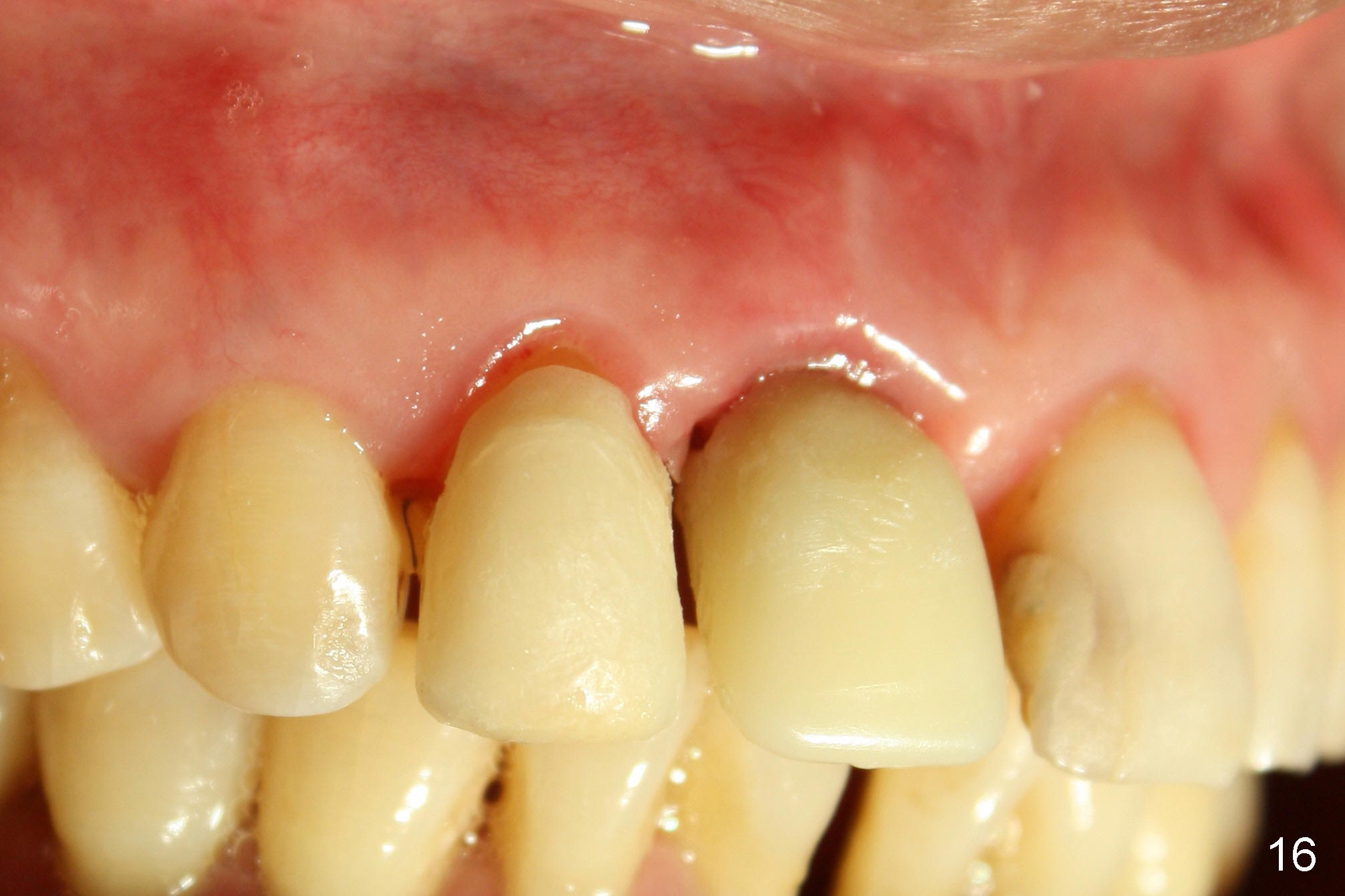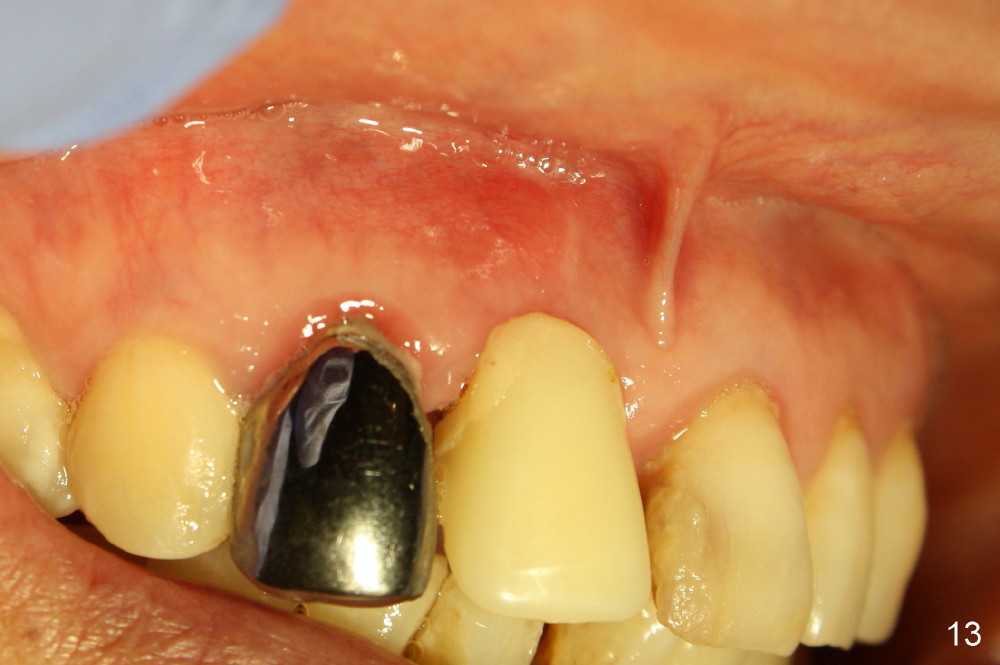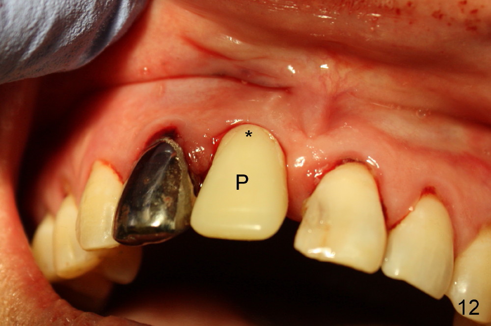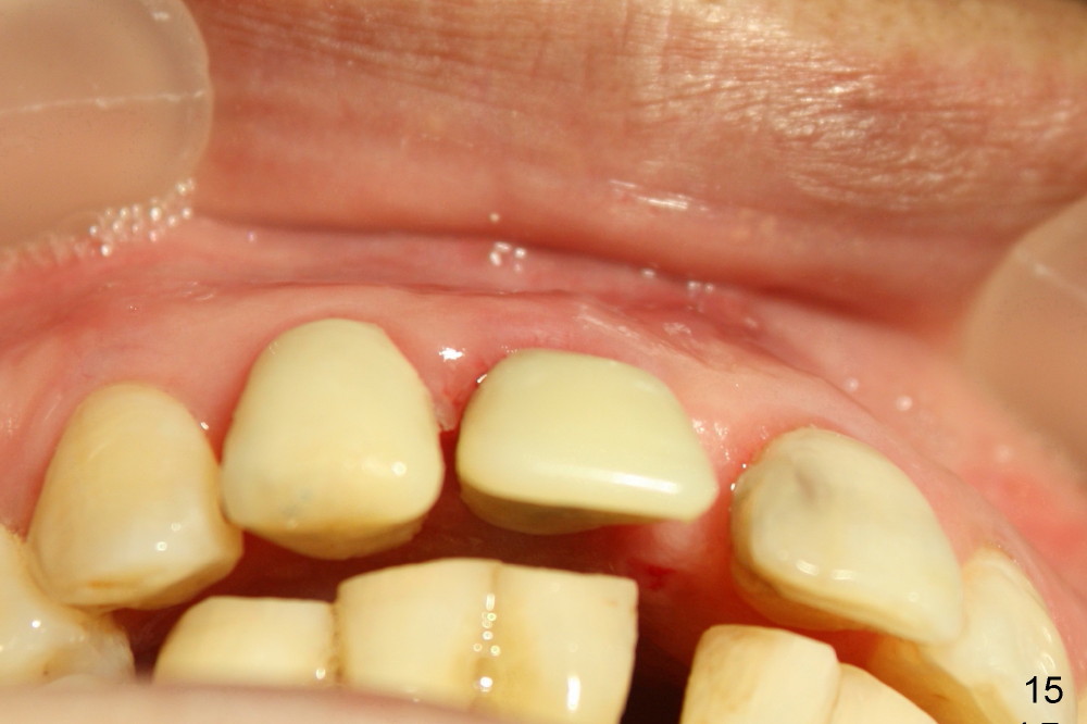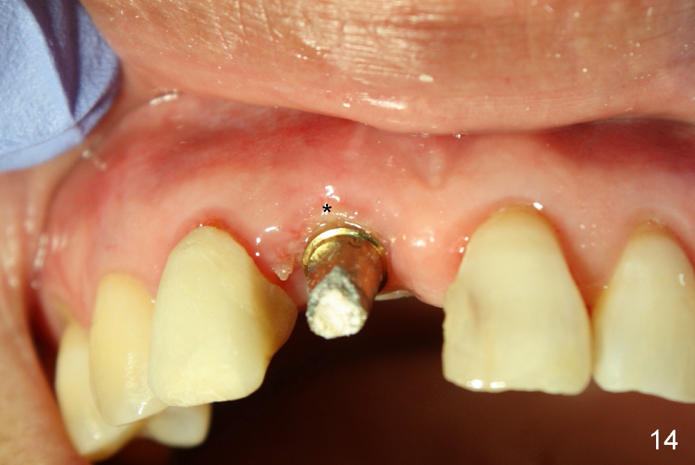 The patient returns for follow up 8 days postop and the labial margin of the provisional looks long. The metal crown is changed to a provisional at the visit. Eight days later, the provisional at the site of #8 is removed for labial margin trimming; the labial gingiva heals (Fig.14 *). The labial plate remains slightly convex (Fig.15). The labial margin of the provisional at the site of #8 is at the same level of that of #9.