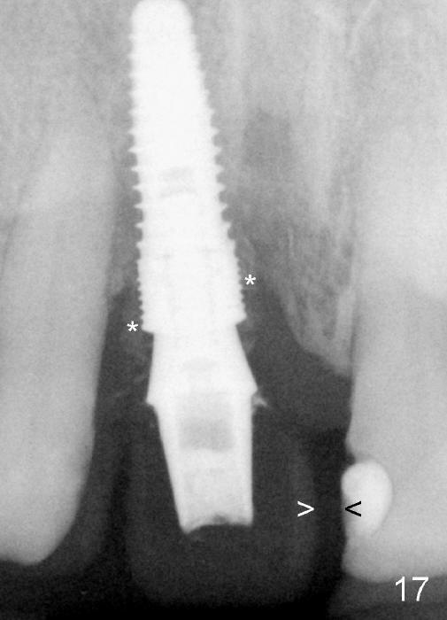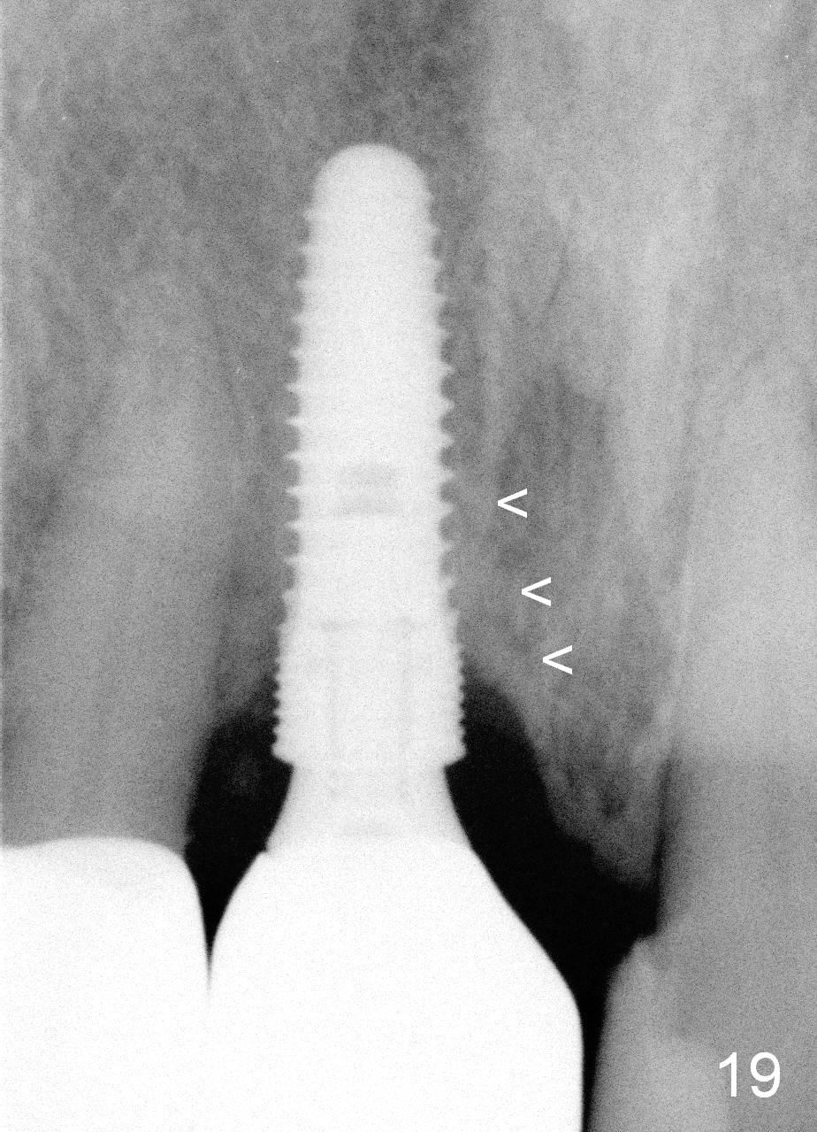 One year post cementation, there is cortical bone formation mesial to the implant (Fig.19 <). Buccal concavity is minimal (Fig.20).