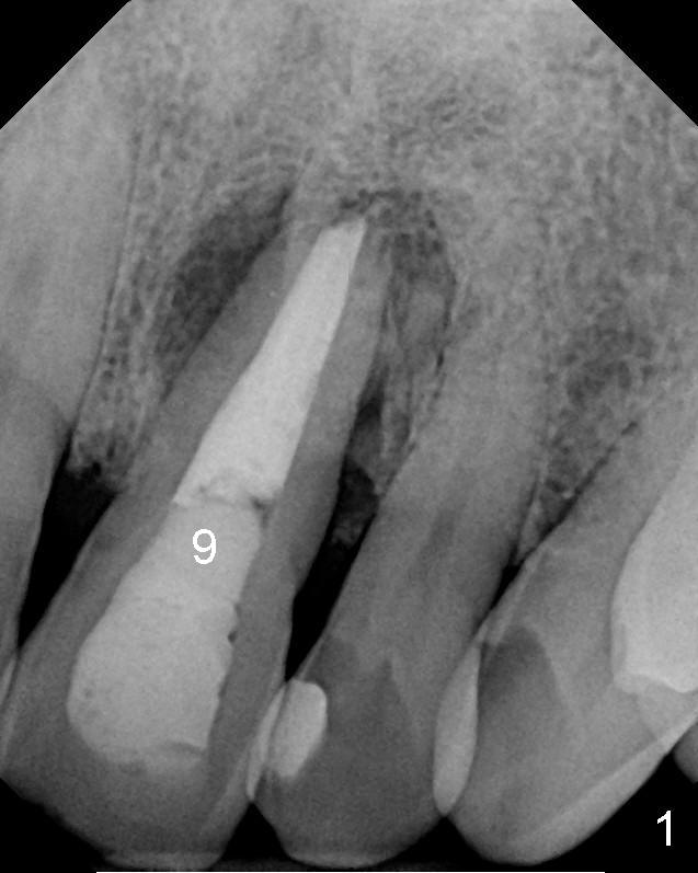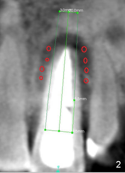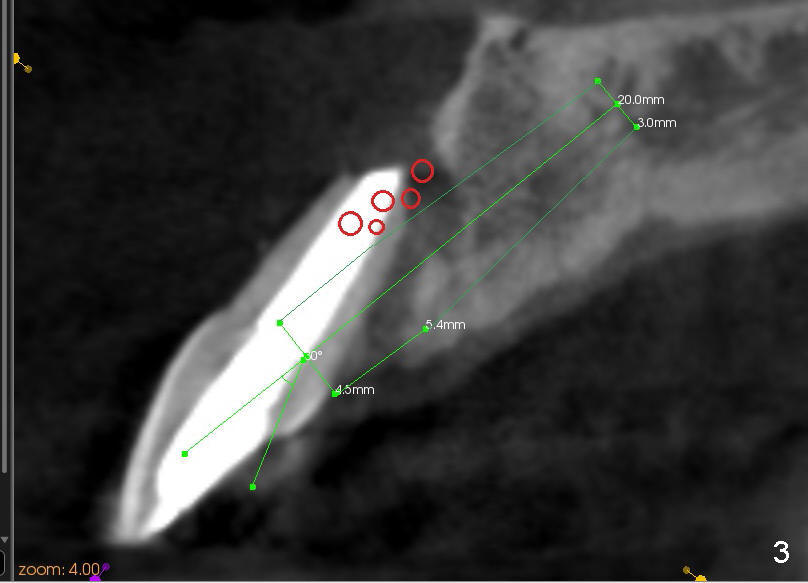 The 46-year-old patient is pleased with previous implant placement. Preop PA shows severe periapical radiolucency of the tooth #9 (Fig.1). CBCT confirms the lesion extent (Fig.2,3). It appears that the labial plate is completely lost (Fig.3). A long implant is indicated. Due to insertion into the palatal bone, an angled abutment is anticipated (20 or 30°). Prior to implant placement, bone graft is placed to the apical half of the socket (mesial and distal (Fig.2) and labial (Fig.3 red circles). How does it get done?