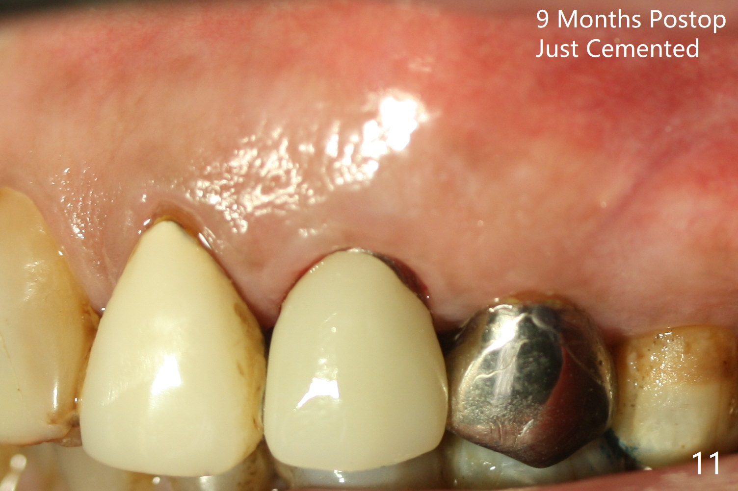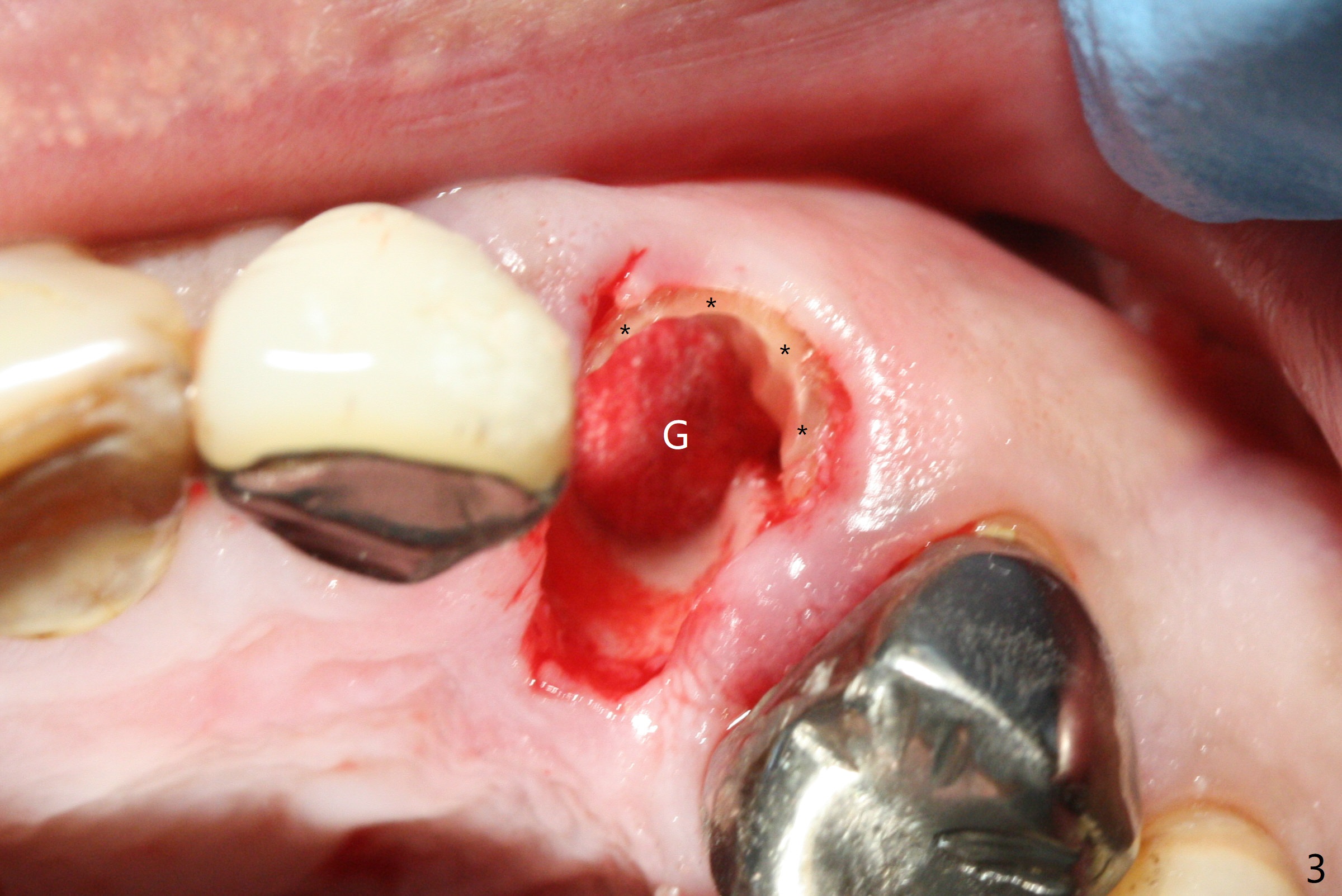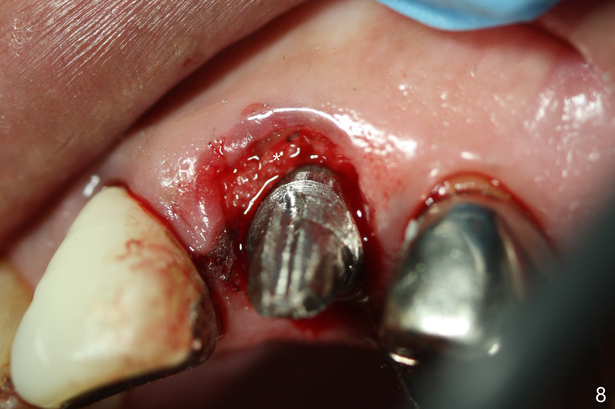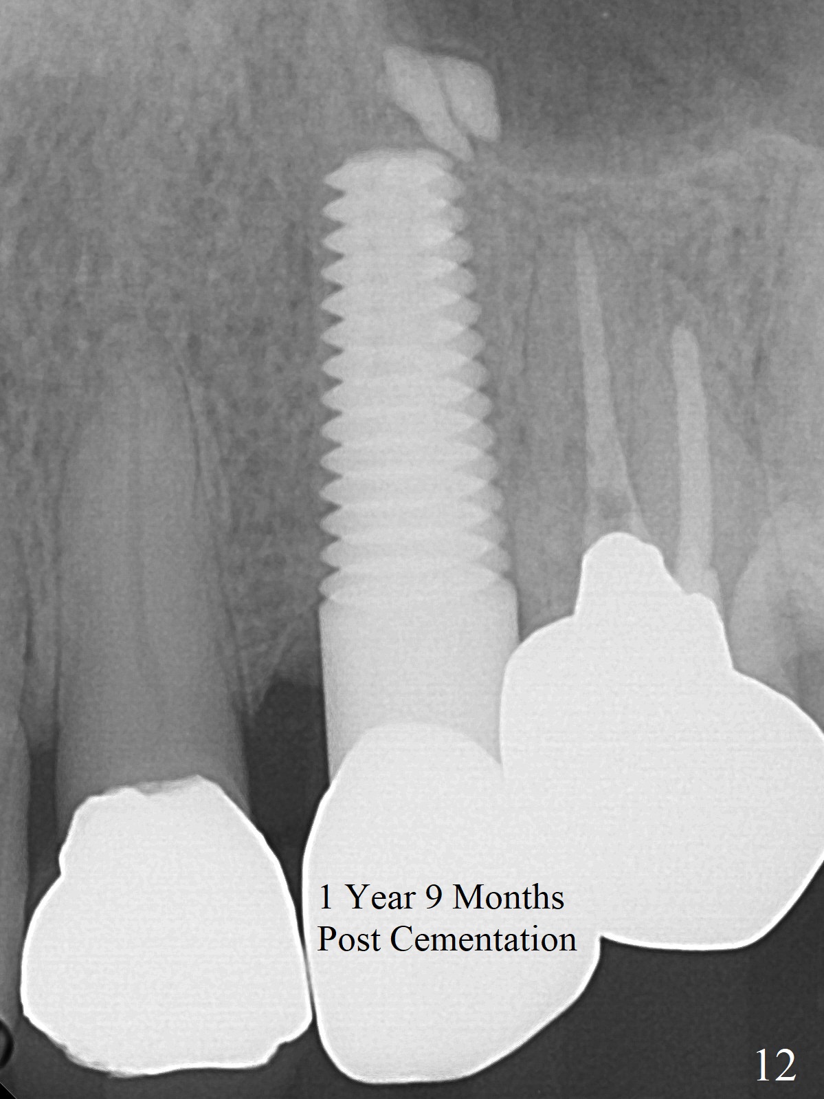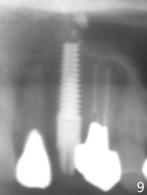 Extraction of the residual root at #11 (Fig.1) turns out to be difficult (Fig.2 (arrow: after use of small elevator). The tooth is sectioned (Fig.2 *); the palatal portion is removed, while the buccal one is trimmed until new moon-shaped and subgingival (Fig.3 * (gauze (G) packed in the socket while photo taking)). Initial osteotomy is 20 mm deep with nasal floor perforation (Fig.4). The subsequent depth is 17 mm (Fig.5). When a 5x17 mm tissue-level implant is placed (Fig.6,7; >60 Ncm), there is a gap between it and the socket shield (Fig.6 *). Gap-filling Vera Graft (Fig.8 *) also covers the shield prior to fabrication of an immediate provisional (Fig.9). There is no apparent bone loss 3.5 months postop (Fig.10). There is no buccal plate resorption 9 months postop (Fig.11). The implant is doing well 2 years postop (1 year 9 months post cementation, Fig.12).