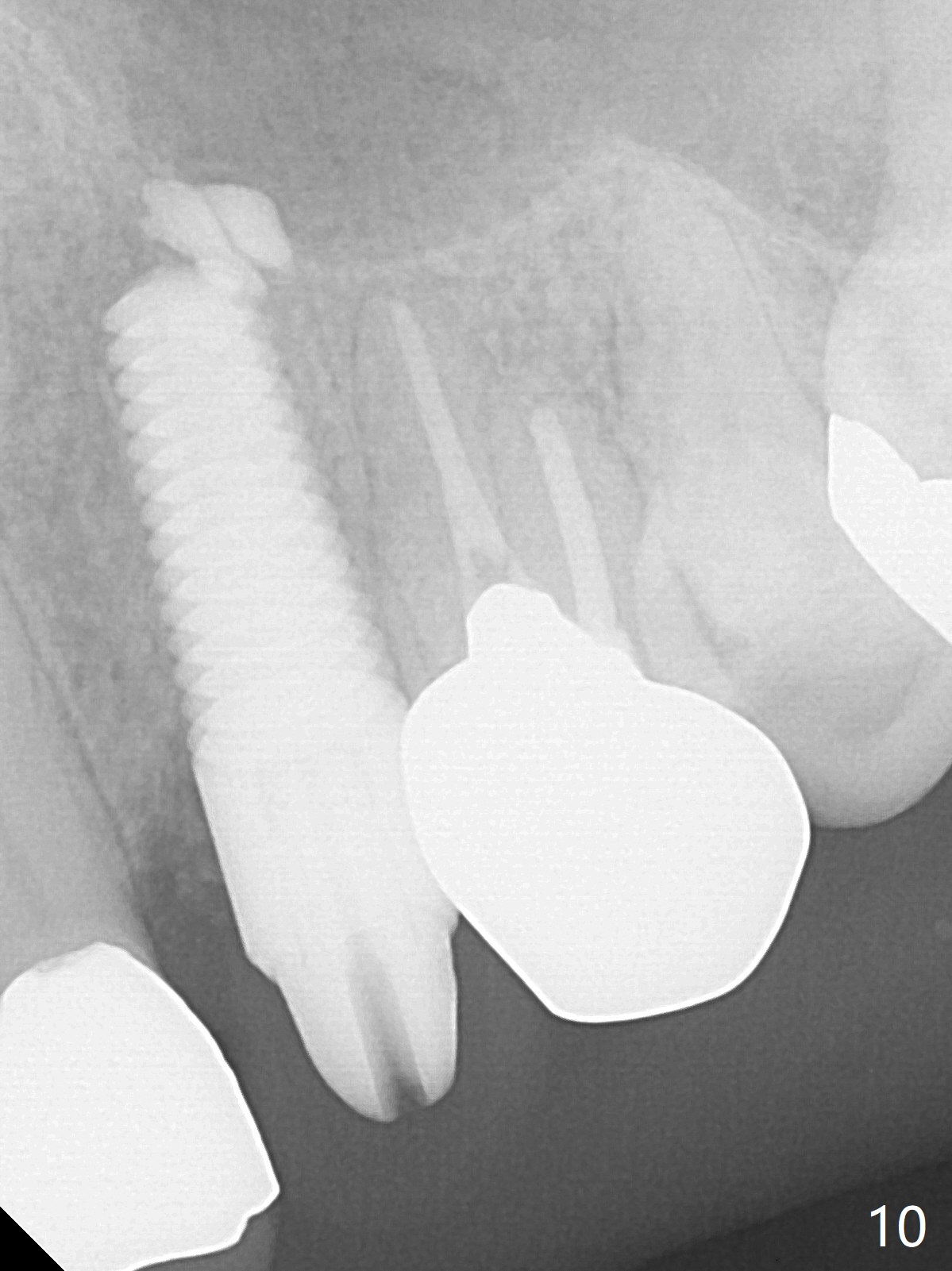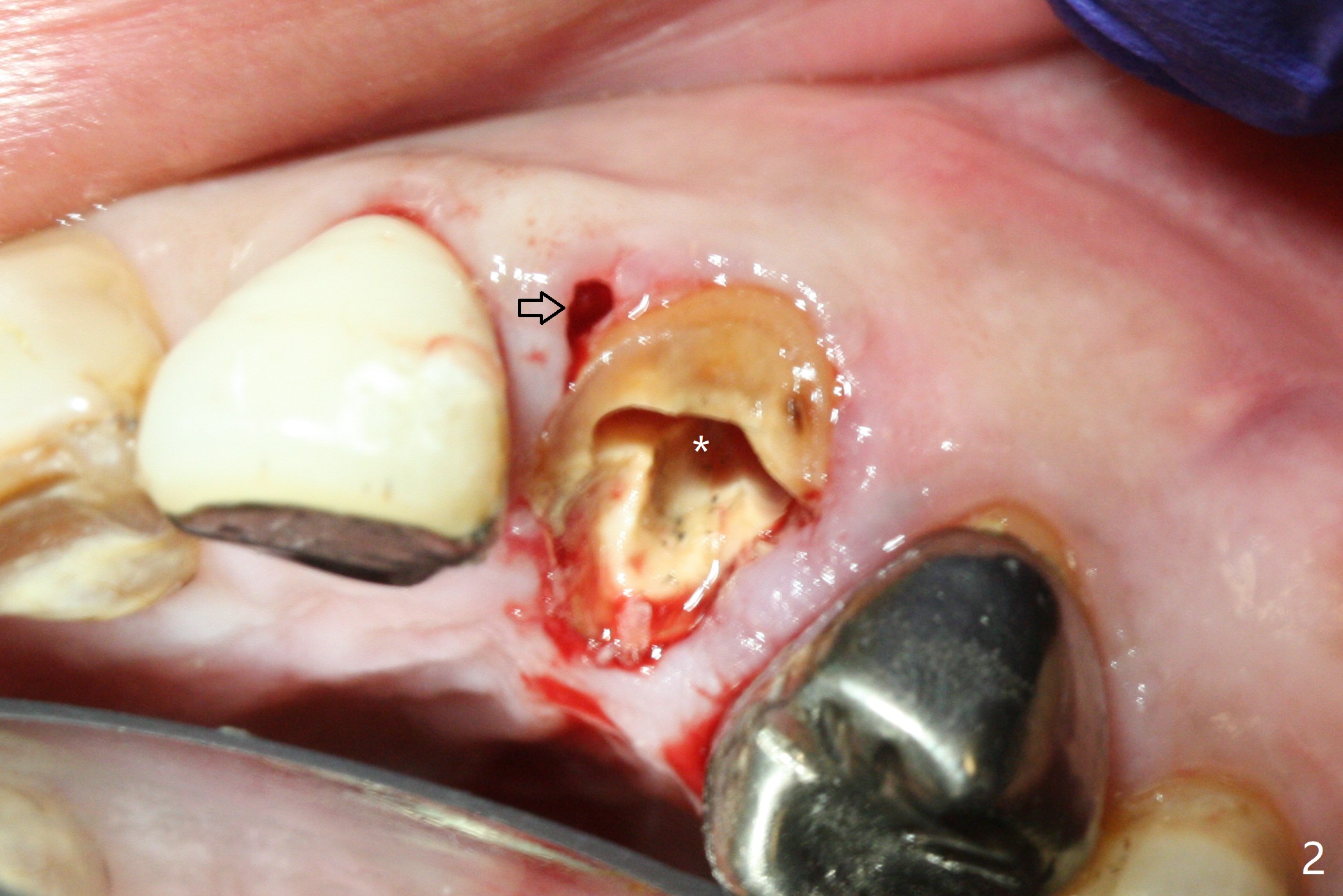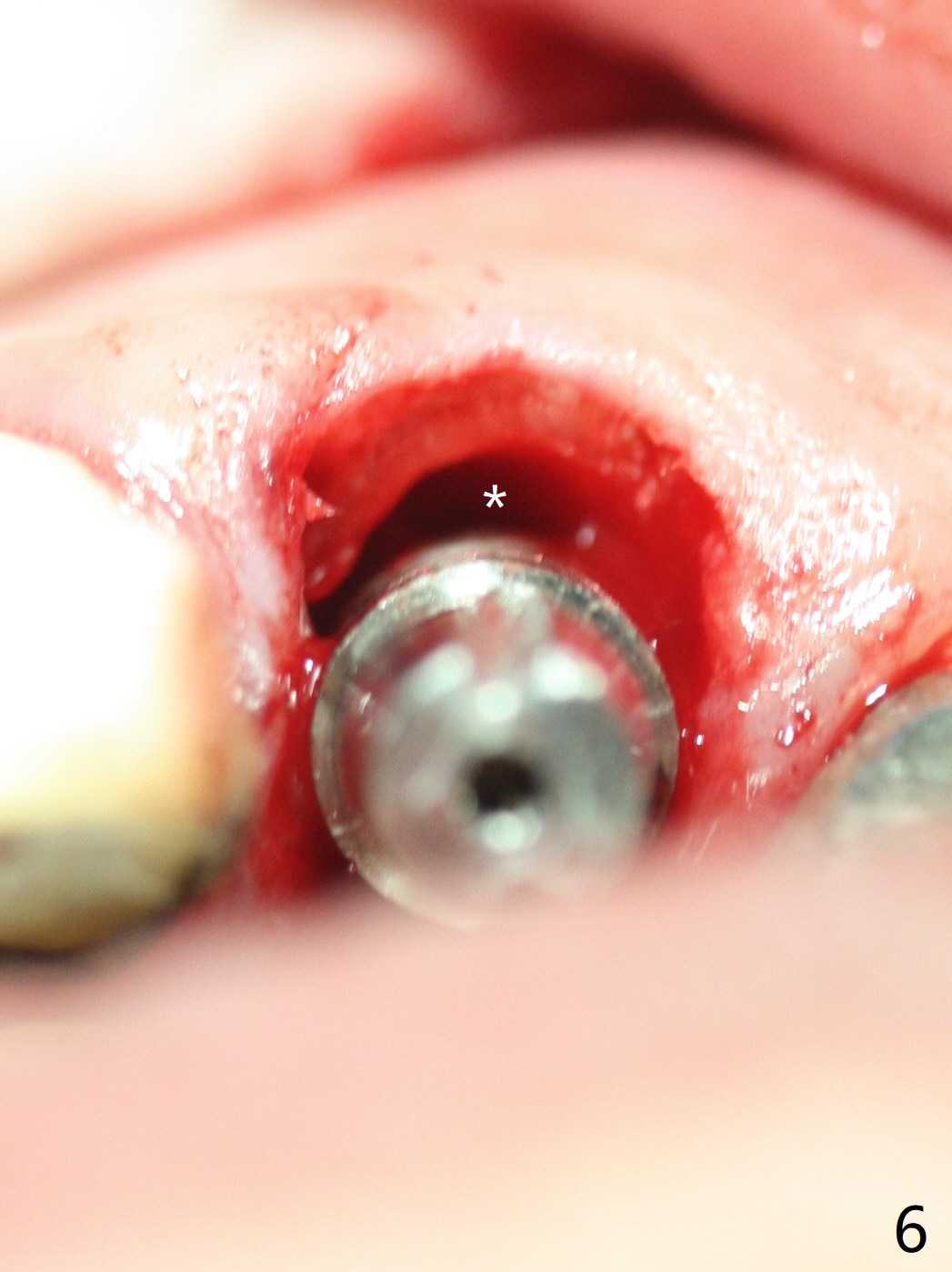 Extraction of the residual root at #11 (Fig.1) turns out to be difficult (Fig.2 (arrow: after use of small elevator). The tooth is sectioned (Fig.2 *); the palatal portion is removed, while the buccal one is trimmed until new moon-shaped and subgingival (Fig.3 * (gauze (G) packed in the socket while photo taking)). Initial osteotomy is 20 mm deep with nasal floor perforation (Fig.4). The subsequent depth is 17 mm (Fig.5). When a 5x17 mm tissue-level implant is placed (Fig.6,7; >60 Ncm), there is a gap between it and the socket shield (Fig.6 *). Gap-filling Vera Graft (Fig.8 *) also covers the shield prior to fabrication of an immediate provisional (Fig.9). There is no apparent bone loss 3.5 months postop (Fig.10). There is no buccal plate resorption 9 months postop (Fig.11). The implant is doing well 2 years postop (1 year 9 months post cementation, Fig.12).