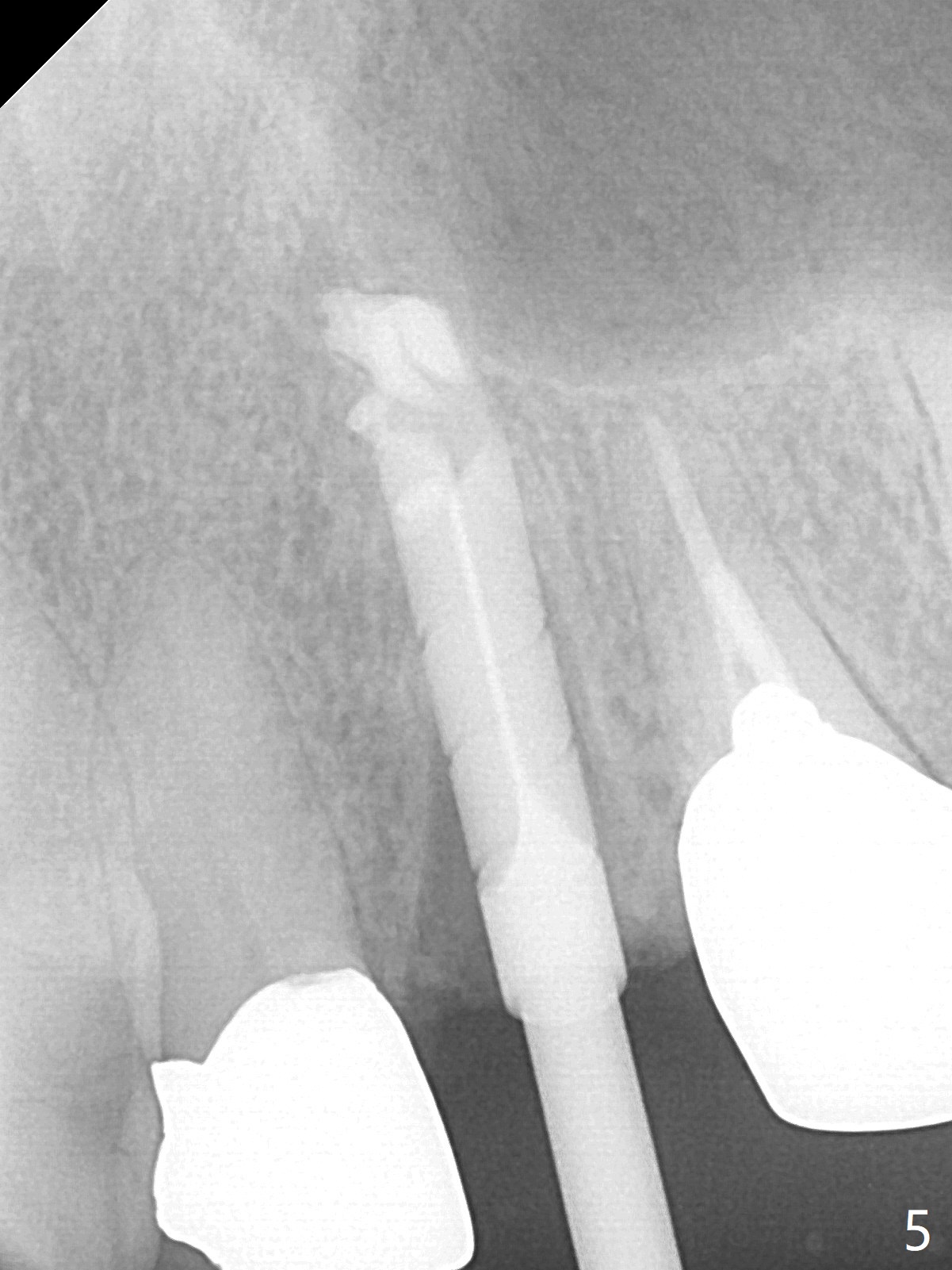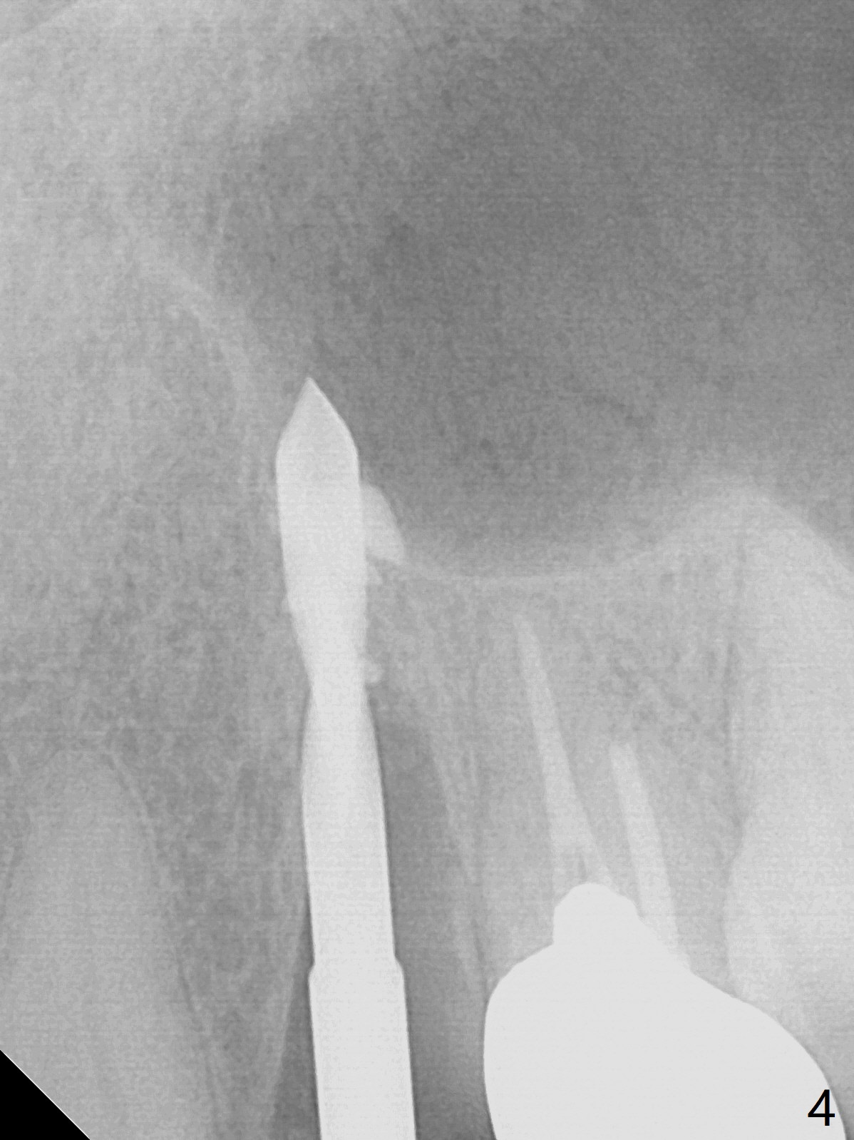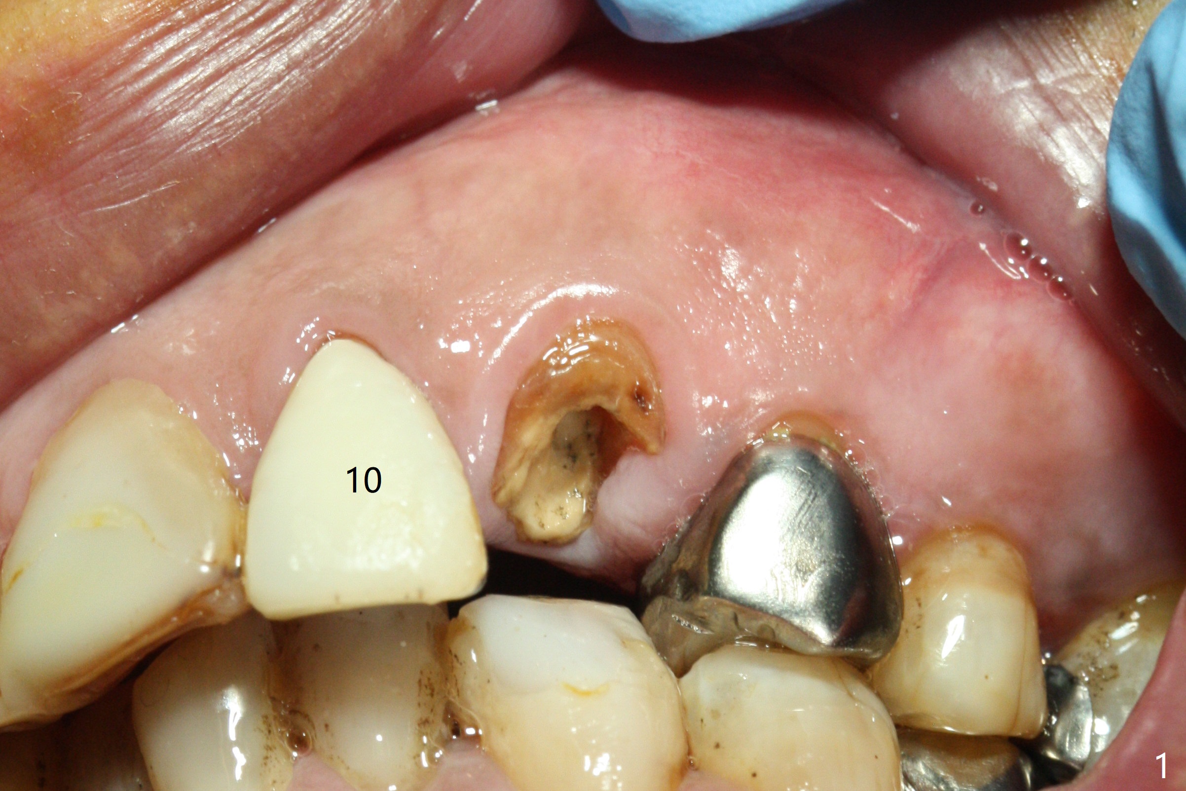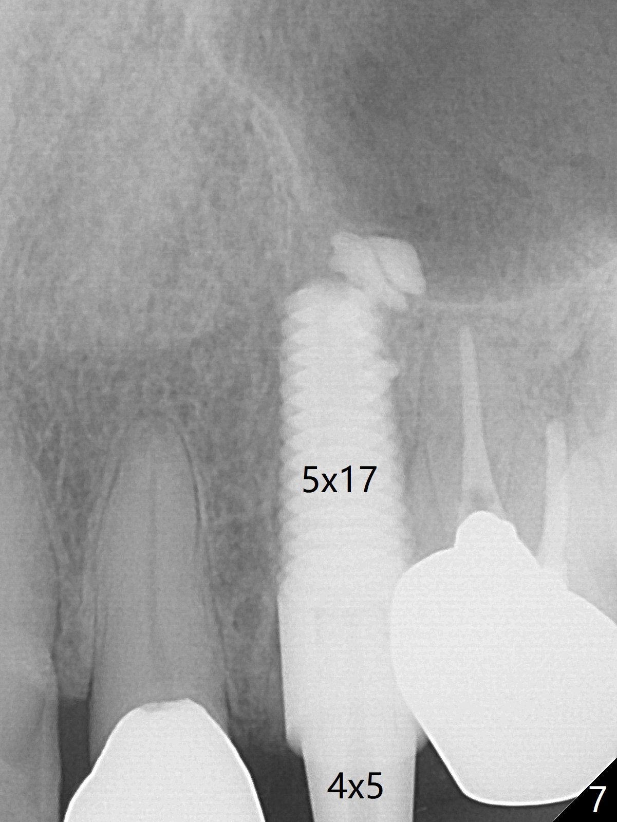 Extraction of the residual root at #11 (Fig.1) turns out to be difficult (Fig.2 (arrow: after use of small elevator). The tooth is sectioned (Fig.2 *); the palatal portion is removed, while the buccal one is trimmed until new moon-shaped and subgingival (Fig.3 * (gauze (G) packed in the socket while photo taking)). Initial osteotomy is 20 mm deep with nasal floor perforation (Fig.4). The subsequent depth is 17 mm (Fig.5). When a 5x17 mm tissue-level implant is placed (Fig.6,7; >60 Ncm), there is a gap between it and the socket shield (Fig.6 *). Gap-filling Vera Graft (Fig.8 *) also covers the shield prior to fabrication of an immediate provisional (Fig.9). There is no apparent bone loss 3.5 months postop (Fig.10). There is no buccal plate resorption 9 months postop (Fig.11). The implant is doing well 2 years postop (1 year 9 months post cementation, Fig.12).