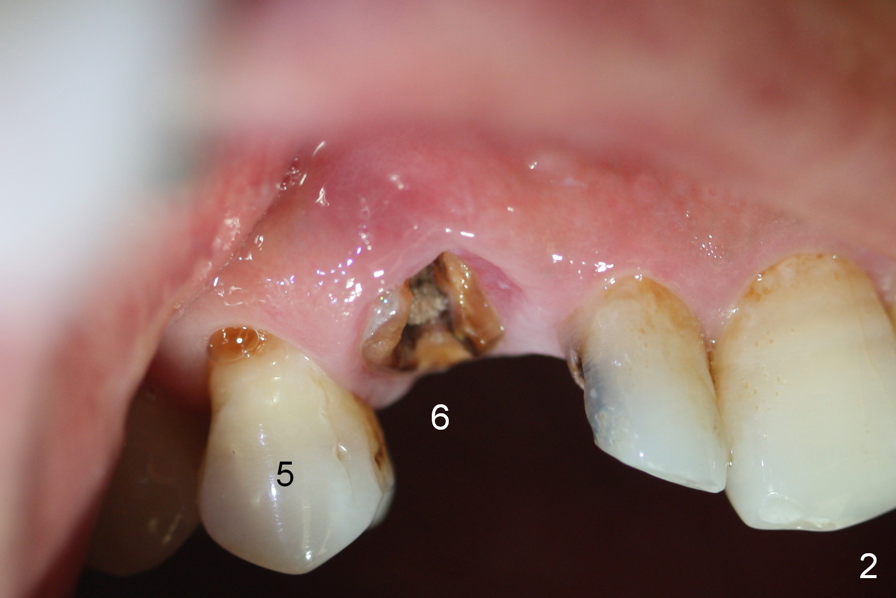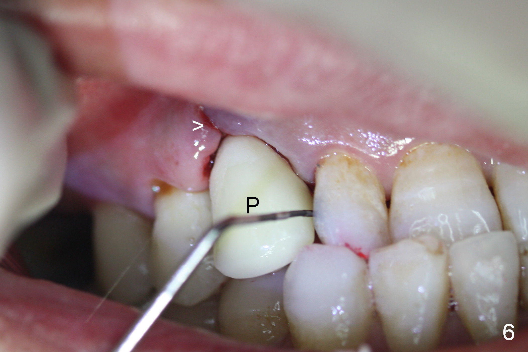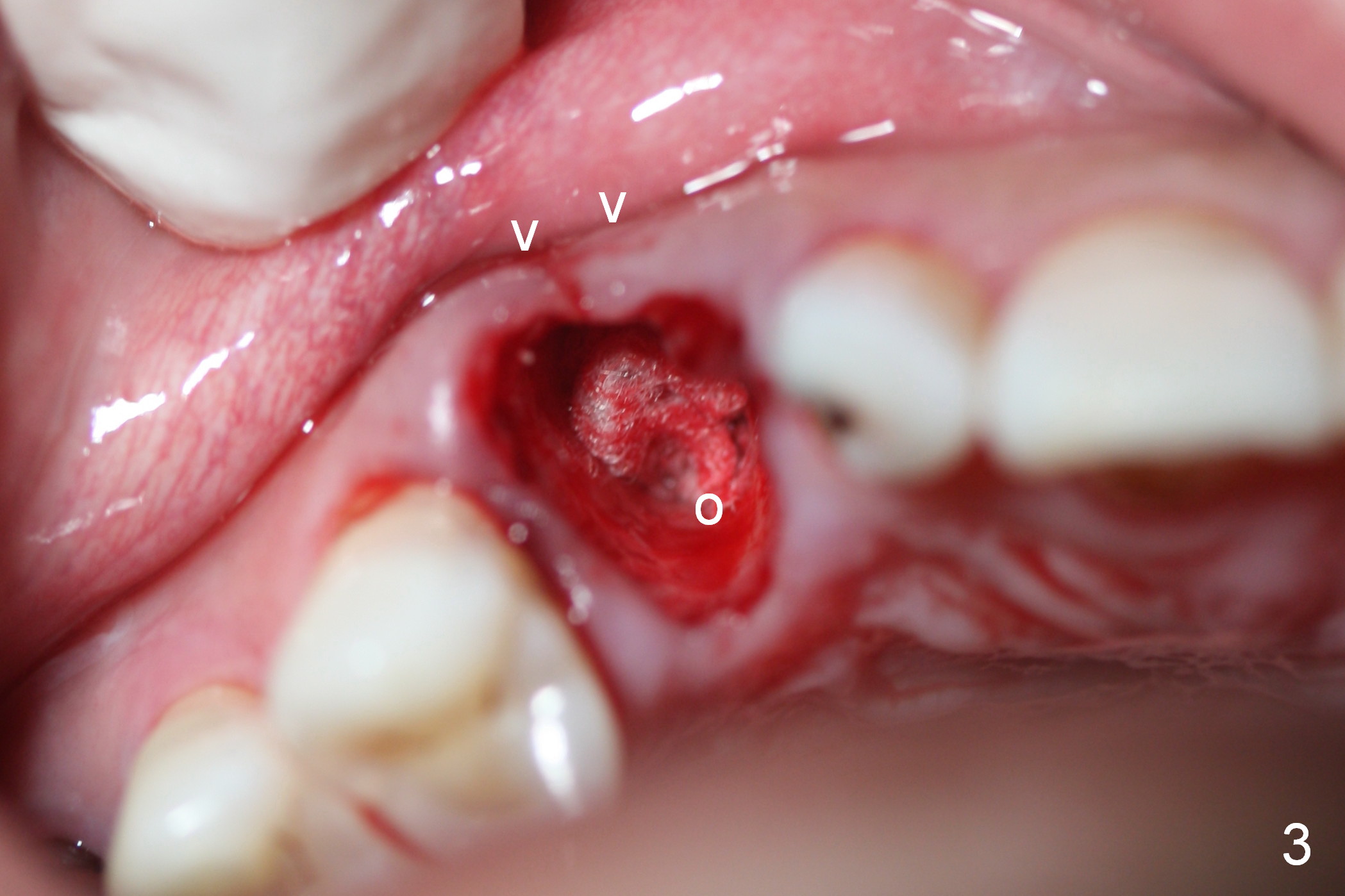While the periodontal ligament is being severed with Proximators (periotomes), the tooth #6 is found closer to the tooth #5 (Fig.1,2). When the tooth is extracted, an osteotomy is initiated slightly mesially in the palatal wall of the socket (Fig.3 O).