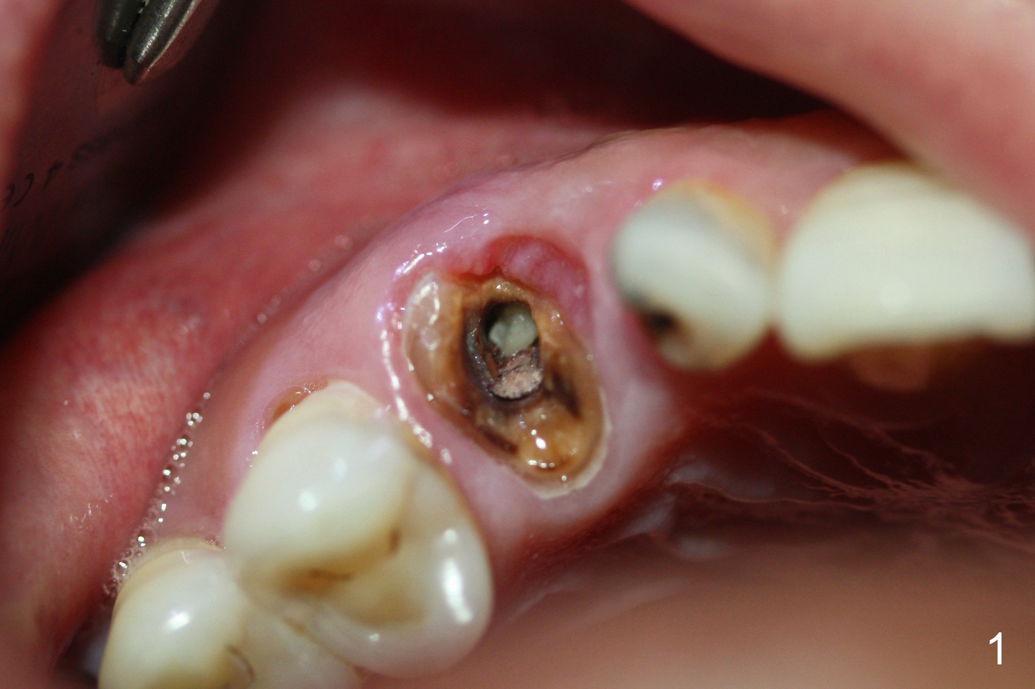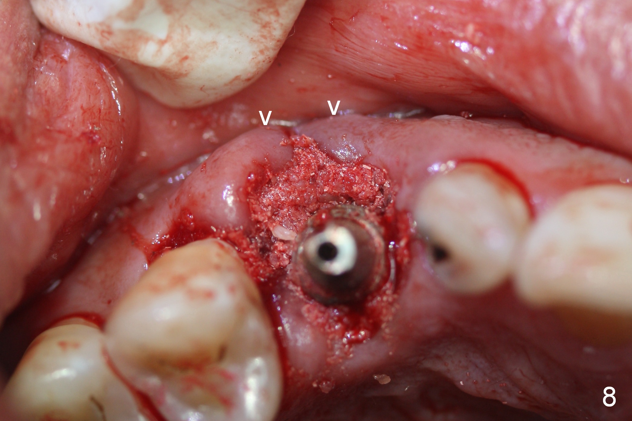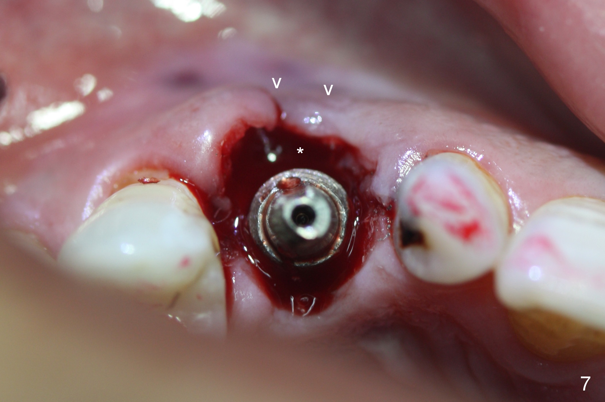 While the periodontal ligament is being severed with Proximators (periotomes), the tooth #6 is found closer to the tooth #5 (Fig.1,2). When the tooth is extracted, an osteotomy is initiated slightly mesially in the palatal wall of the socket (Fig.3 O).