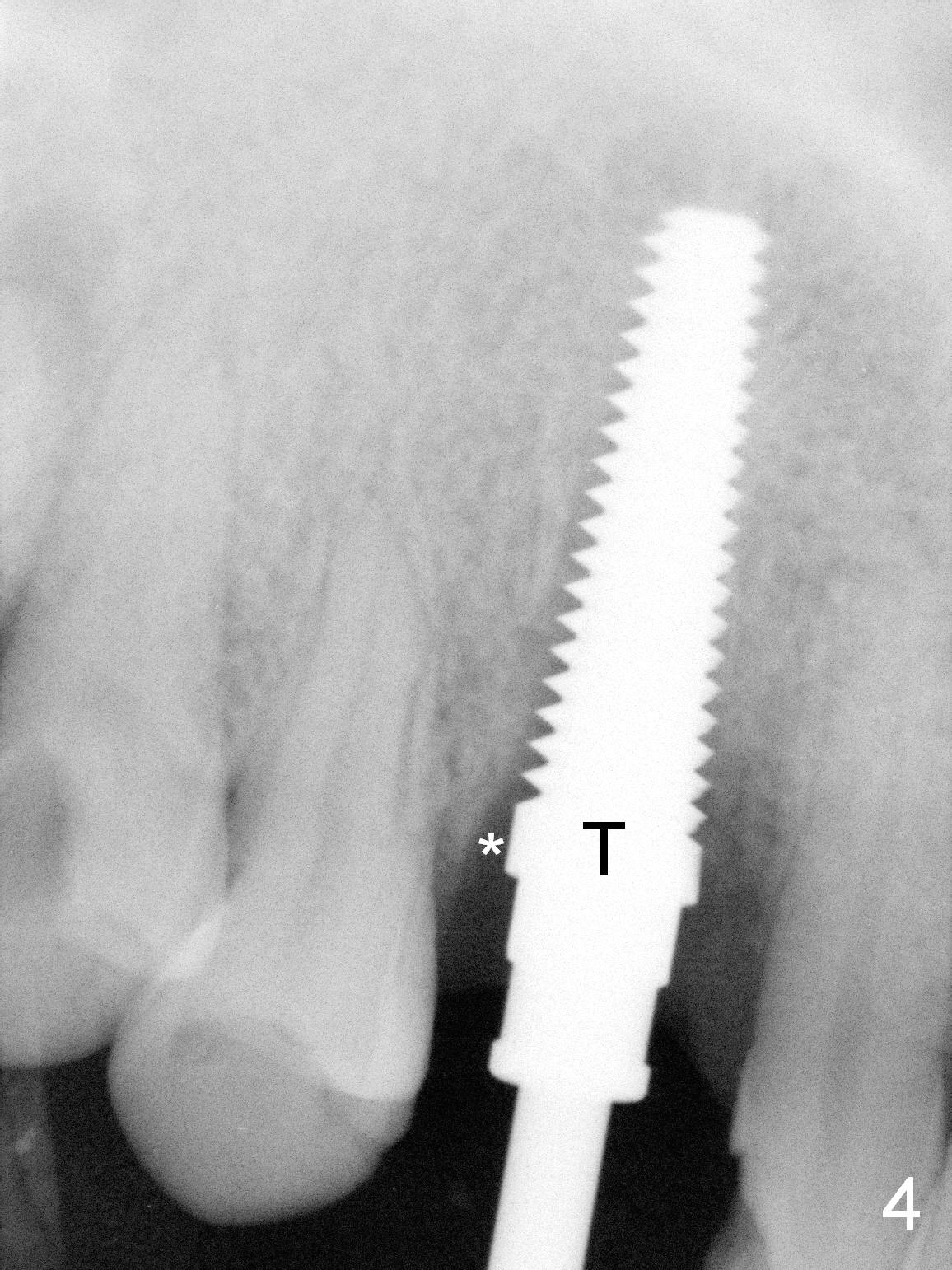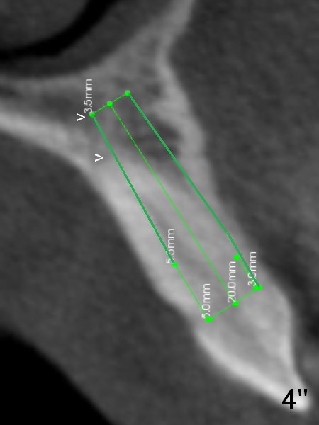 Lengthwise, a longer osteotomy is needed (Fig.4): 20 mm at the gingival level, 17 mm at the bone level. Distal to the 5 mm tap is a gap (*). Initially a shorter osteotomy (by 3 mm) is made: there is minimal engagement with the labial bone (Fig.4' between arrowheads (CT coronal section from not the same patient)). The osteotomy is extended (Fig.4''). This is the second problem to be solved.