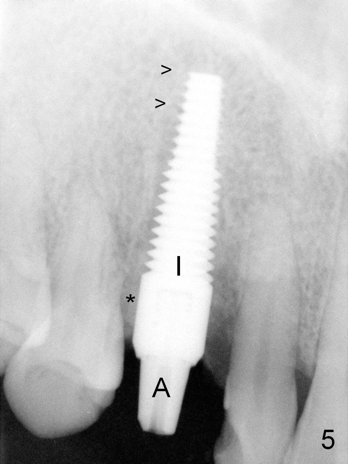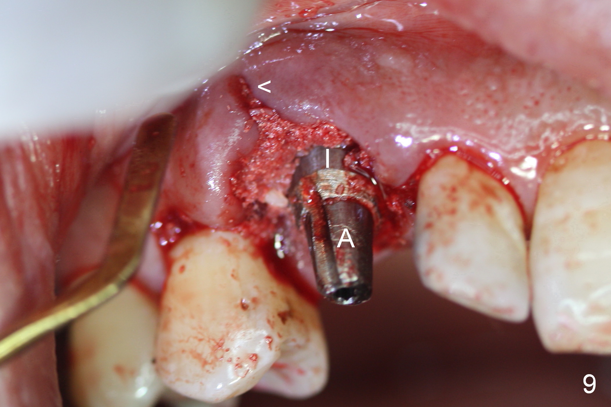 After 5x20 mm implant is placed, the distal gap is filled with bone graft (Fig.5 *). An abutment is placed (A) for fabrication of an immediate provisional (Fig.6 P). The latter hold the labial gingiva bulging (Fig.6 >). When the provisional is removed for bone grafting, the labial gingiva collapses (Fig.7 arrowheads). In fact a piece of cone-shaped Osteotape (Impladent) is placed palatal to the labial gingiva/thin labial plate and a small amount of graft is placed in the deepest area of the socket (labial to the osteotomy) prior to placement of the implant. More graft is placed in the peri-implant gap, particularly labially to keep the labial gingiva convex (Fig.8 arrowheads). The lacerated gingiva is to be approximated with perio glue (Fig.9 <). Collagen dressing is placed over the exposed graft before cementation of the provisional. Perio dressing is applied for further protection and seal.