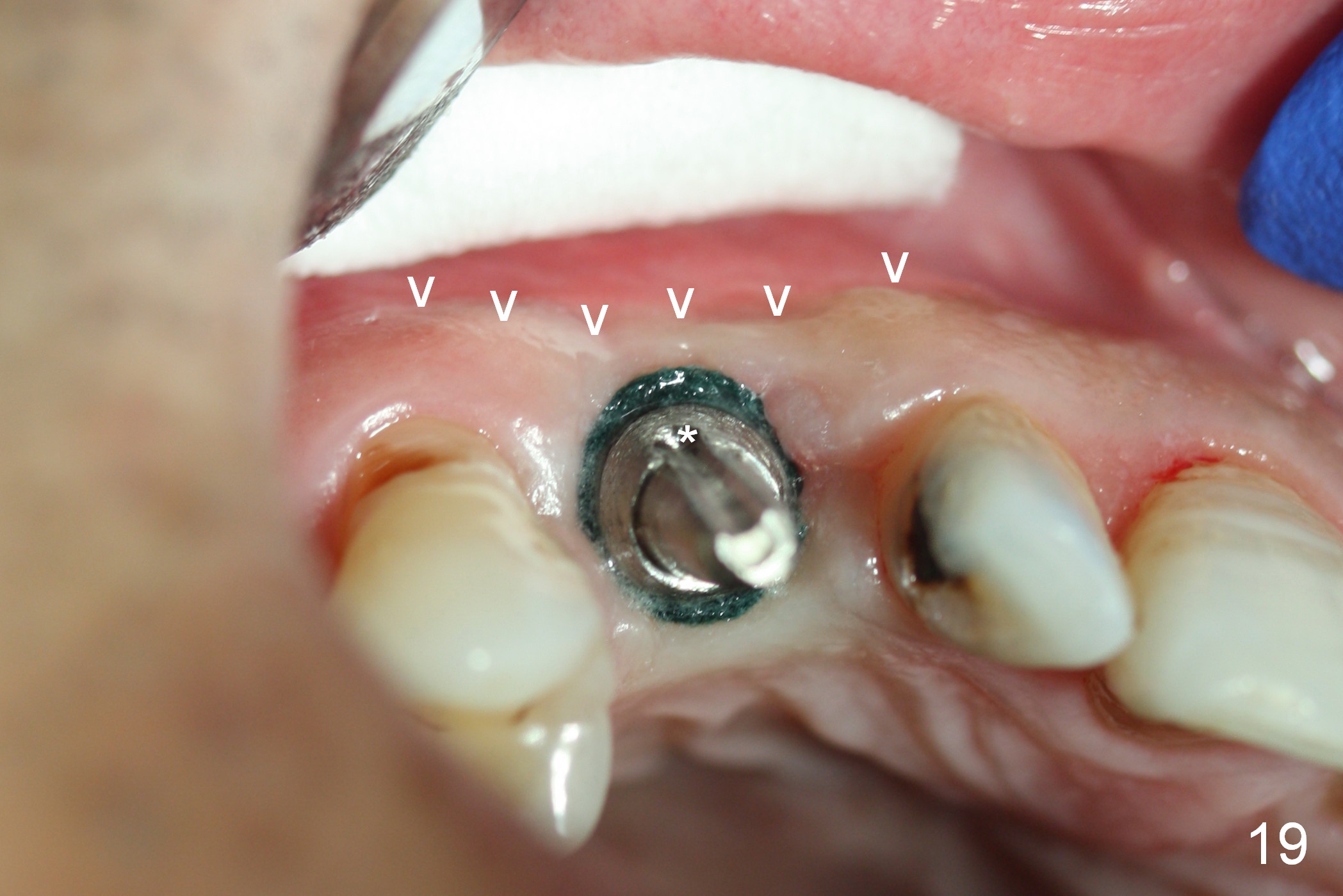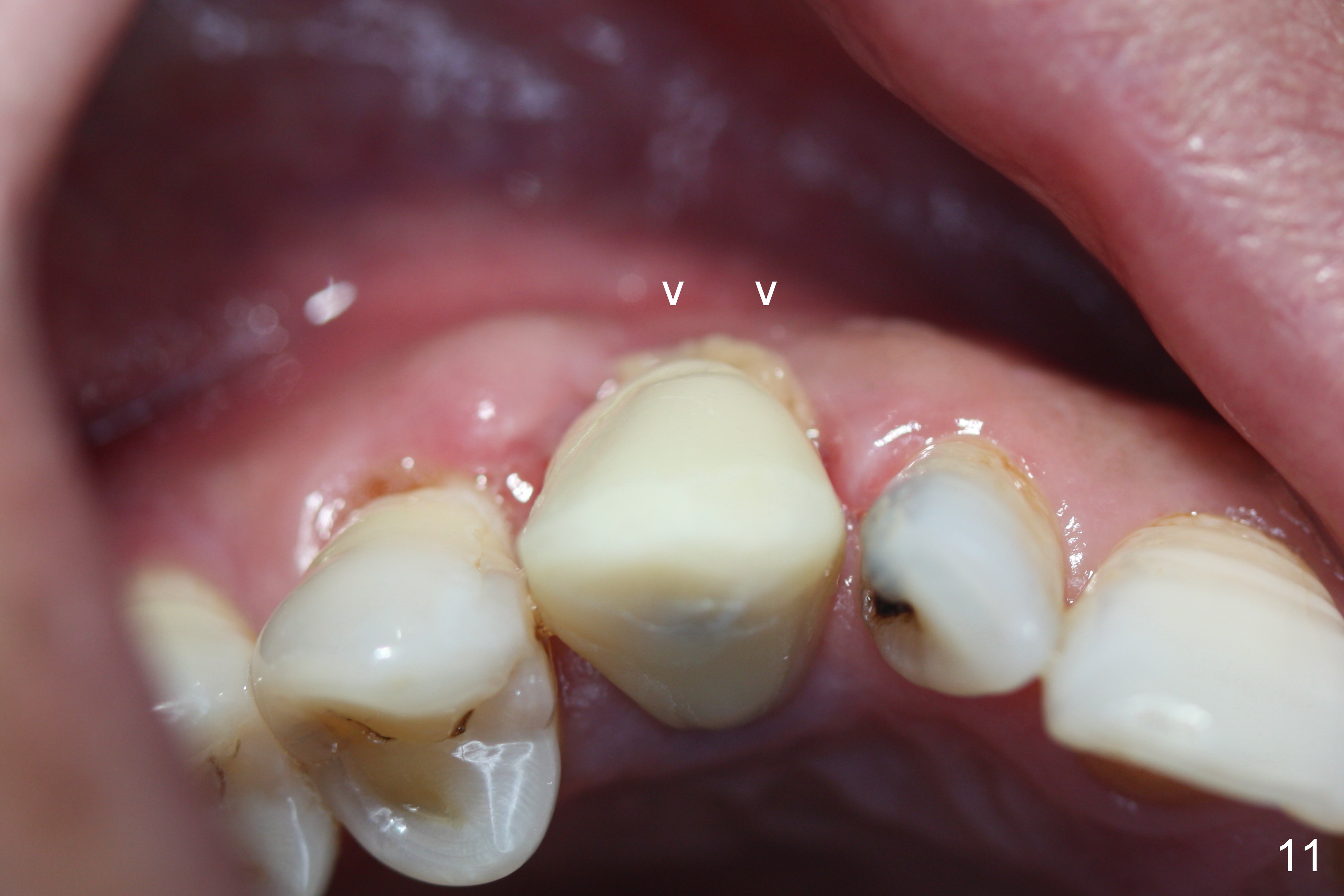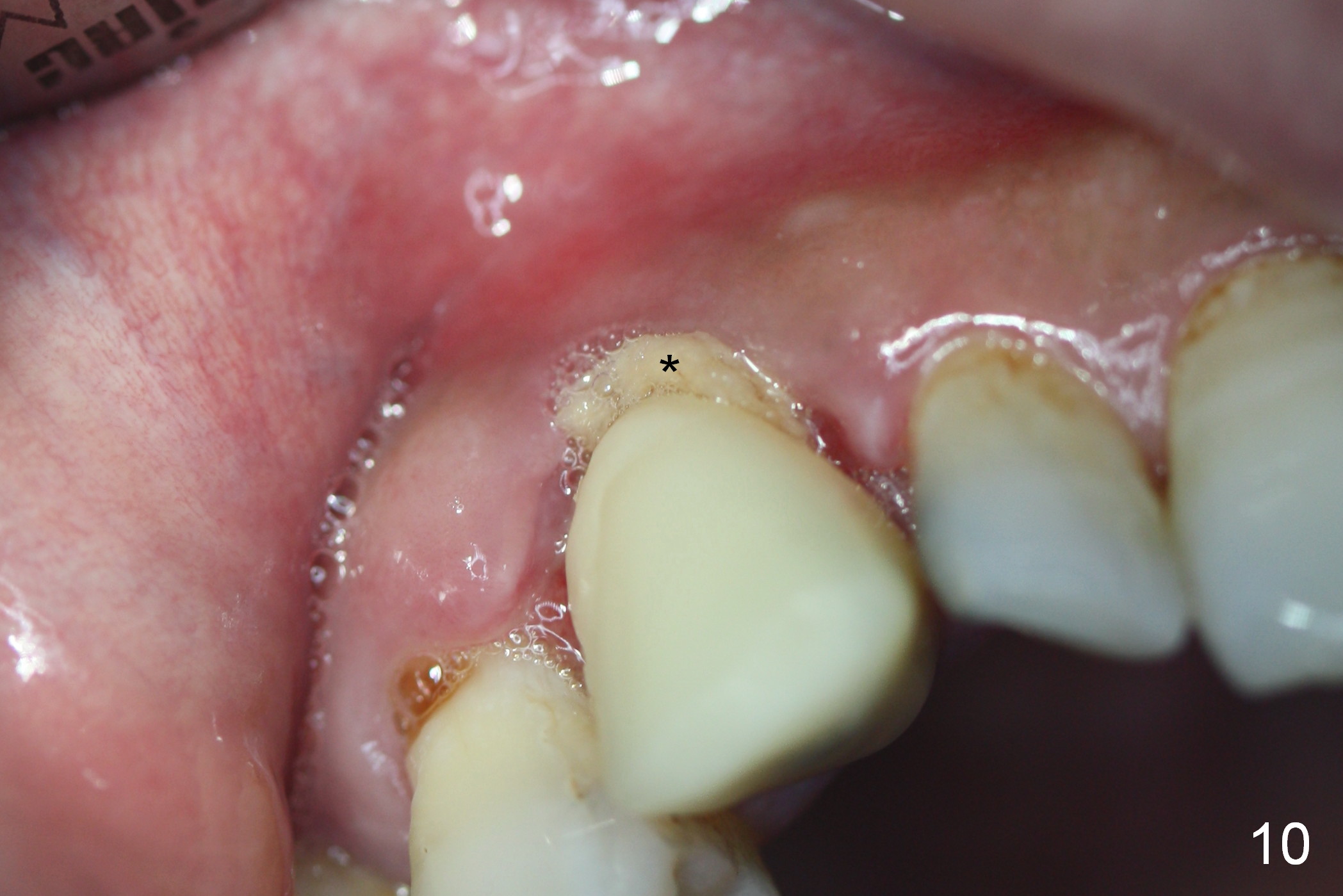 The perio dressing has been dislodged with exposure of the collagen dressing (Fig.10 *) 13 days postop. The graft appears to have consolidated or dislodged since the buccal plate collapses (Fig.11 arrowheads) to the status prior to grafting (as compared to Fig.7).