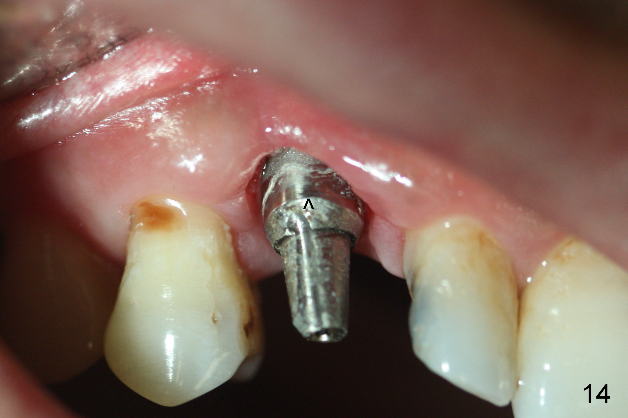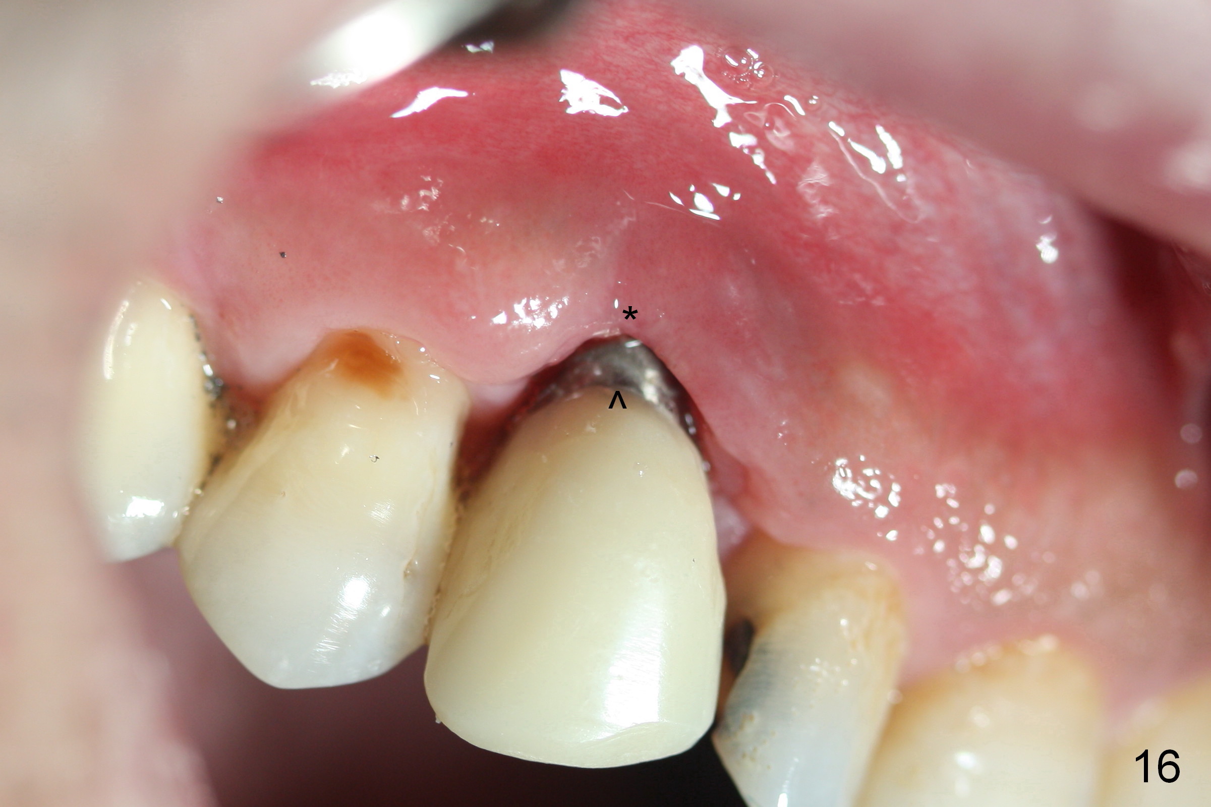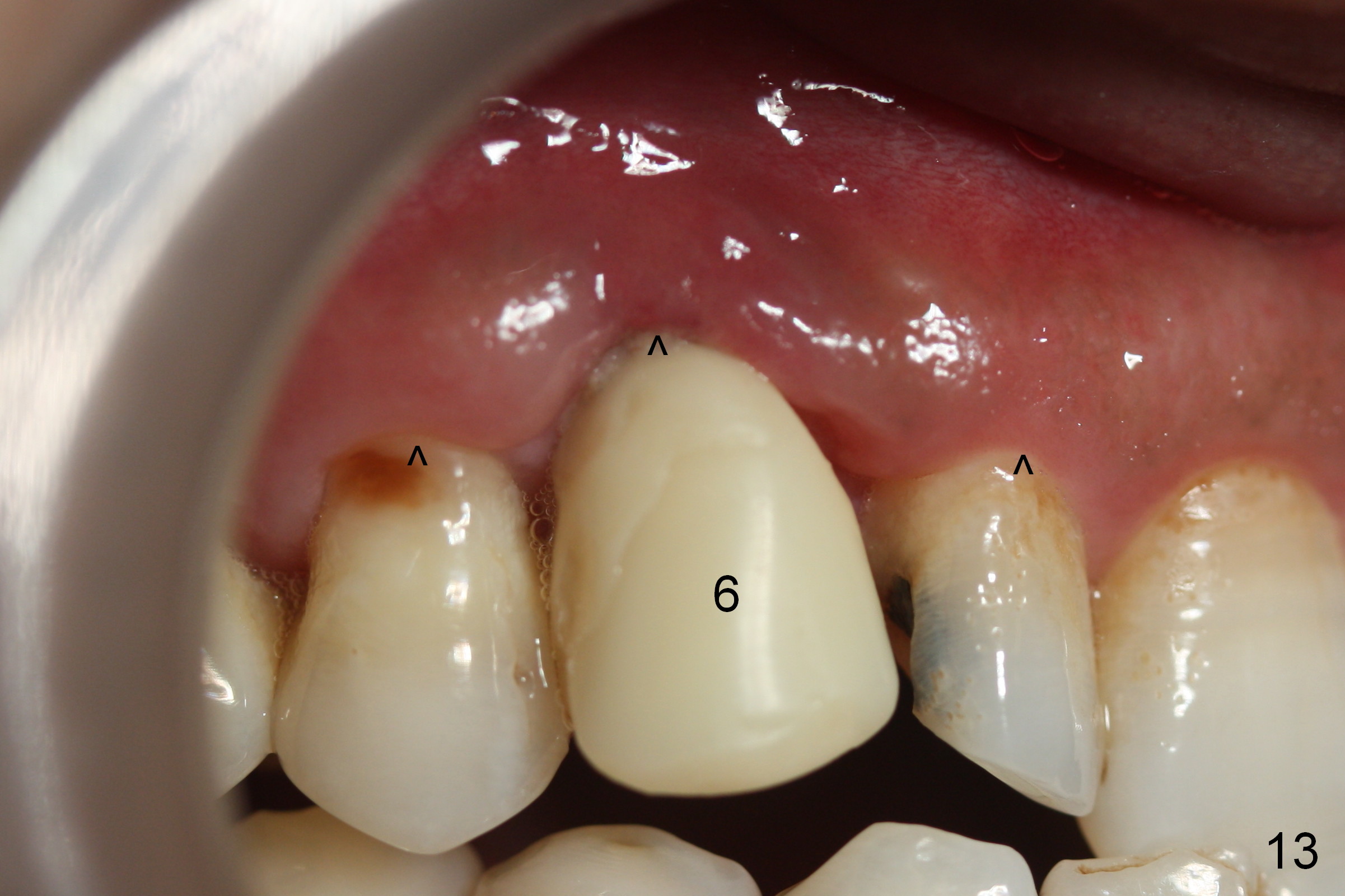 The patient returns 1.5 months postop. The provisional margin is much higher than that of the neighboring teeth (Fig.12,13: #6), unlike the opposite side (Fig.12: #11). When the provisional is removed, the implant margin is at the same level as that of the neighboring teeth (Fig.14 arrowheads). The implant margin is slightly extended apically (Fig.15 ^) prior to seating of the modified provisional. When the provisional is seated, its margin (Fig.16 ^) is at the implant margin; the gingival margin (*) is free and expected to move coronally by itself.