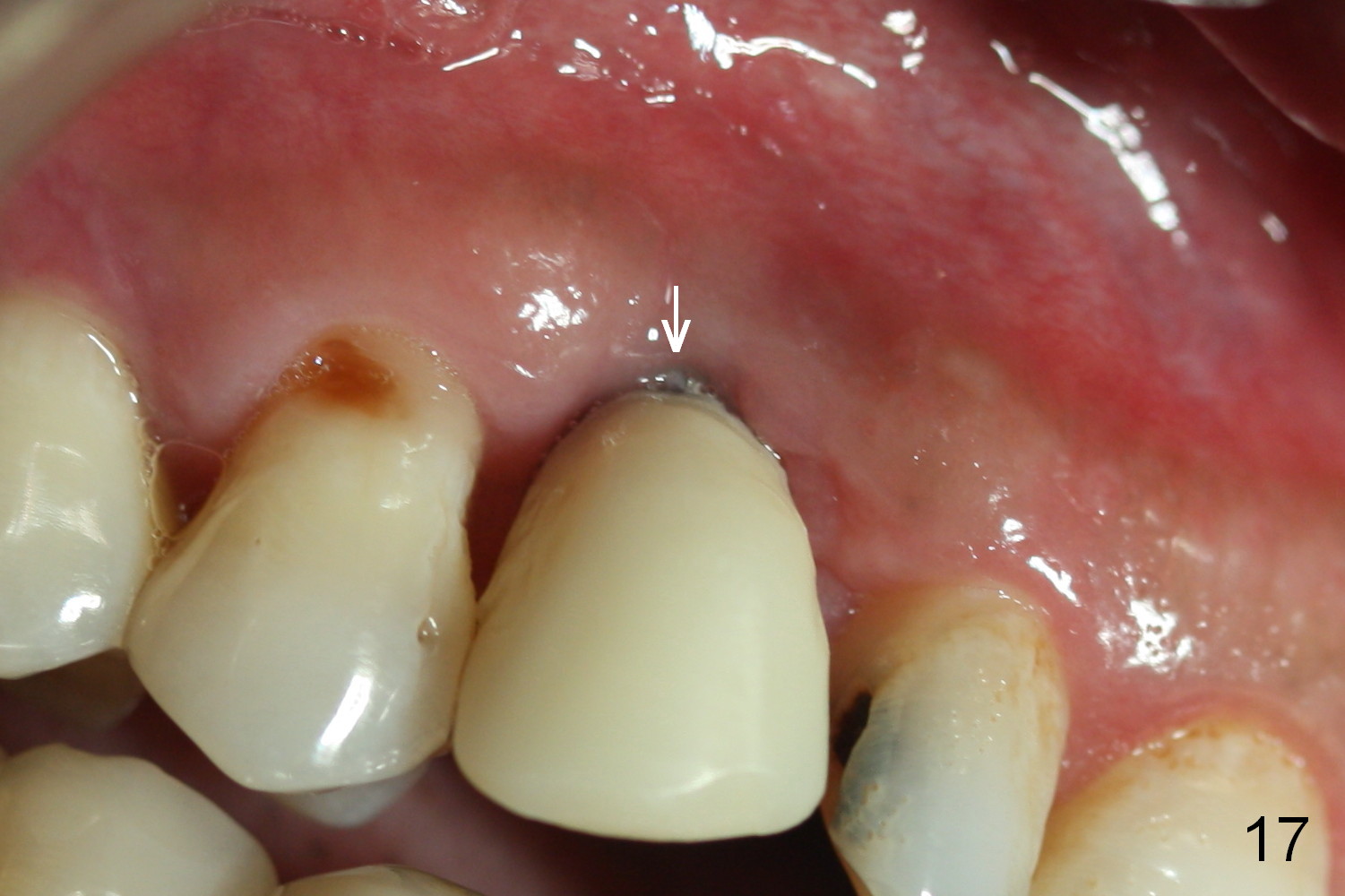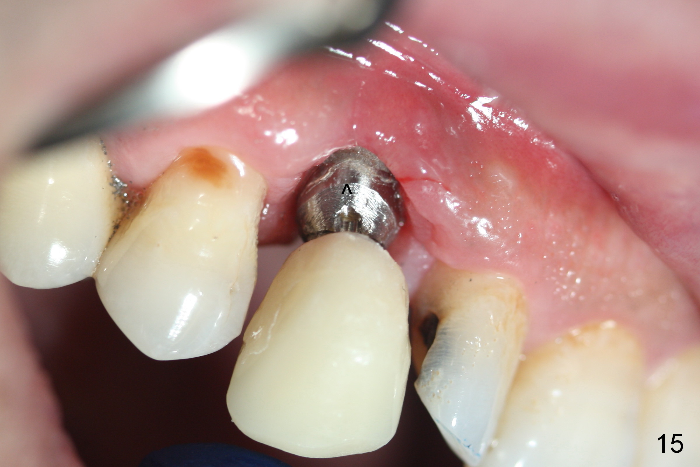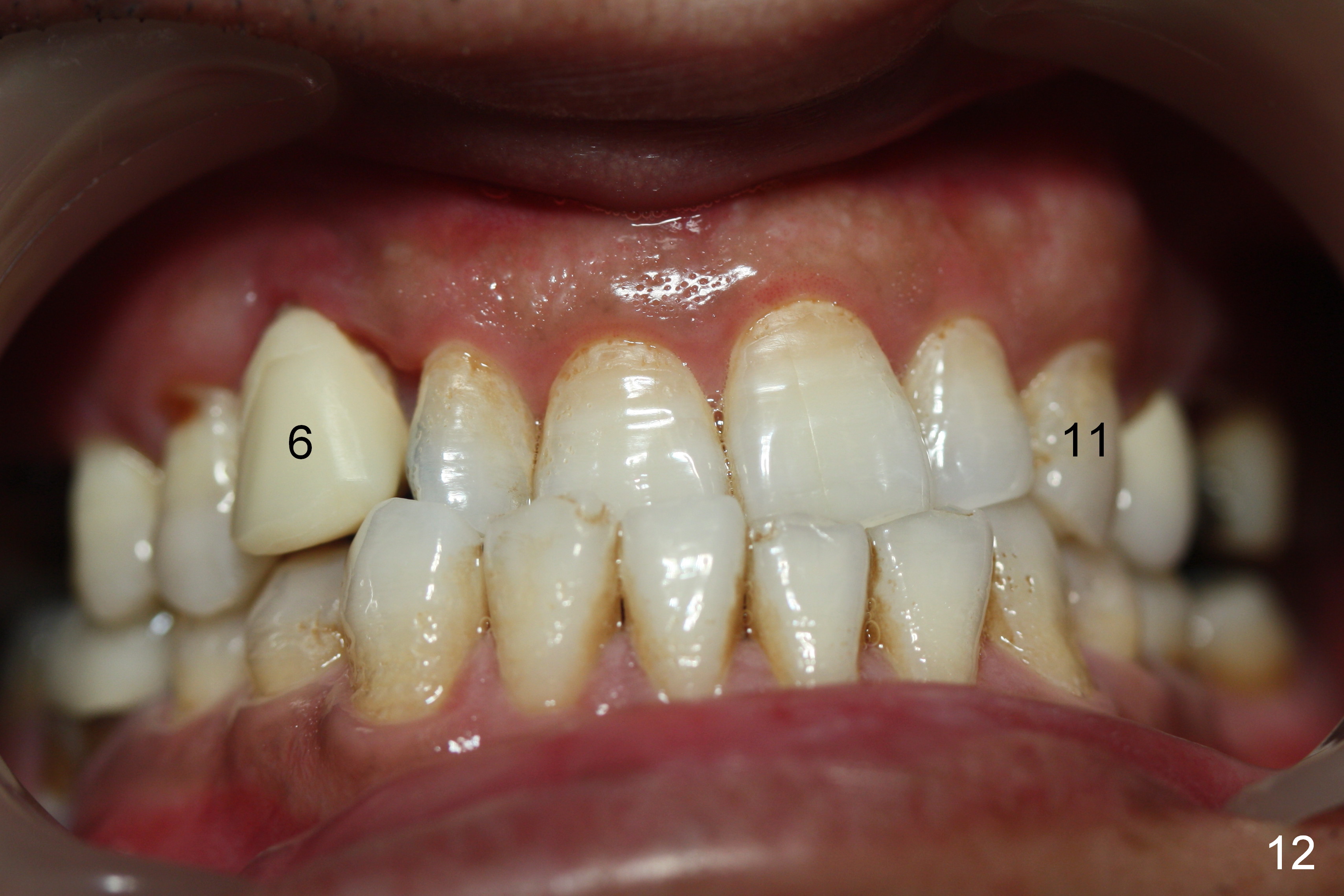 The patient returns 1.5 months postop. The provisional margin is much higher than that of the neighboring teeth (Fig.12,13: #6), unlike the opposite side (Fig.12: #11). When the provisional is removed, the implant margin is at the same level as that of the neighboring teeth (Fig.14 arrowheads). The implant margin is slightly extended apically (Fig.15 ^) prior to seating of the modified provisional. When the provisional is seated, its margin (Fig.16 ^) is at the implant margin; the gingival margin (*) is free and expected to move coronally by itself.