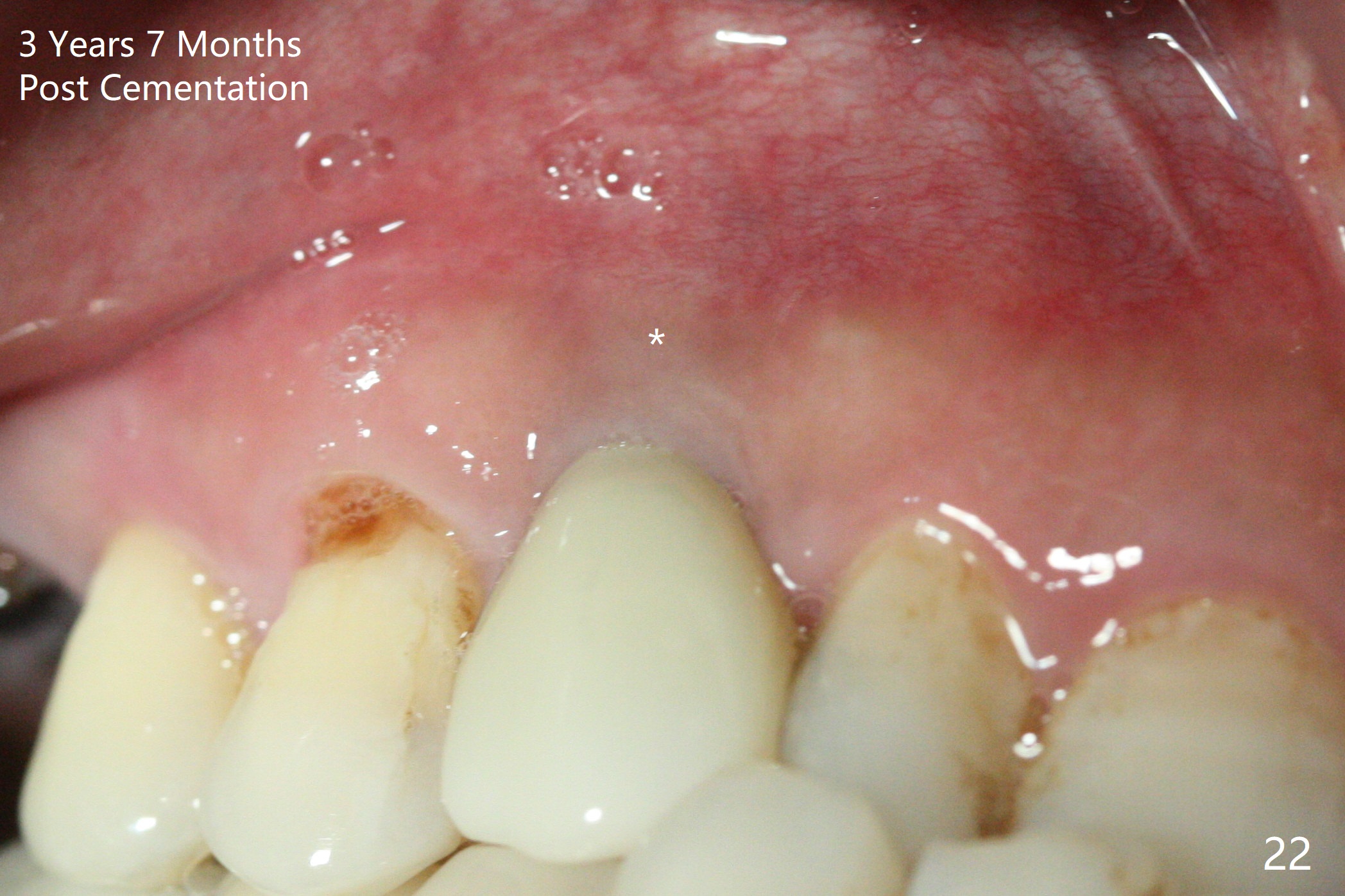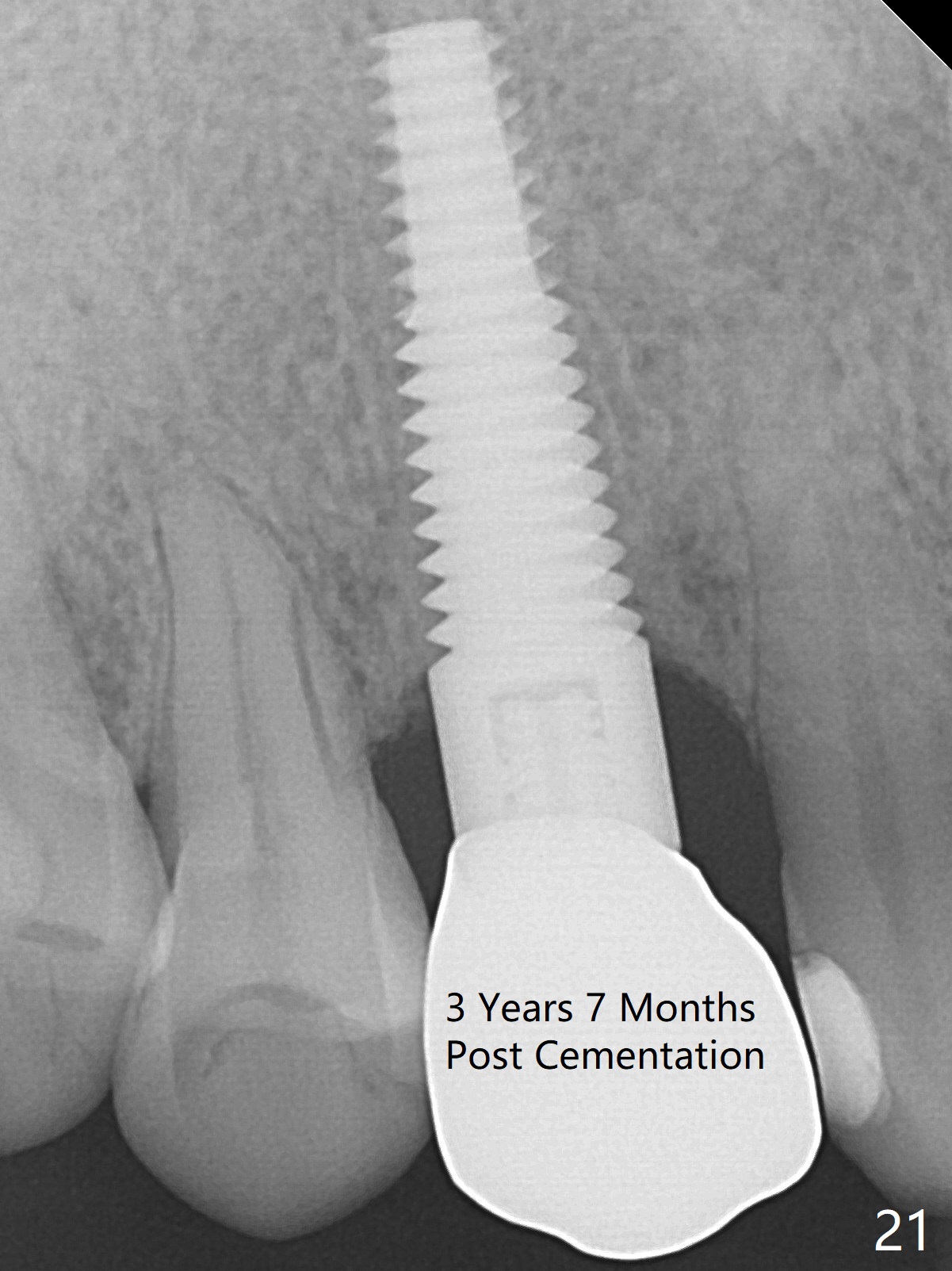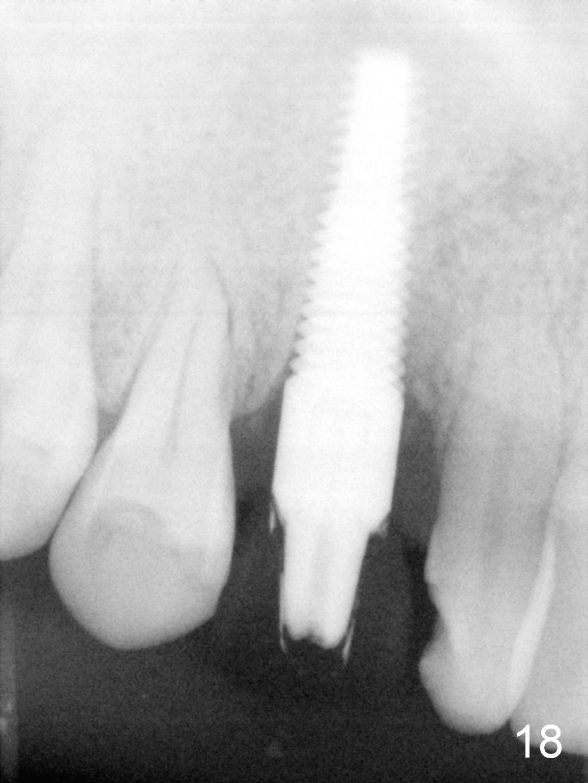 To be improved: 1. Implant could be placed more palatal; 2. Gingival laceration should have been sutured prior to bone grafting; 3. The buccal margin of the provisional should have been extended more buccally to prevent bone graft from dislodgement; the provisional should be relined and recemented securely; 4. More rigid membrane should have been used to keep convexity of the buccal plate. The crestal bone is stable 3 Years 7 Months Post Cementation (Fig.21). The buccal plate is slightly atrophic 3 Years 7 Months Post Cementation (Fig.22).