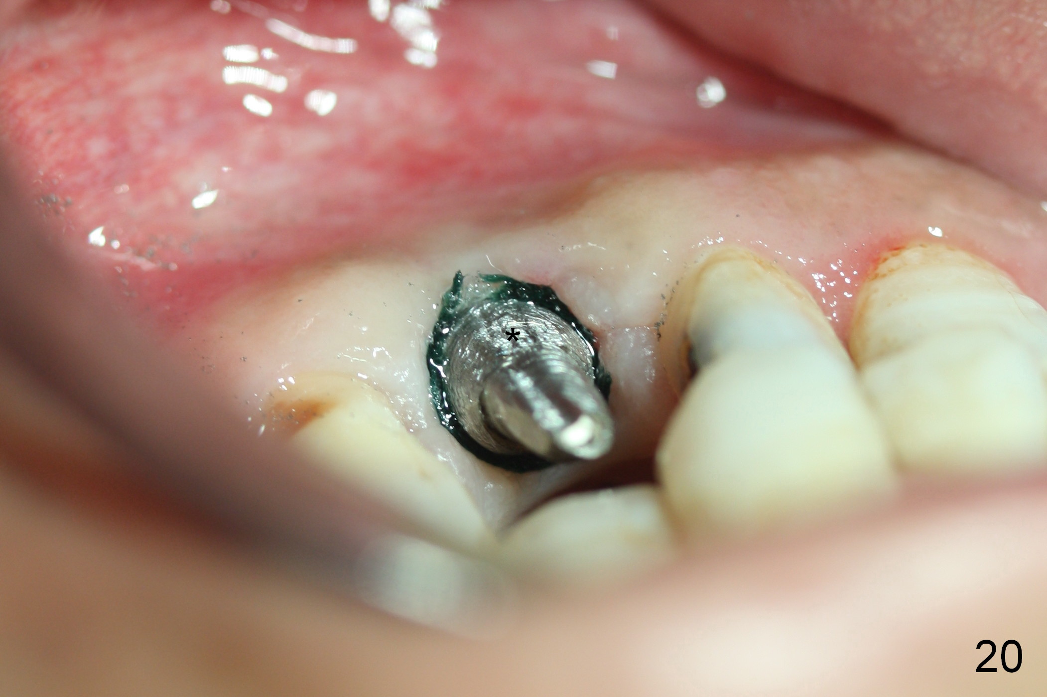 One and a half months later (3 months postop), the patient returns for final crown impression. The buccal gingiva has grown coronally (Fig.17 arrow). The implant appears to have osteointegrated (Fig.18). The buccal plate has become concave (Fig.19 arrowheads). To maintain the gingival level, the buccal portion of the implant/abutment (Fig.19 *) is going to be reduced (Fig.20 *). The margin of the definitive restoration will be at the prep margin and thin so that the gingiva is expected to continue to be growing coronally after cementation.