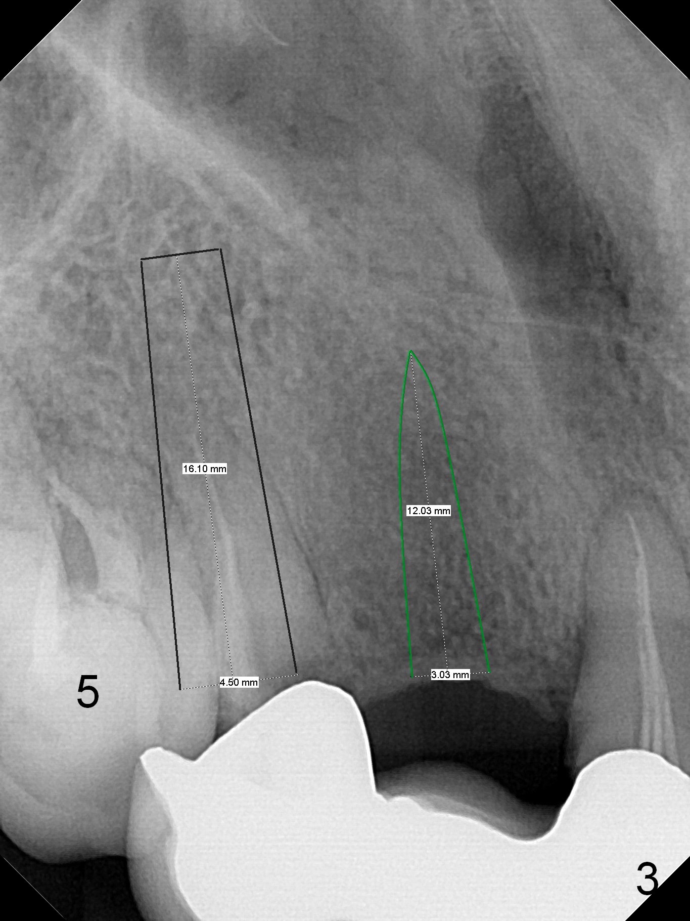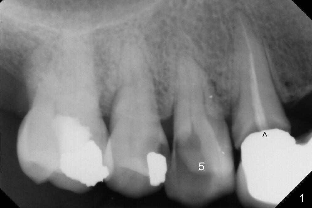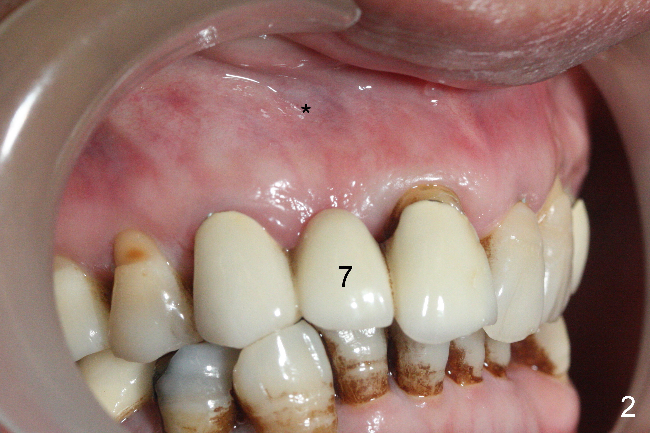 A 43-year-old woman has poor dentition including the tooth #5 (Fig.1) for RCT (Fig.3) and the teeth #2, 30 and 31 are missing. The retainer at #6 fractures (Fig.1 *). After sectioning the bridge between #7 and 8, fabricate prefabricated post at #6 if the latter is salvageable. Otherwise extract (Clindamycin) and implant (Fig.3). Anyway, a 3-mm or smaller one-piece implant is to be placed at #7 for stability and retention. Pay attention to the labial concavity at #7 (Fig.2 *). Surgical stent has been made.