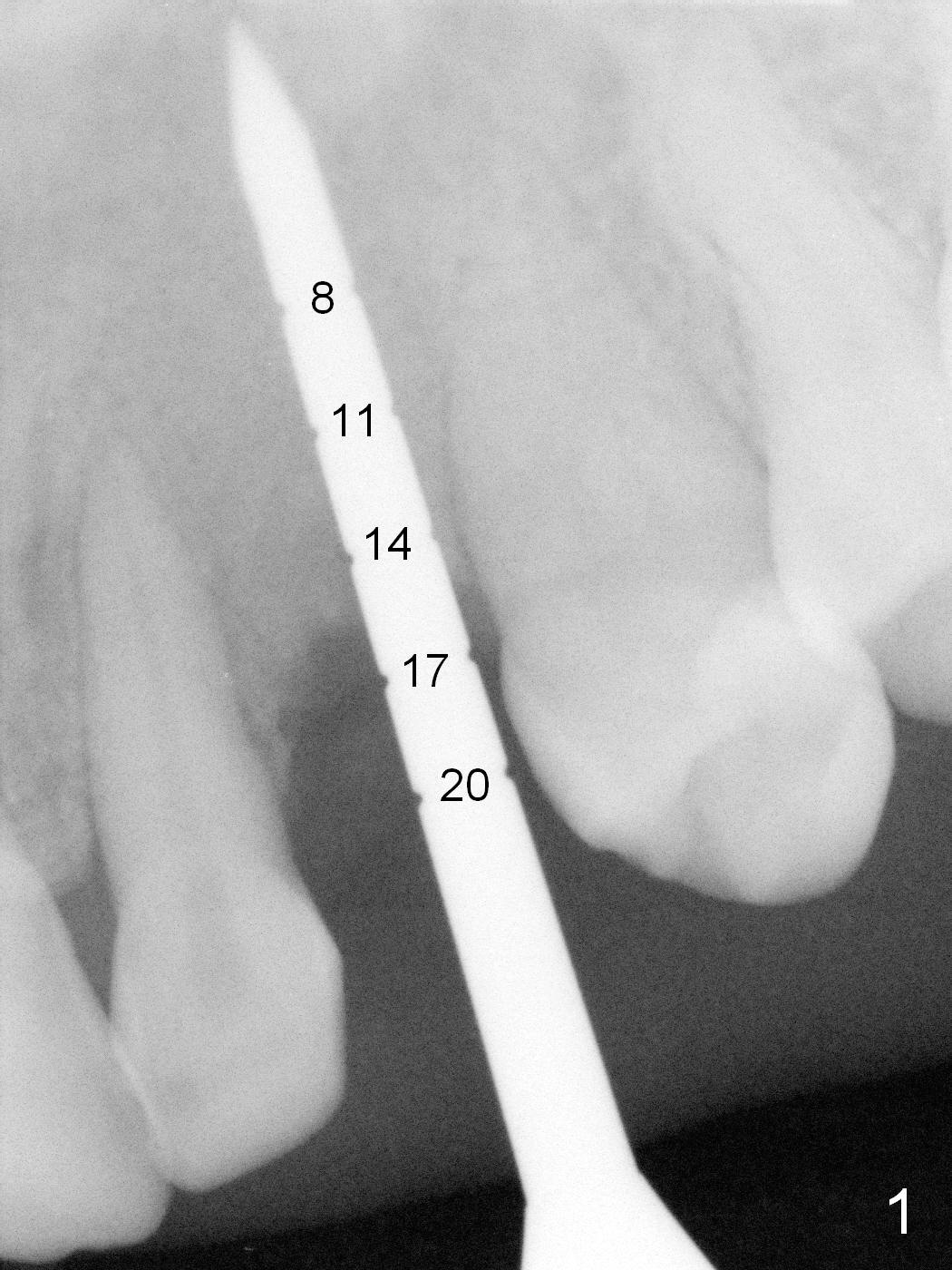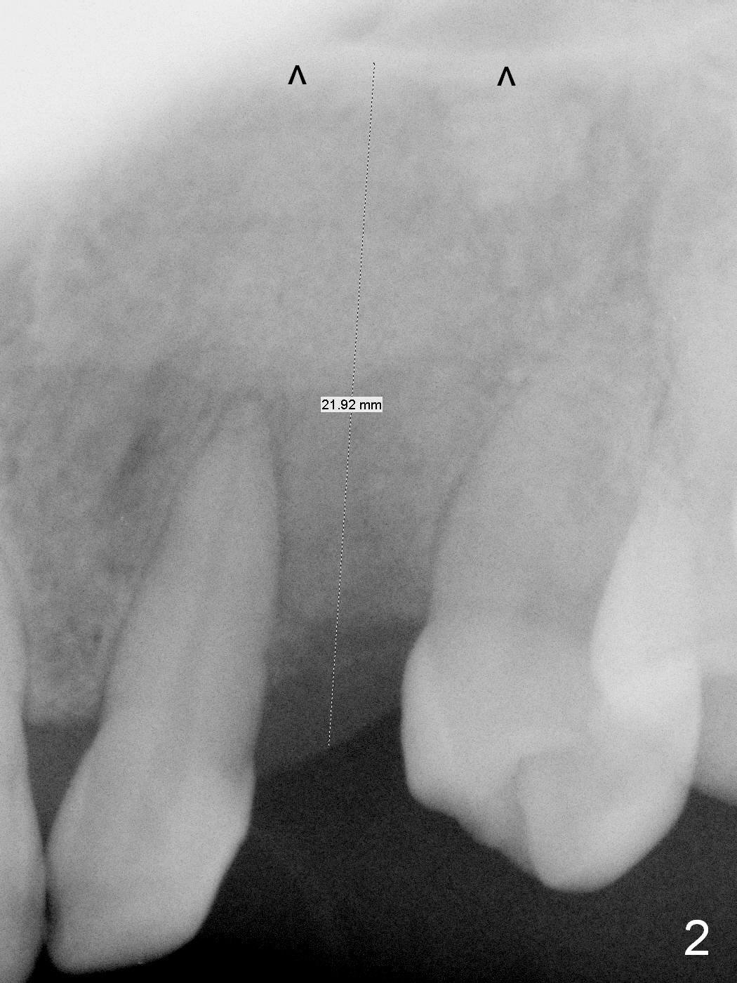 The ridge looks wide clinically 4 months post implant removal and socket preservation. In fact, the graft bone is soft and the ridge is narrow after incision. It appears that an angled 1 piece implant is an indication. A 1.2 mm pilot drill is used to start osteotomy. At approximately 17 mm, the patient feels pain. The nasal floor perforates? A 2 mm osteotome is utilized to enlarge the osteotomy. At 17 mm, the osteotome is stable (Fig.1), but the nasal floor appears out of view. Review of the preop PA shows that the distance between the gingival margin and the nasal floor (arrowheads) is ~22 mm (Fig.2). It should be safe and necessary to place a 3x20 mm 1-piece implant with 15° angulation. Insertion torque is between 40 and 45 Ncm.