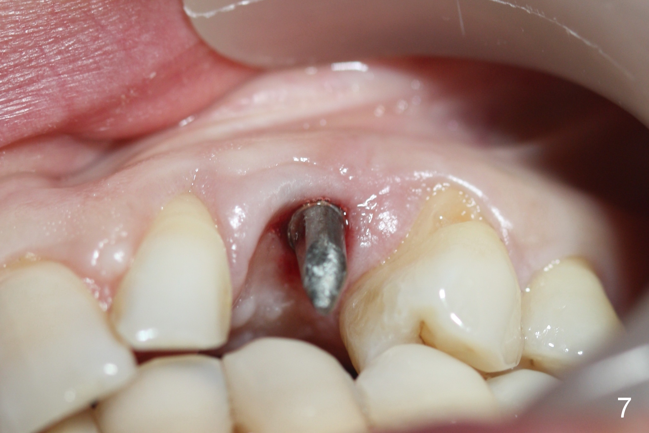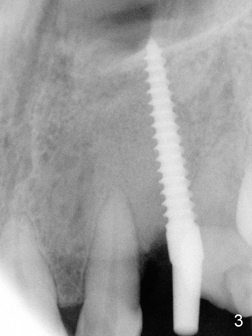 Intraop PA shows that the nasal floor is perforated (Fig.3). The patient experiences bilateral nasal obstruction. Sneezing produces trace of hemorrhage from the left nostril and large amount of secretion from both nostrils. The nasal speculum is misplaced in the clinic. Clinical nasal floor perforation cannot be confirmed. After abutment preparation, an immediate provisional is fabricated. Afrin is prescribed. Post-op instruction includes continuing Amoxicillin and Chlorhexidine rinse. A few hours postop, the patient reports no abnormality.
