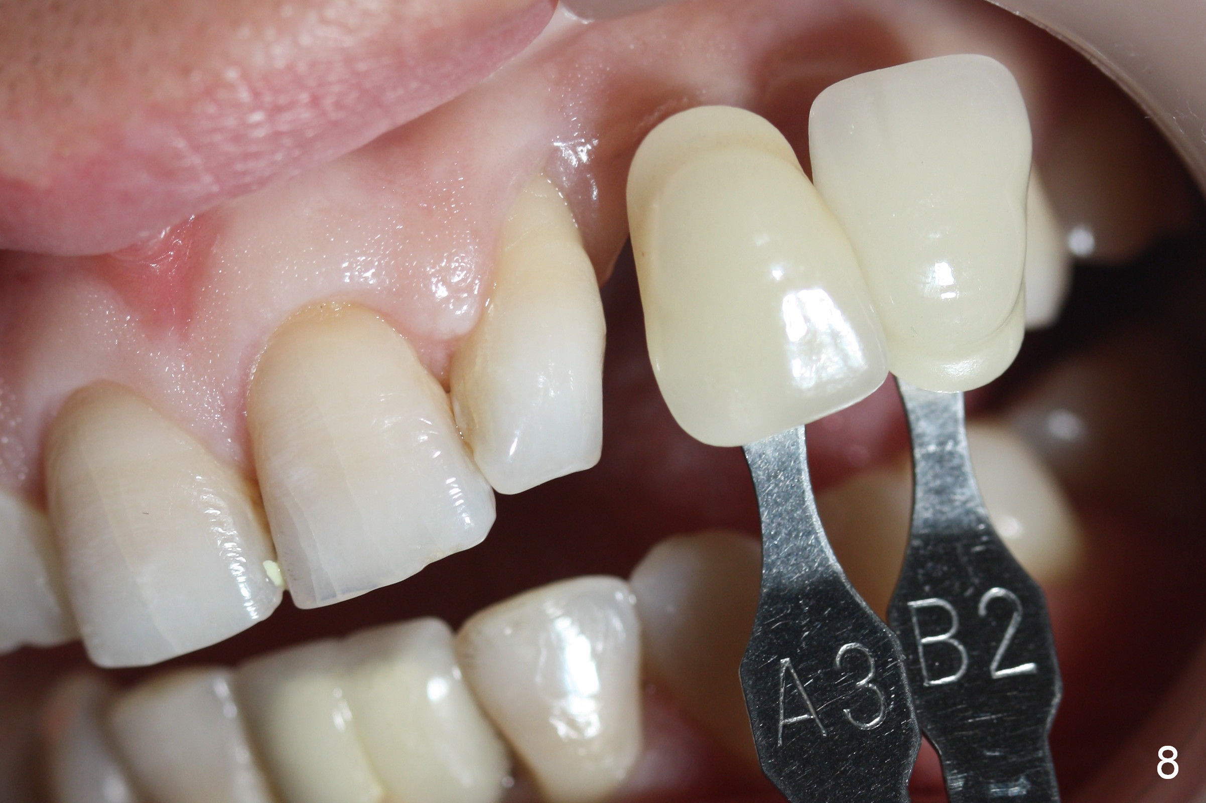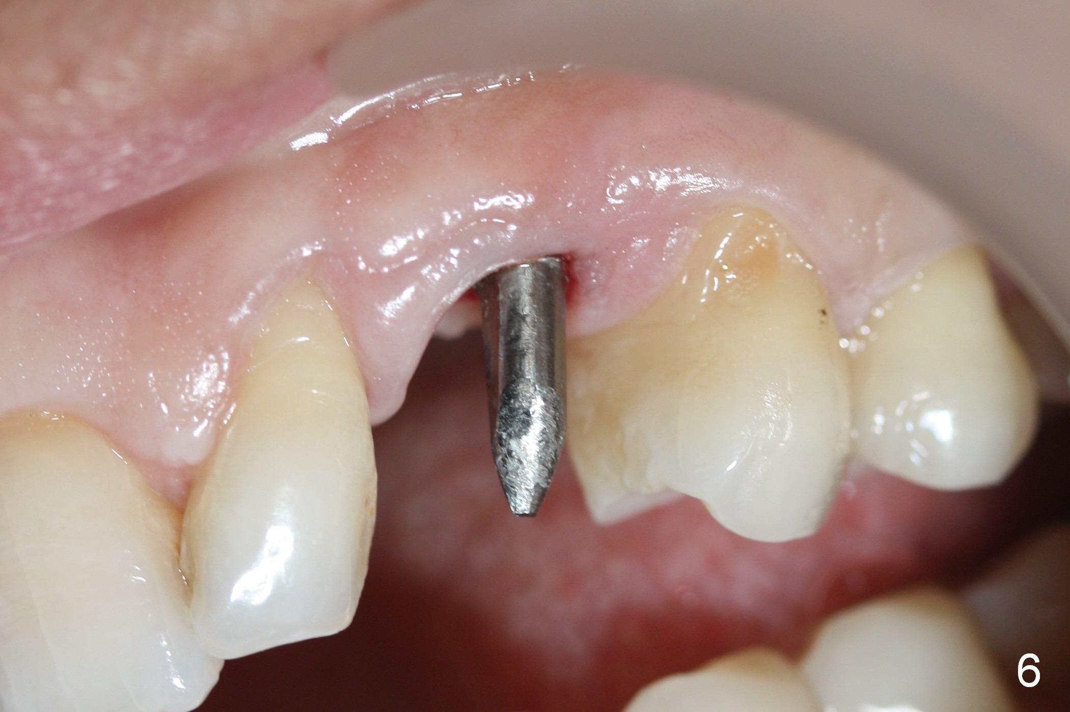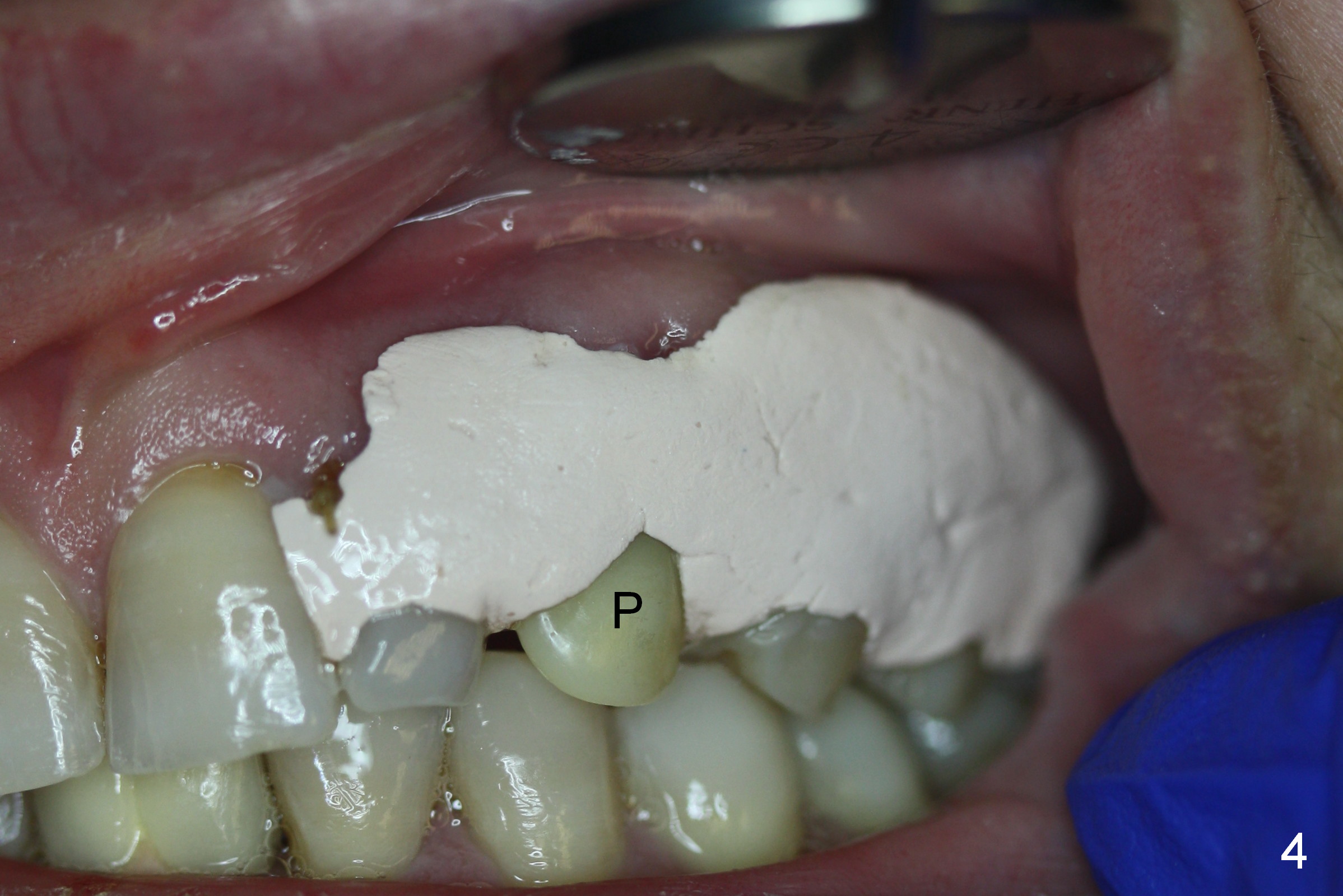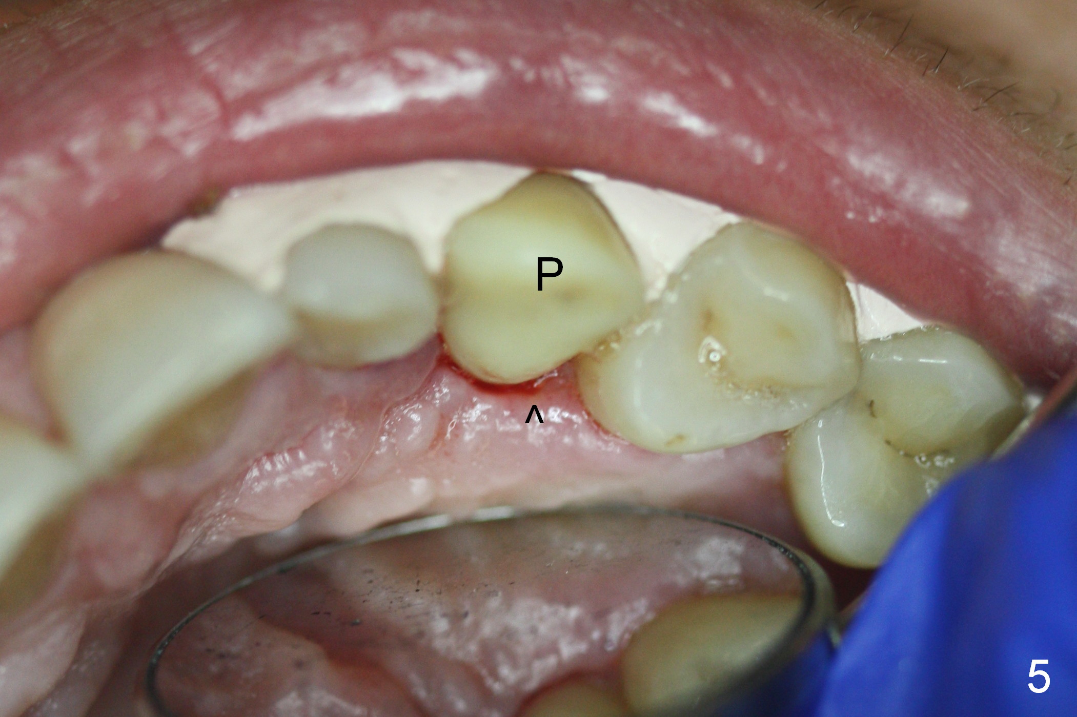 Six days postop, the patient is doing fine without nasal symptoms. Nasal speculum exam does not reveal apparent nasal floor perforation. The perio dressing remains around the provisional (Fig.4,5 P). Local scaling is provided for slightly tender palatal gingiva between the provisional and the neighboring tooth (Fig.5 ^). Continuous Chlorhexidine rinse is recommended.