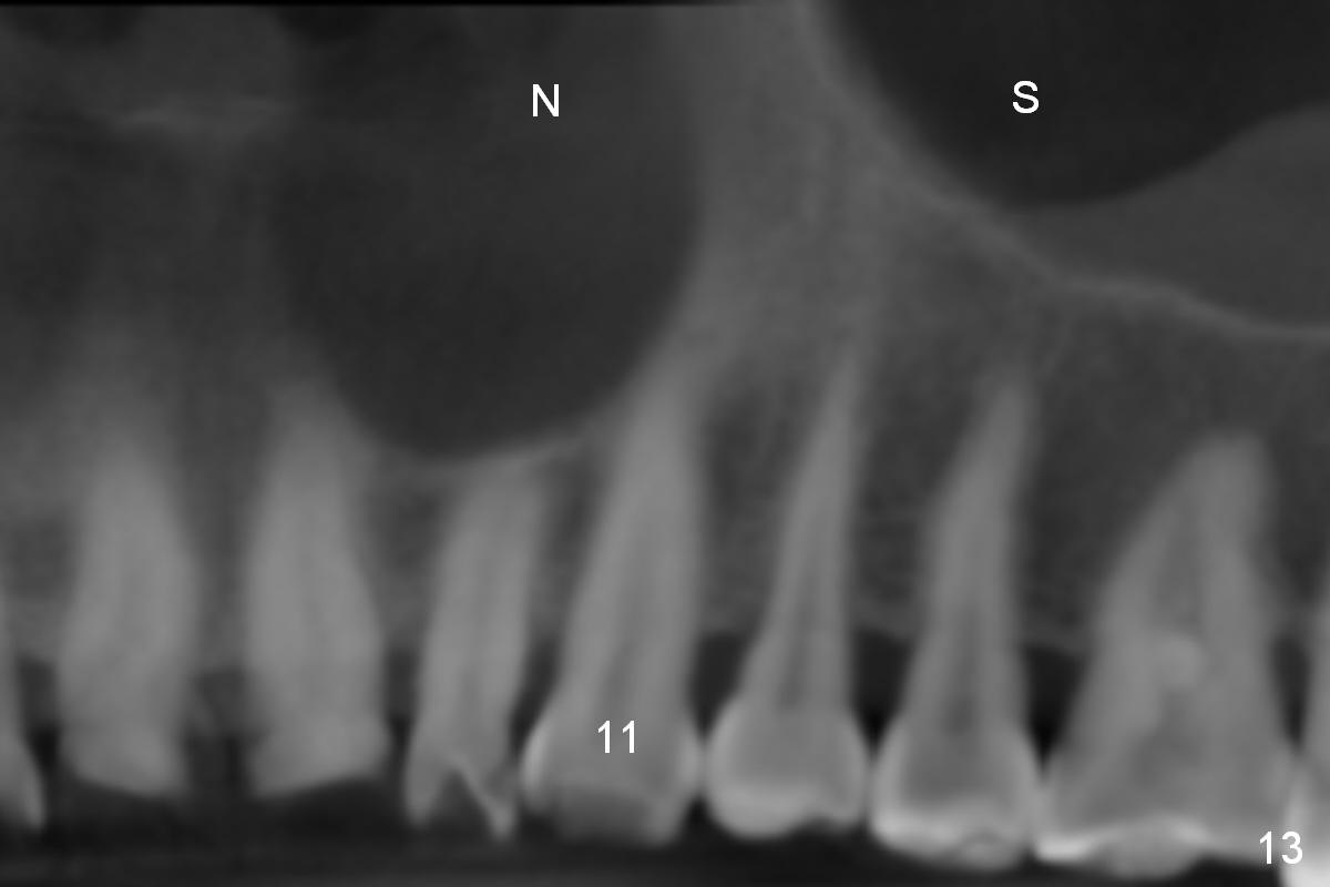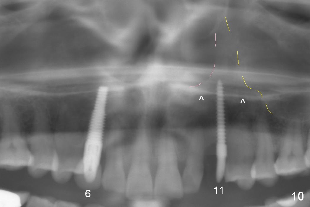Eight months postop, the patient returns for #11 restoration. She reports no problem at #11, while there is light tenderness with a 2-piece implant (4.5x20 mm) at #6 at night (Fig.10, a portion of panoramic X-ray). Clinical exam reveals no abnormality at #6. Although the implant at #11 is buccally placed, there is no buccal plate atrophy (Fig.6,7). In fact the 20 mm 1-piece implant is placed in the bone (septum) between the nasal cavity (Fig.10 pink dashed line; Fig.13 (CBCT (52 year-old lady) N) and the maxillary sinus (yellow dashed line, S). In fact the apparent nasal floor indicated as arrowheads in Fig.2 and 10 is the horizontal plate of the palatine bone (hard palate)! Therefore there is no nasal floor perforation in this case. A long implant is indicated in the upper canine.