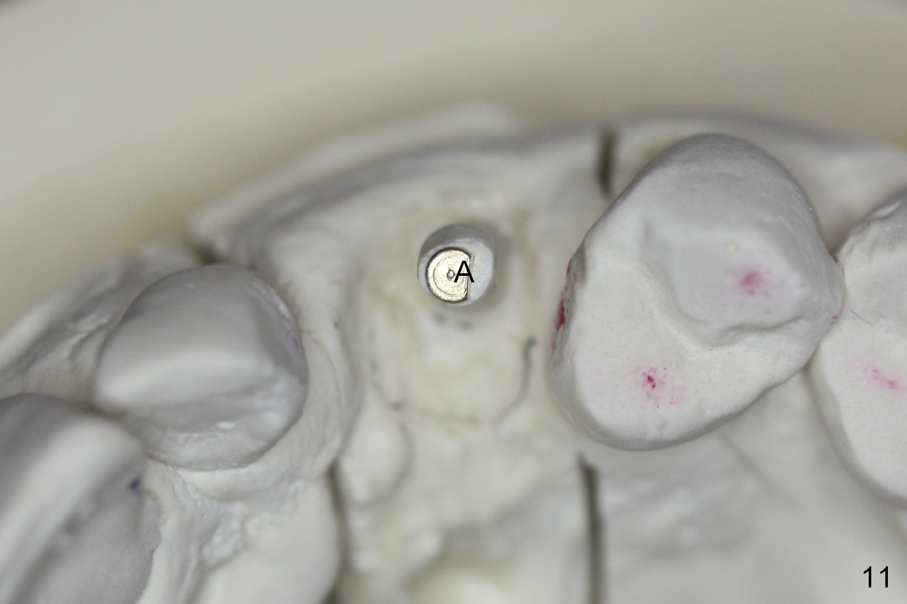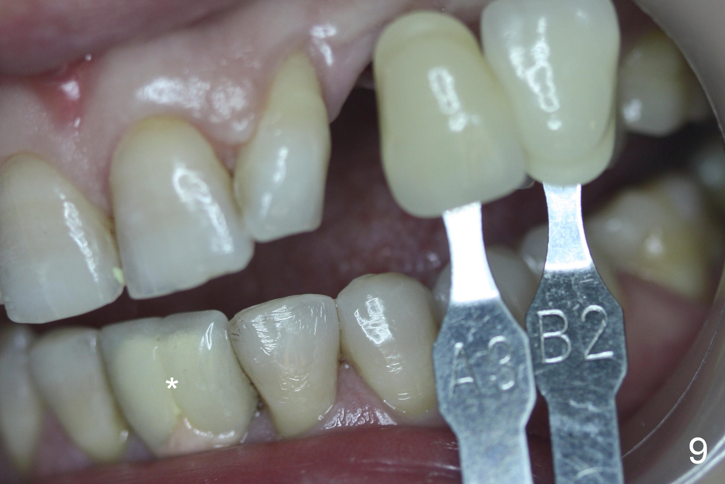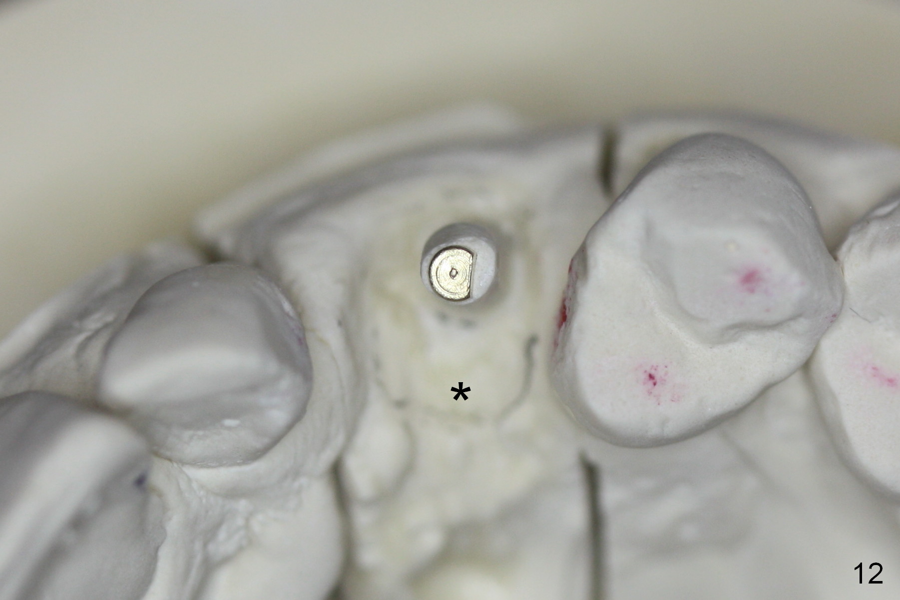 The main reason for the failure of this case is buccal placement of the implant (Fig.11 A: abutment). Every time an implant is placed at the upper anterior, make sure that palatal placement is done (Fig.12 *). The most critical step is the 1st pilot drill. If the position is not ideal, use a Lindemann bur for adjustment. Check repeatedly. If the implant starts to be deviated buccally, remove the implant, use the Lindemann bur to remove more of the palatal bone and place the implant palatally.