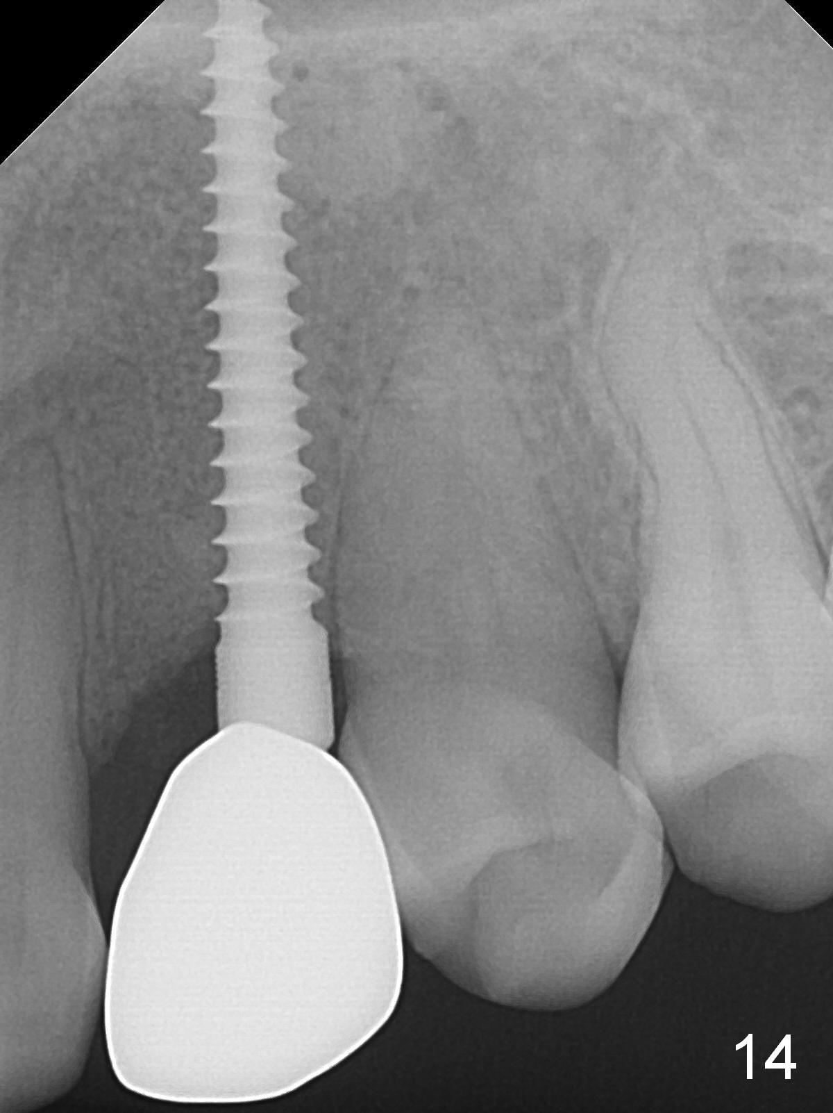 There is no gingival recesssion (data not shown) or bone loss around the implant 1 year post cementation (Fig.14).