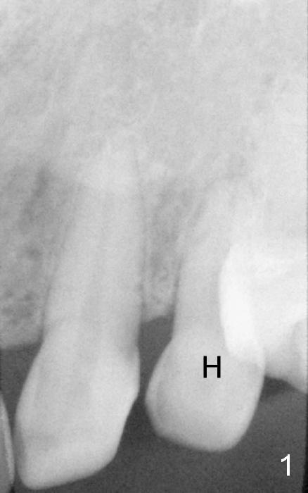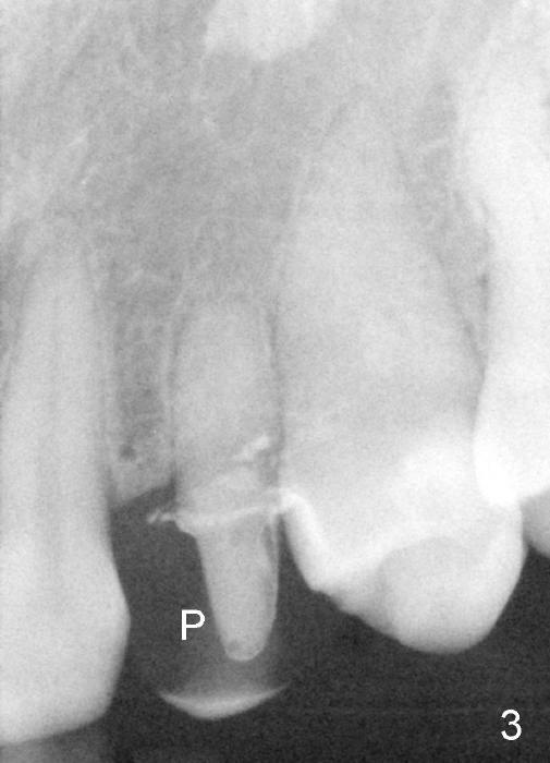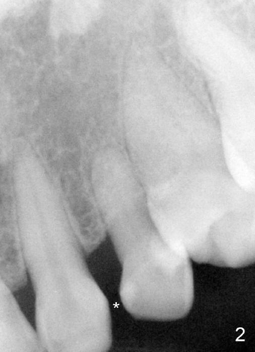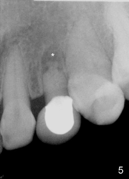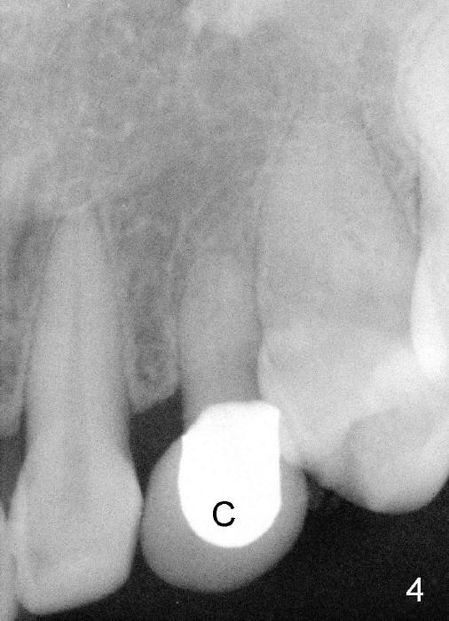 The upper left deciduous canine of a lady in her early forties looks functional 9 and 5 years ago (Fig.1,2). She wanted to close the diastema mesial to the deciduous tooth (Fig.2 *). The tooth was prepared for a provisional (Fig.3 P) and definitive restoration (Fig.4 C). The tooth becomes mobile 4 years post cementation (Fig.5).