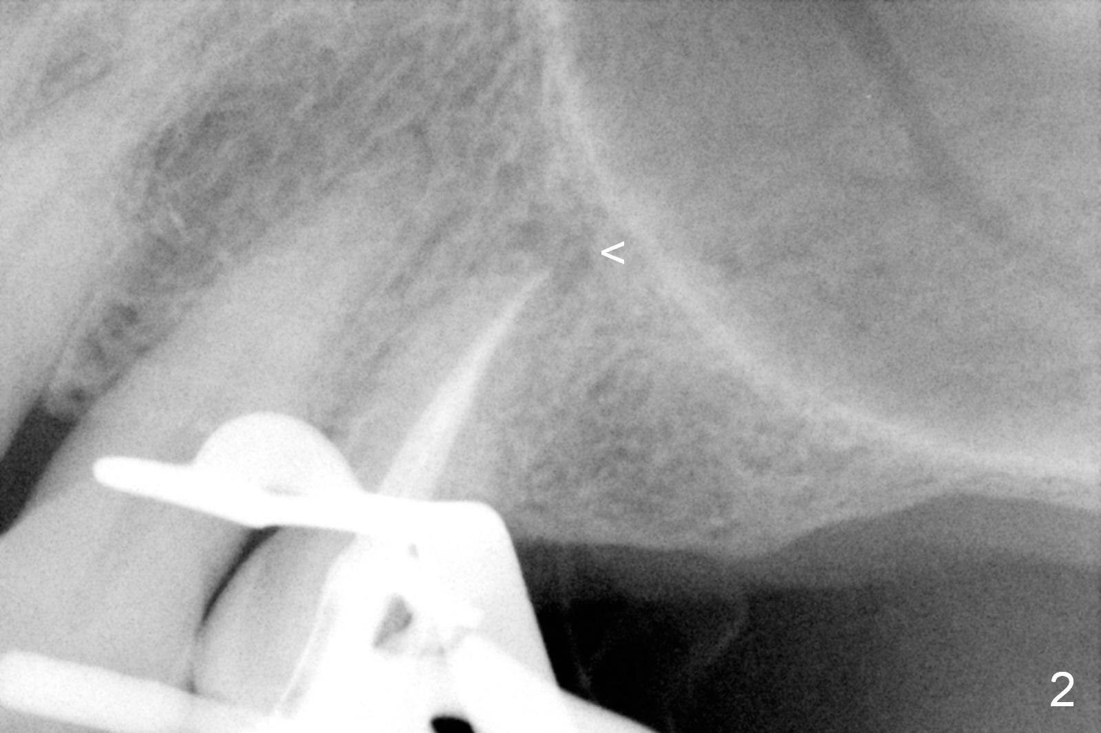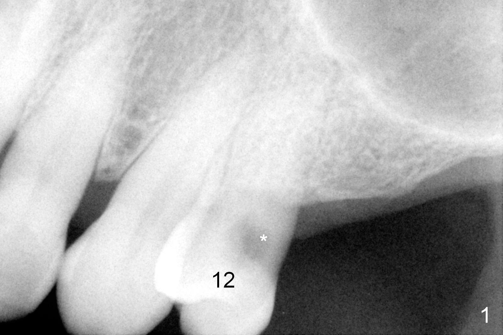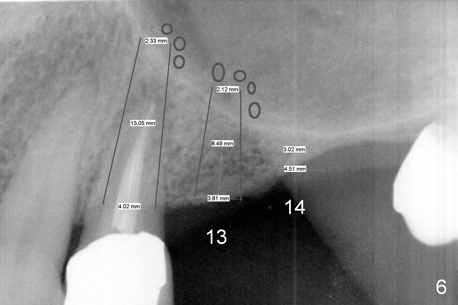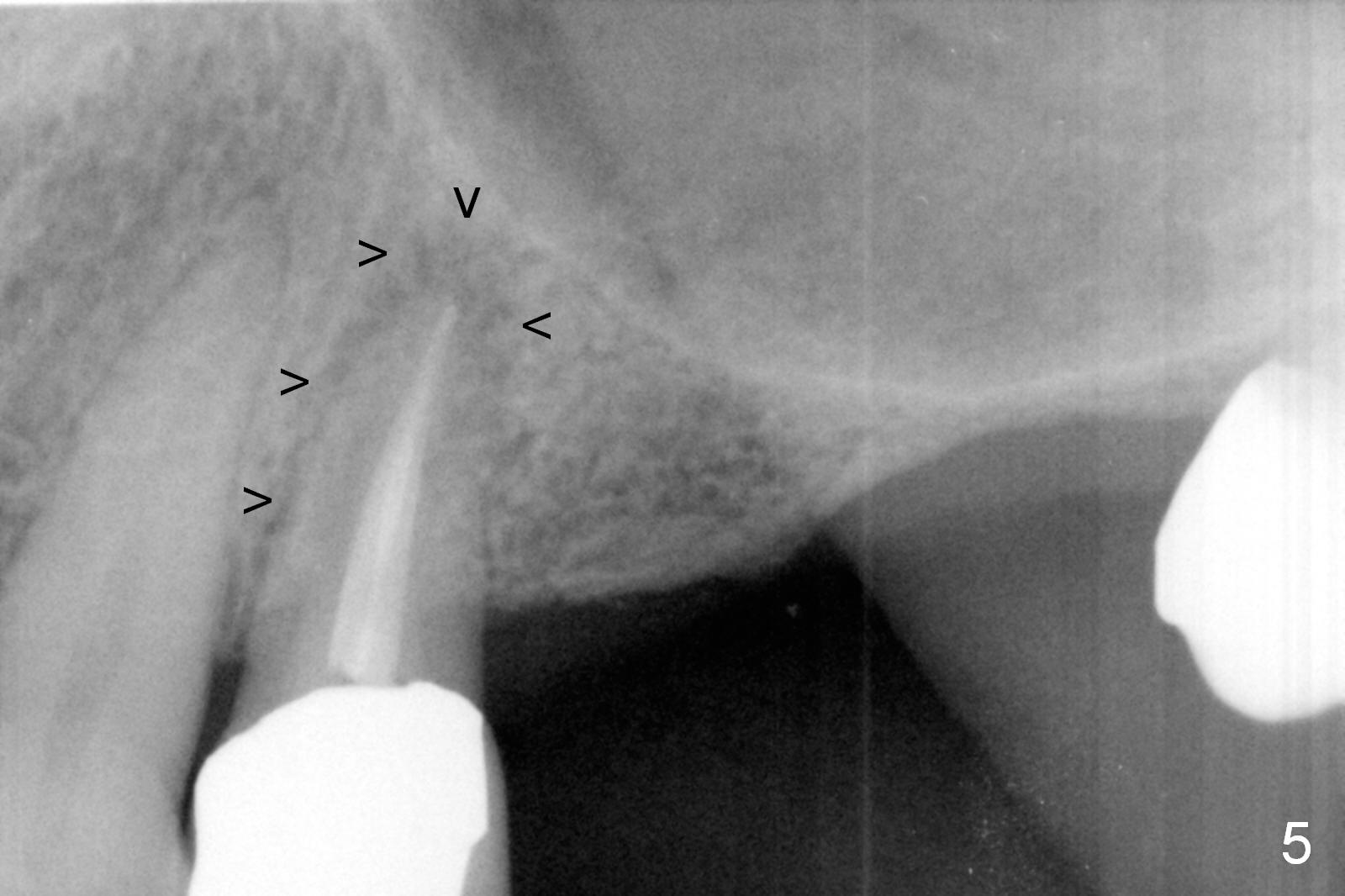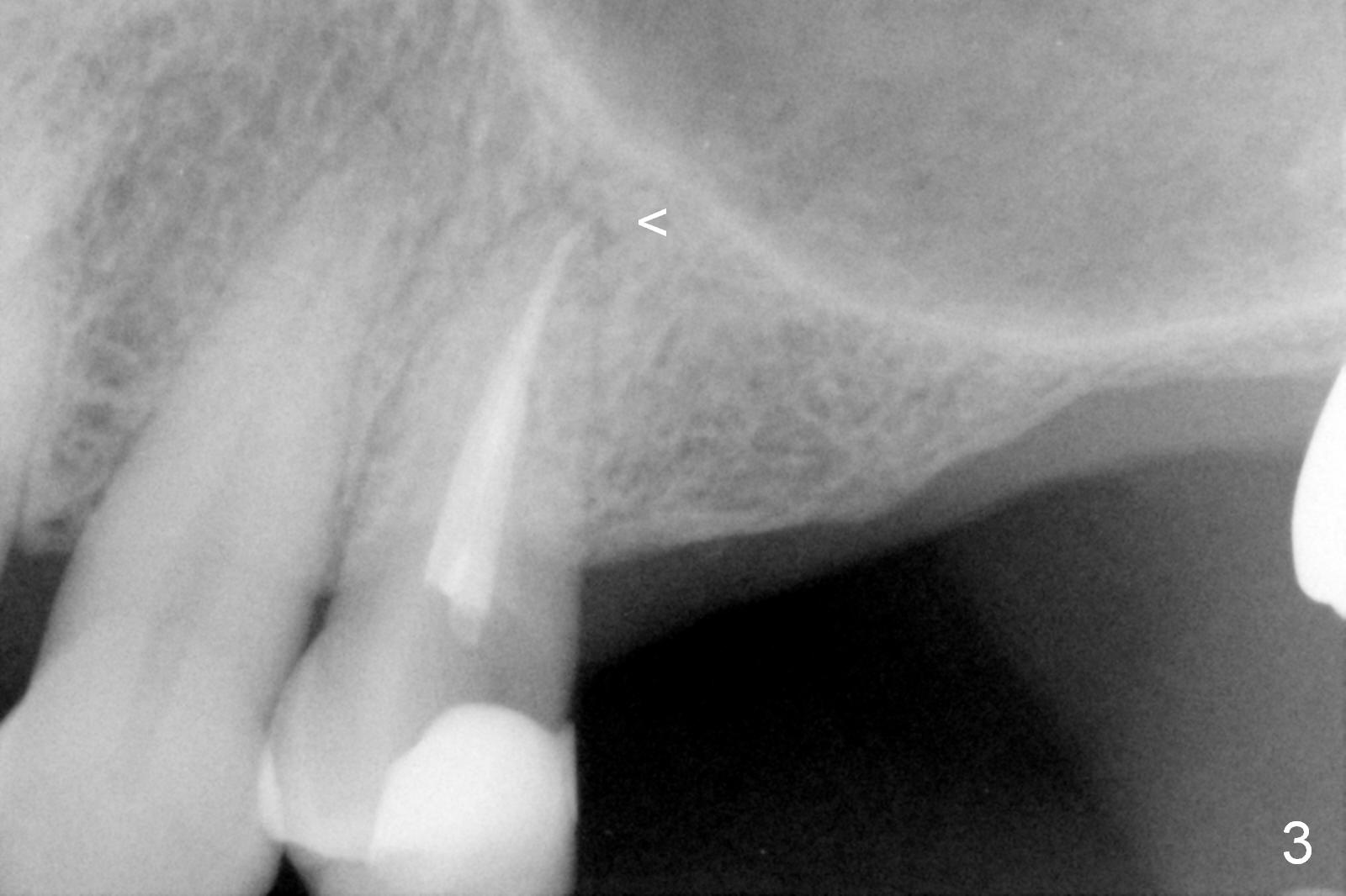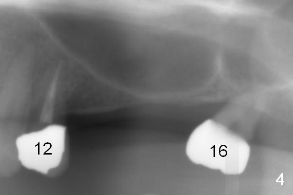 A 64-year-old man (MM) had caries at the tooth #12 (Fig.1), requiring root canal therapy (RCT, Fig.2). One year later, the periapical radiolucency reduces (Fig.3 <, as compared to that in Fig.2). The tooth remains asymptomatic 7 years posts RCT (Fig.4). A year later, the tooth has pain and buccal gingival swelling (probing tenderness); periradicular radiolucency is evident (Fig.5 arrowheads). It appears that the root fractures. Between the 7th and 8th years post RCT, the patient masticated mainly on the left side, while implants were placed at #30 and 31. The patient plans to have 4 implants in the upper left sextant (Fig.6). While implants are being placed at the site of #12 (Clindamycin) and 13, sinus lift seems mandatory at the sites of #13 and (initial depth will be 5-6 mm). By the time implants to be placed at #14 and #15, the bone height may increase.
