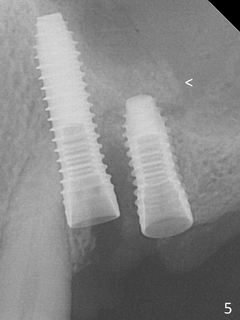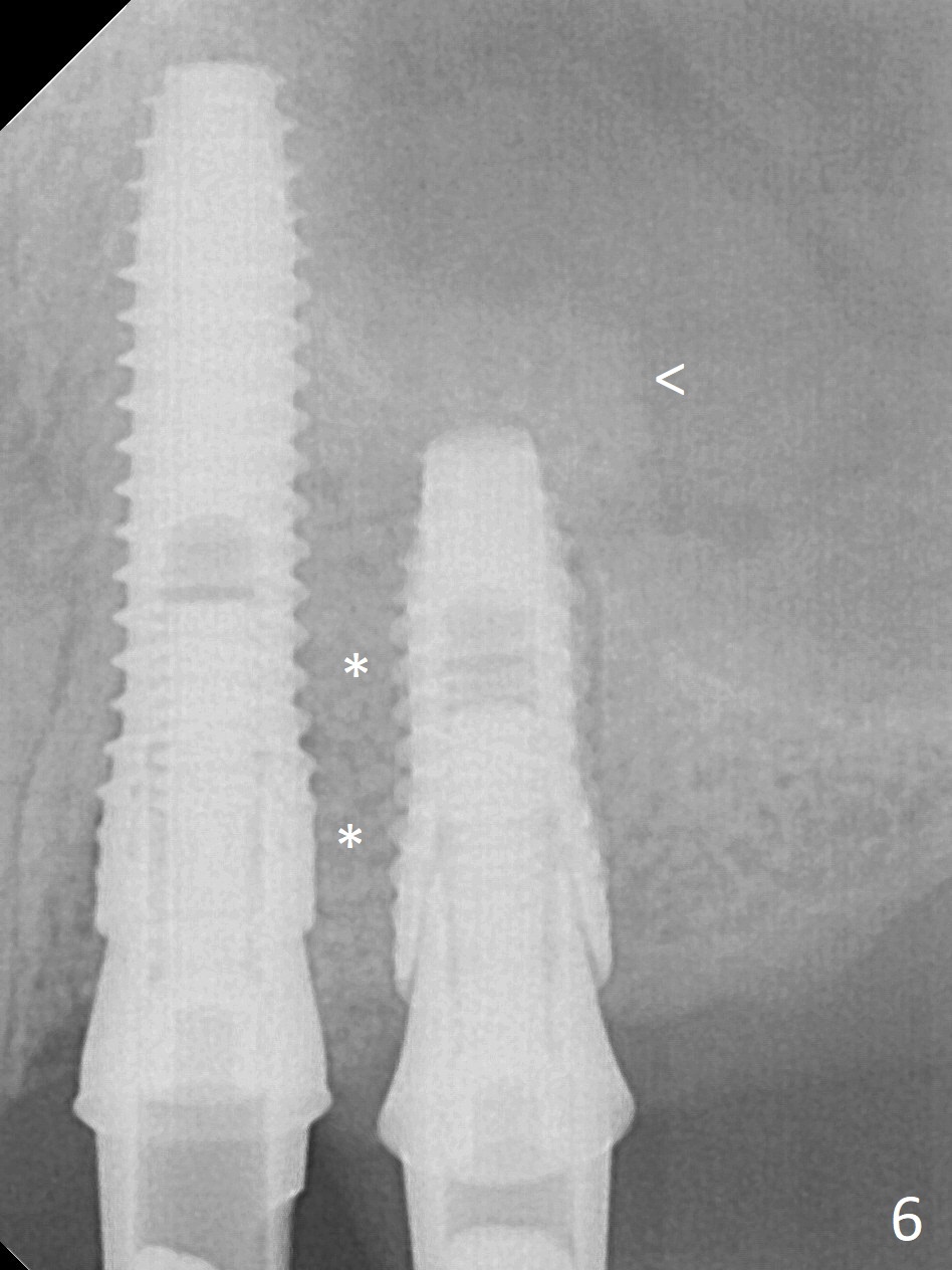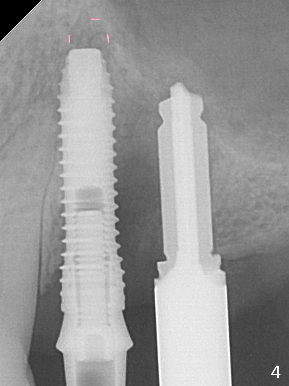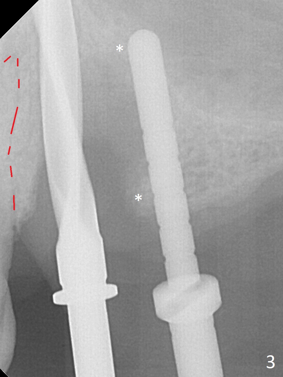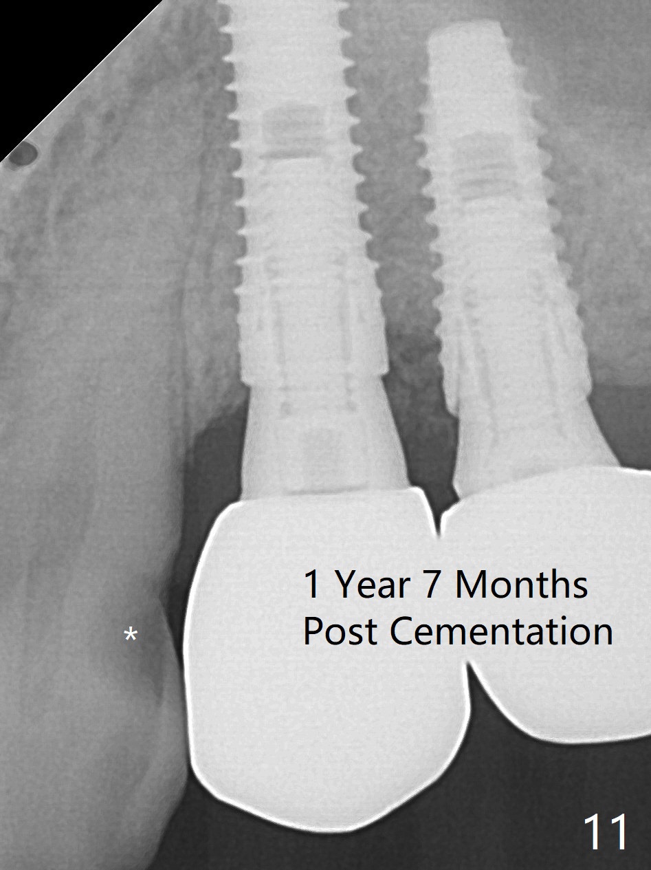 The buccal gingiva at #12 with vertical root fracture looks unhealthy (Fig.1). Osteotomy at #13 is initiated prior to #12 extraction. In fact the osteotomy happens in the extensive defect associated with #12 (Fig.2 red dashed line). To obtain primary stability, the osteotomy at #12 needs to be long, while that at #13 needs two-pointed fixation (Fig.3 *). After adjustment of trajectory at #12 and increase in diameter of the osteotomy at #13 (Fig.4), a 3.8x15 and 3.8x10 mm implants are placed (Fig.5). Following adjustment of implant depth (Fig.6), the implant at #12 becomes loose, while that at #13 tightens. With placement of abutments, an immediate splinted provisional is locked in place to stabilize the loose implant at #12 (Fig.7). The patient complains of cold sensitivity in the upper left quadrant, possibly related to the fact that the implant at #12 is close to the apex of the tooth #11. The position and trajectory of the initial osteotomies should be changed as shown in Fig.8 (white lines, as compared to Fig.2). There is no sensitivity 1 month postop. Impression is taken 4 months postop (Fig.9) after #13 mesiobuccal margin prep. The implants were placed too close to each other. The abutment screw at #13 is retightened 8 months post cementation. There appears no bone loss 9 months post cementation (Fig.10), while the tooth #11 has periapical infection with DL caries 1 year 7 months post cementation (Fig.11).