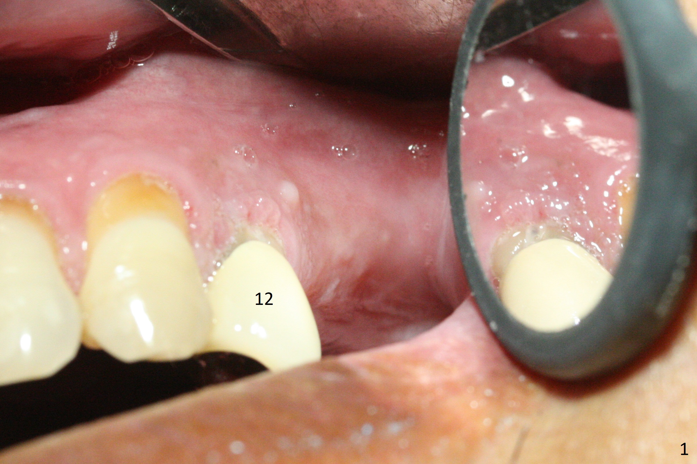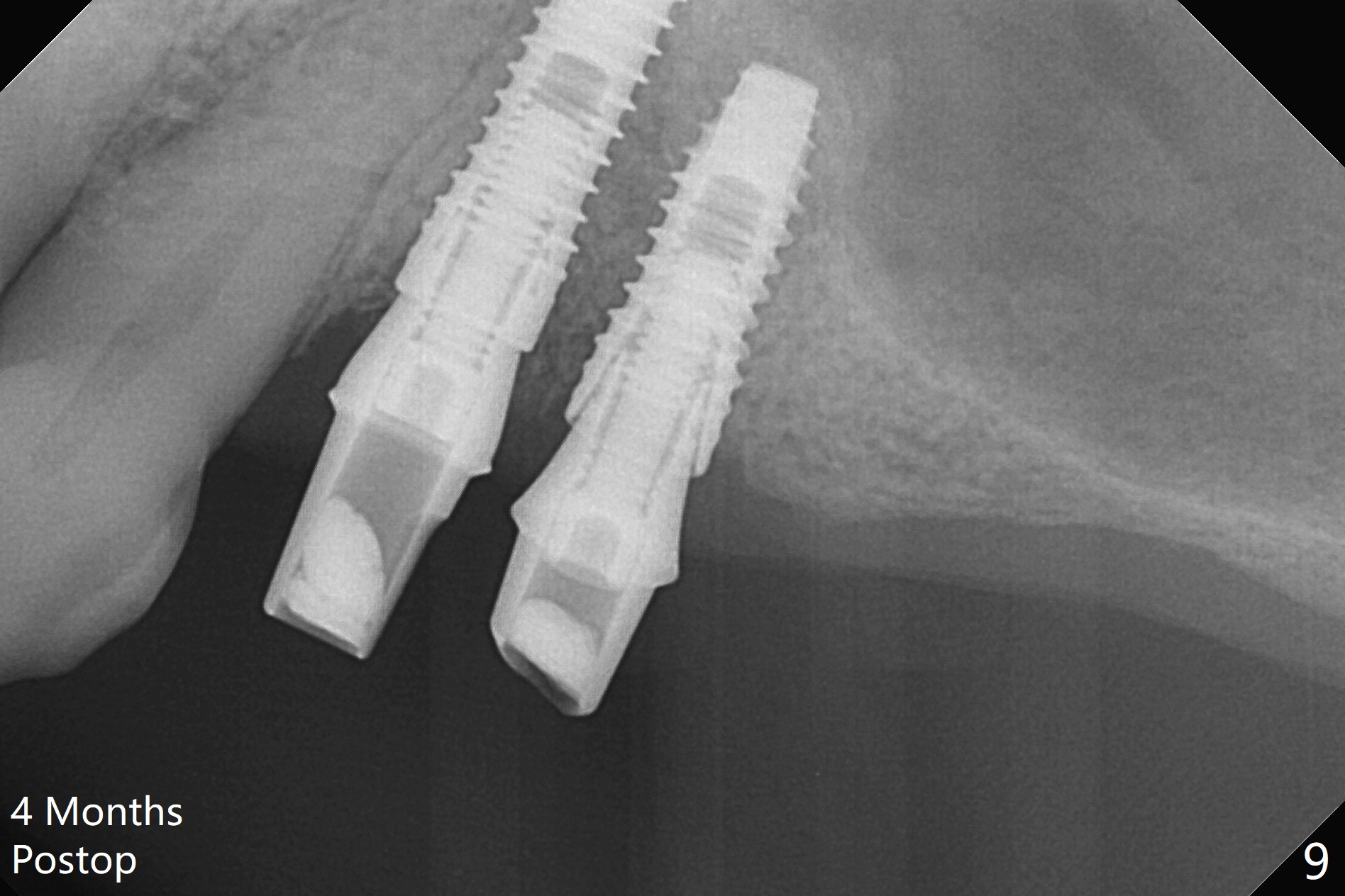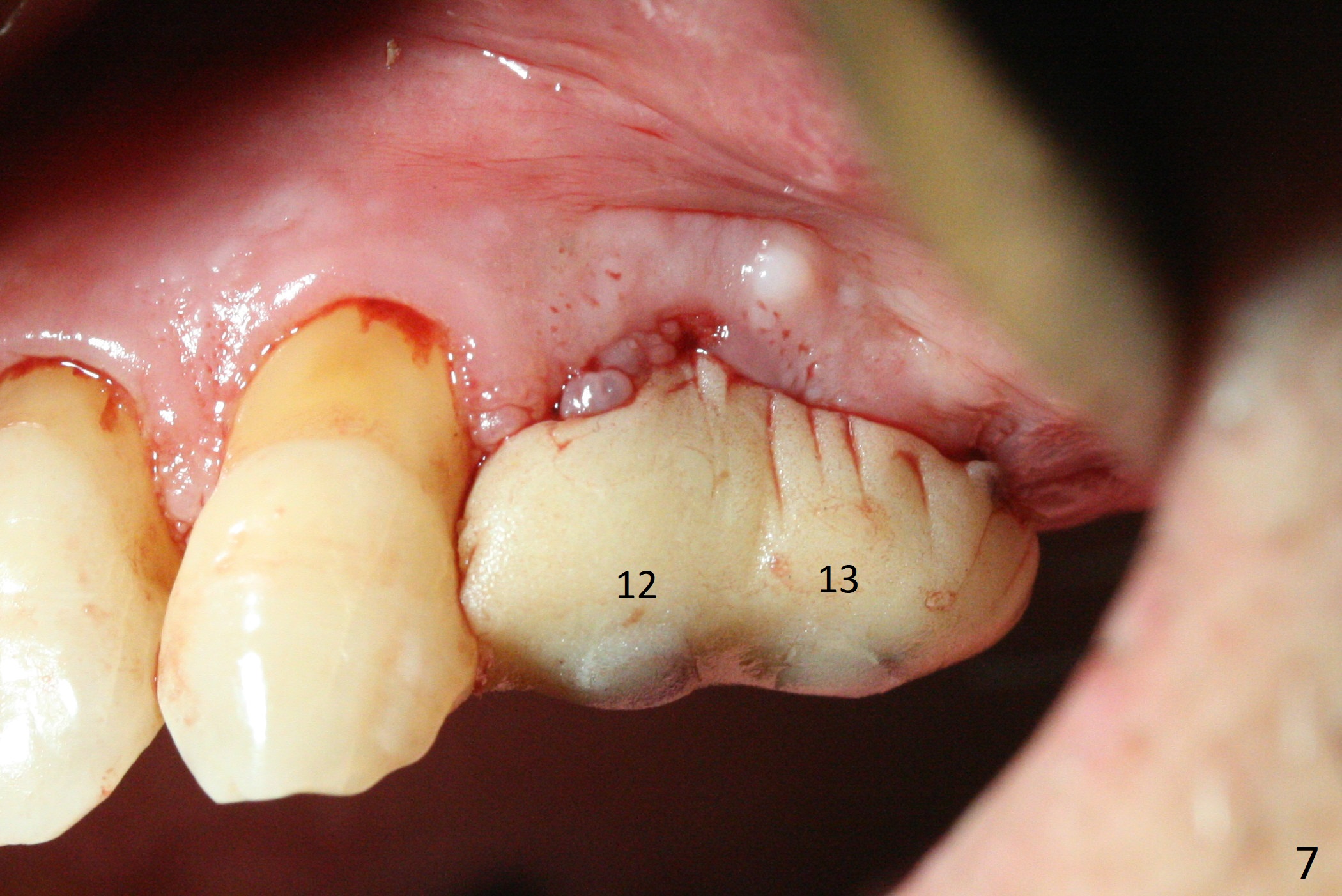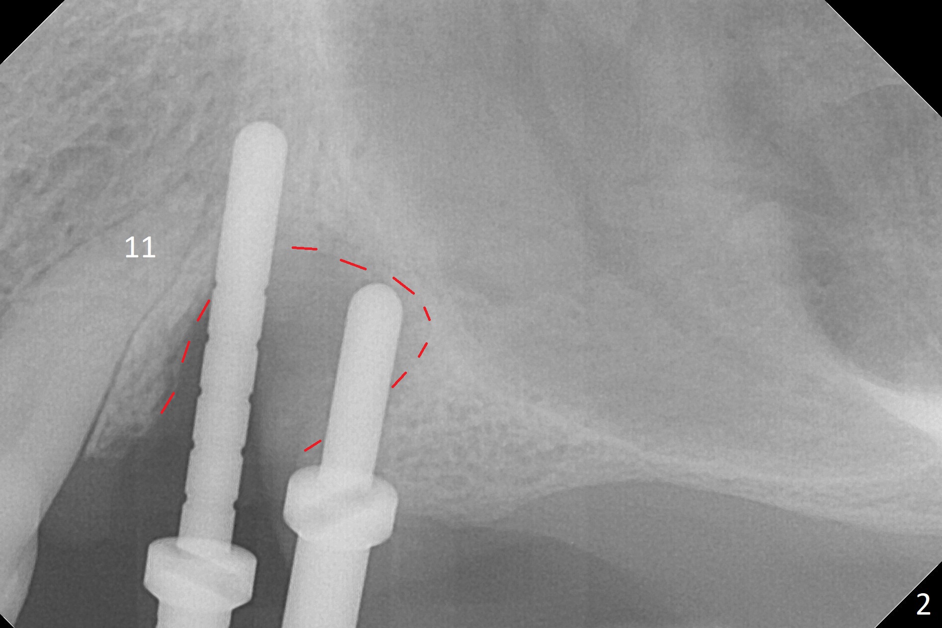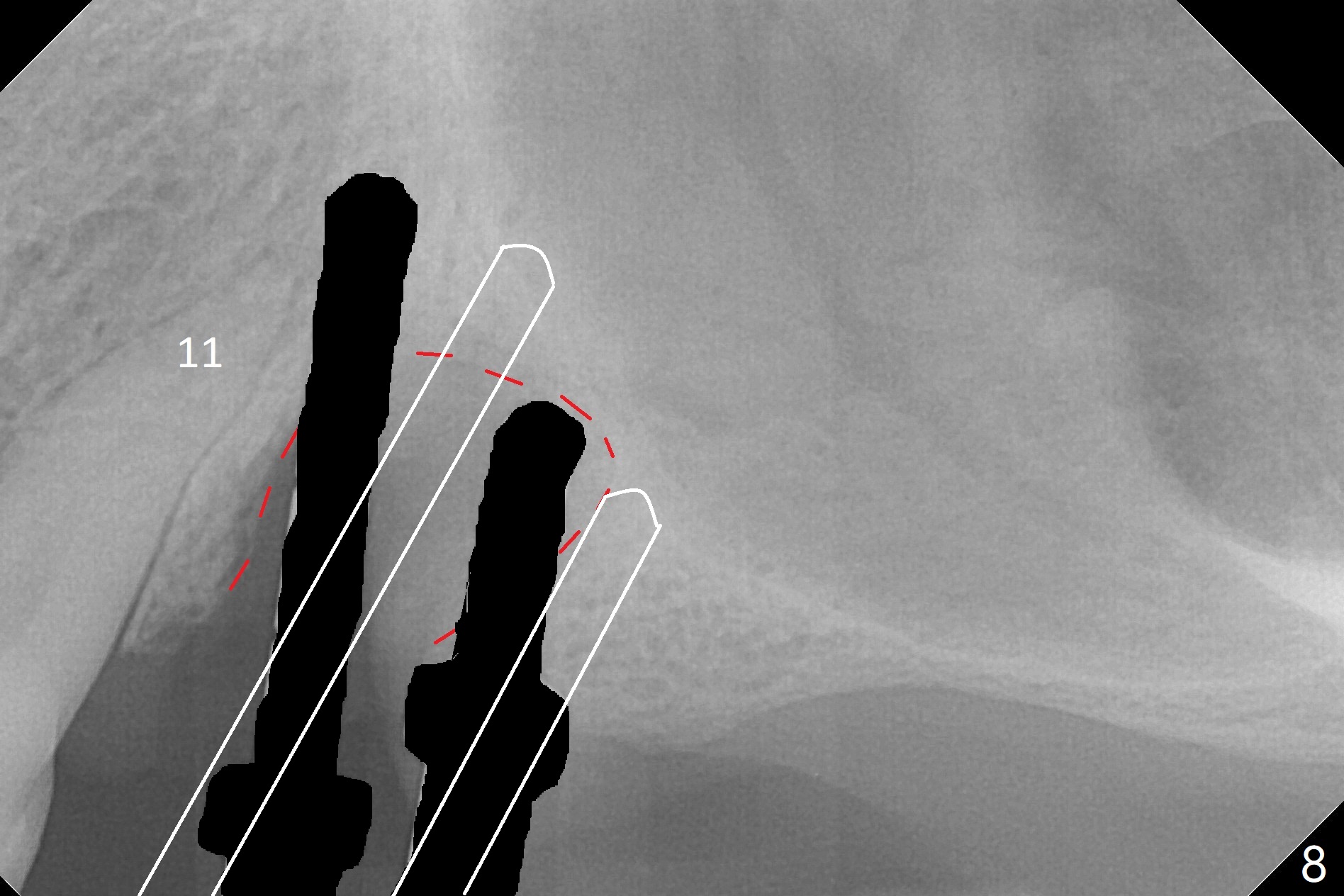 The buccal gingiva at #12 with vertical root fracture looks unhealthy (Fig.1). Osteotomy at #13 is initiated prior to #12 extraction. In fact the osteotomy happens in the extensive defect associated with #12 (Fig.2 red dashed line). To obtain primary stability, the osteotomy at #12 needs to be long, while that at #13 needs two-pointed fixation (Fig.3 *). After adjustment of trajectory at #12 and increase in diameter of the osteotomy at #13 (Fig.4), a 3.8x15 and 3.8x10 mm implants are placed (Fig.5). Following adjustment of implant depth (Fig.6), the implant at #12 becomes loose, while that at #13 tightens. With placement of abutments, an immediate splinted provisional is locked in place to stabilize the loose implant at #12 (Fig.7). The patient complains of cold sensitivity in the upper left quadrant, possibly related to the fact that the implant at #12 is close to the apex of the tooth #11. The position and trajectory of the initial osteotomies should be changed as shown in Fig.8 (white lines, as compared to Fig.2). There is no sensitivity 1 month postop. Impression is taken 4 months postop (Fig.9) after #13 mesiobuccal margin prep. The implants were placed too close to each other. The abutment screw at #13 is retightened 8 months post cementation. There appears no bone loss 9 months post cementation (Fig.10), while the tooth #11 has periapical infection with DL caries 1 year 7 months post cementation (Fig.11).