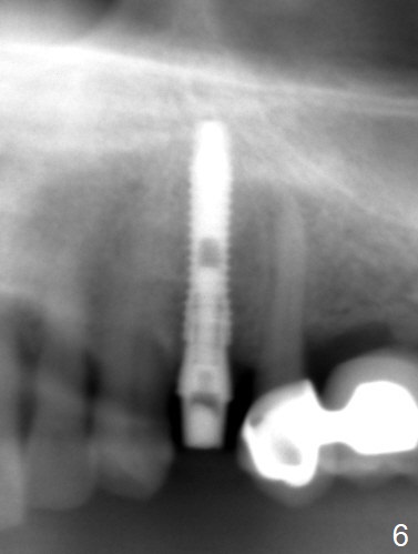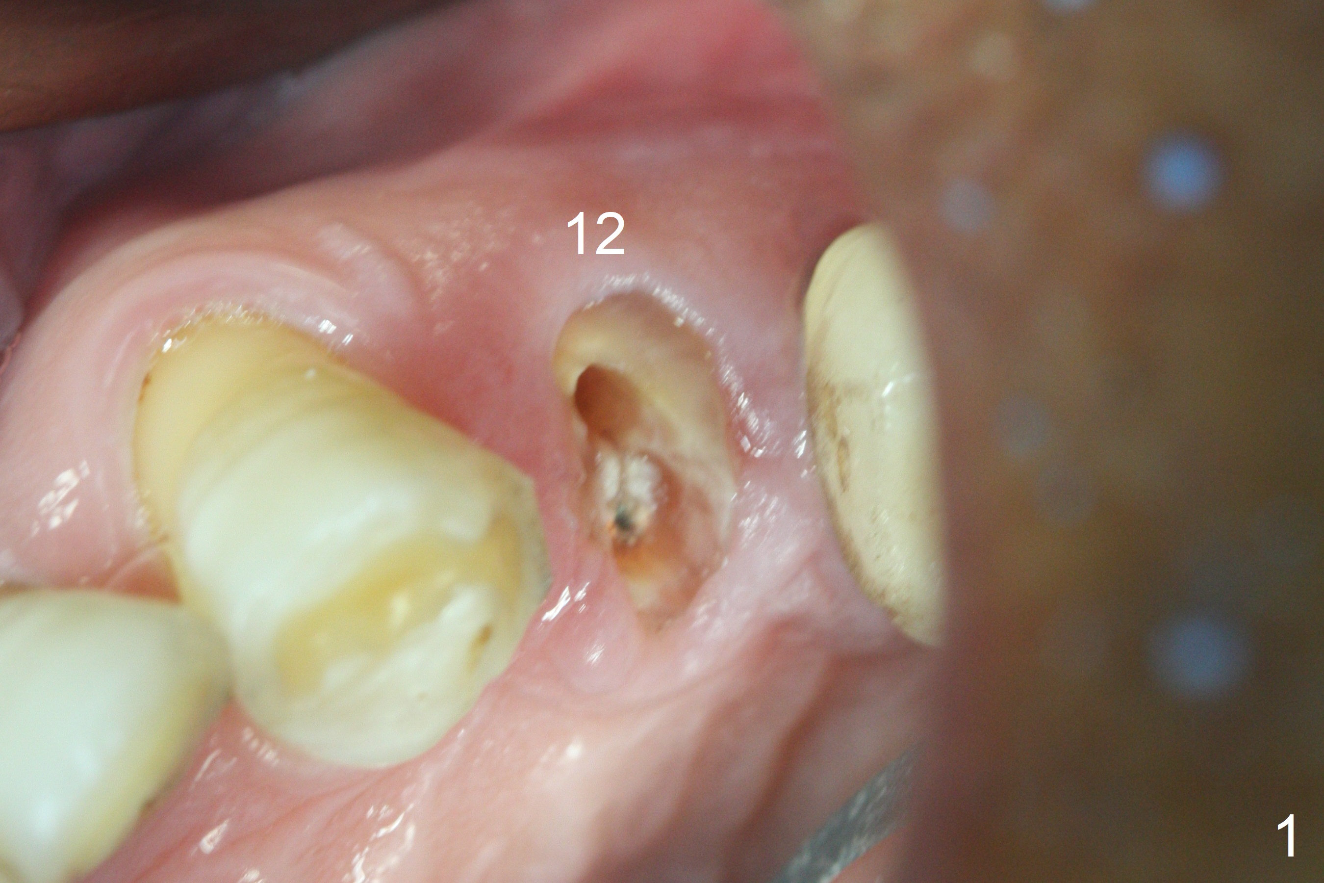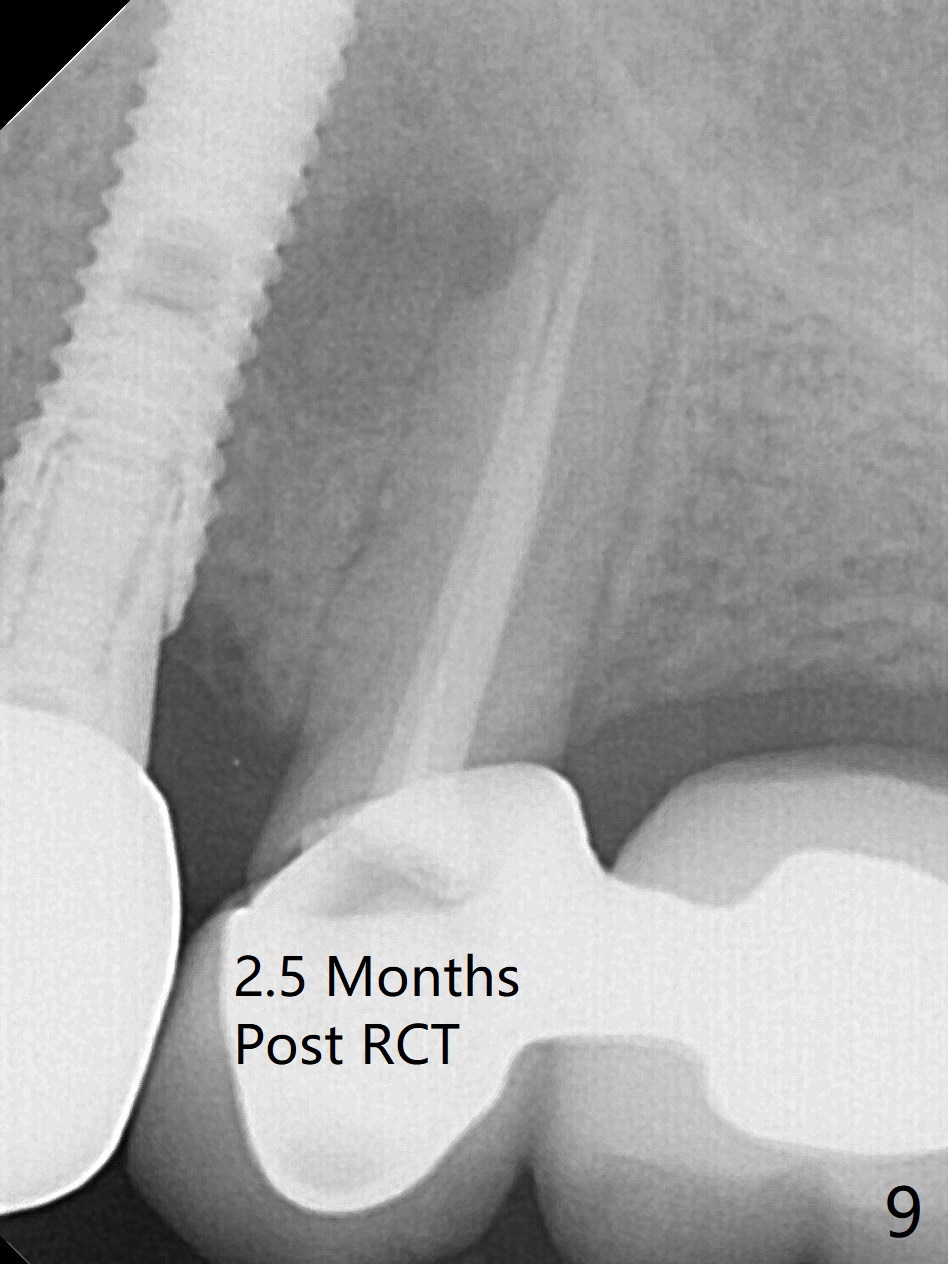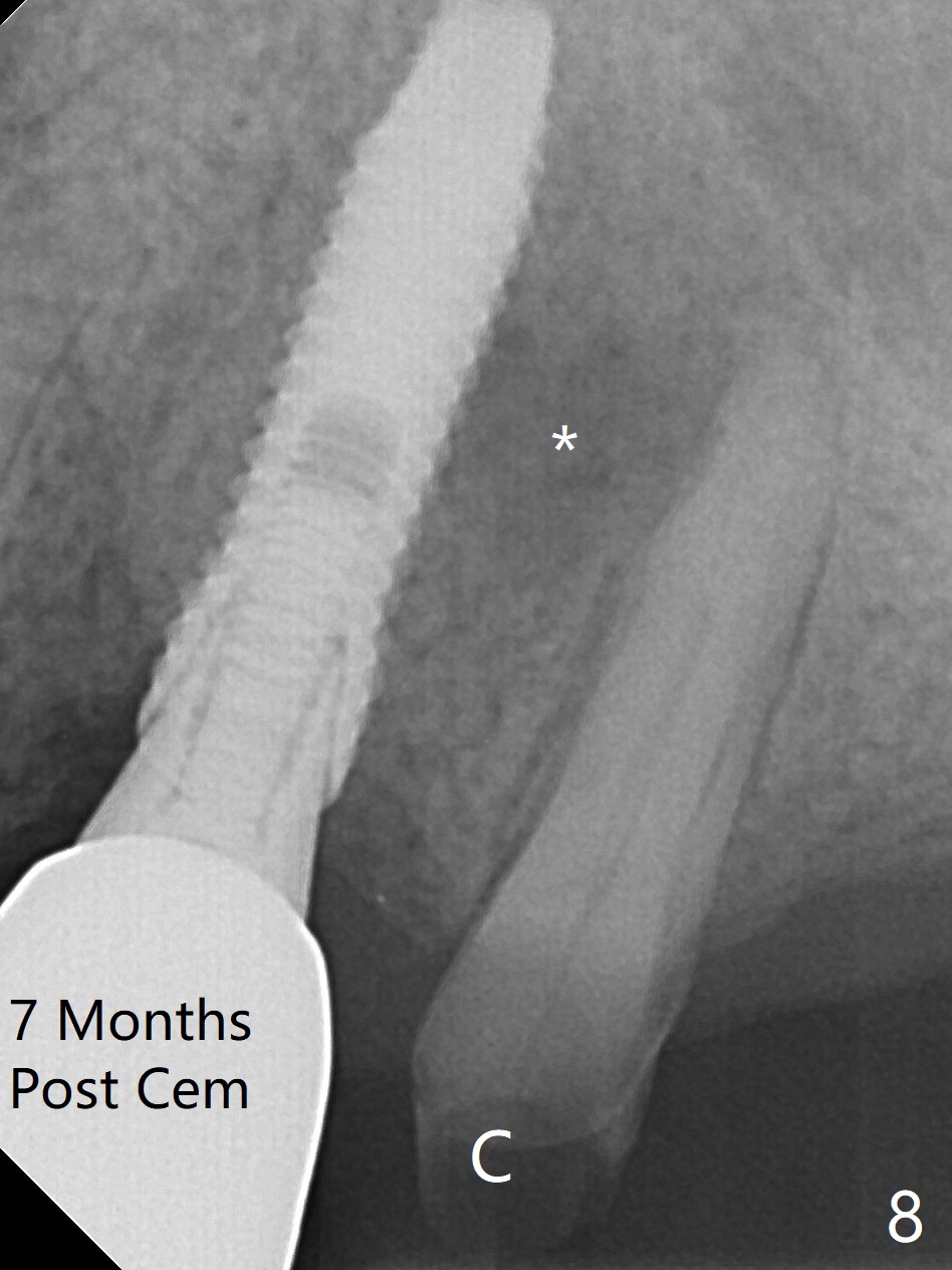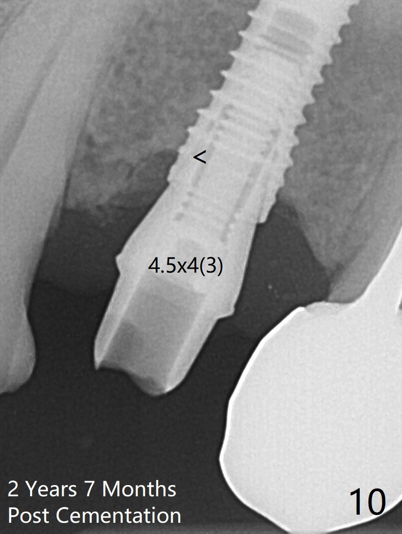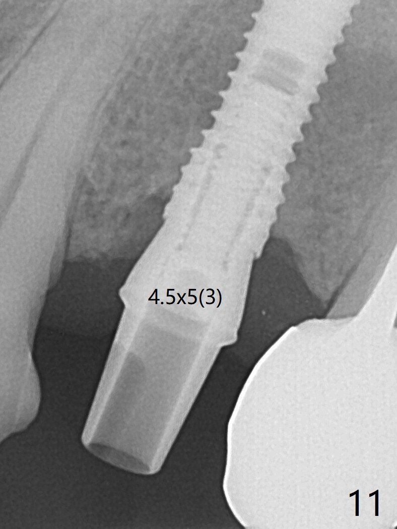 After extraction of the oval-shaped residual roots at #12 (Fig.1), osteotomy is initiated in the palatal socket for 18 mm; since the root of the canine curves distal (Fig.2 red dashed line), the osteotomy cannot afford to move mesial and extend more apical. A 3.8x15 mm implant is placed with > 50 Ncm (Fig.3). With immediate placement of a 4.5x4(3) mm abutment, an immediate provisional is fabricated to close the sockets (Fig.4 P). The provisional has clearance from the RPD clasps (Fig.5). In fact the implant could be longer, as shown by immediately postop panoramic X-ray (Fig.6). The implant seems to be osteointegrated 3 months postop (Fig.7). The tooth #13 is symptomatic with caries (Fig.8 C) 7 months post #12 crown cementation; the #13-15 FPD dislodges. The upper left quadrant is cold and hot sensitive 2.5 months post RCT (Fig.9); although there is mild percussion at #13, pulpal test shows that the tooth #15 has lingering pain. The FPD was recemented temporarily after RCT; it cannot be removed. The implant crown has been loose for several months during the pandemic before he returns 2 years 7 months post cementation. In fact the abutment has been not seated completely (from Fig.3 to 9). The crown/abutment is removed from the mouth; the crown is sectioned and separated from the abutment; the latter is reseated, but incompletely (Fig.10 <). With suspicion of the mesial crestal contact, profile drills 4.6 and 5.5 mm are used without effect. A new (old probably being worn) and longer (easy to turn in the narrow space) abutment is finally seated completely (Fig.11 (no gap)). After occlusal adjustment, abutment level impression is taken for a new crown.