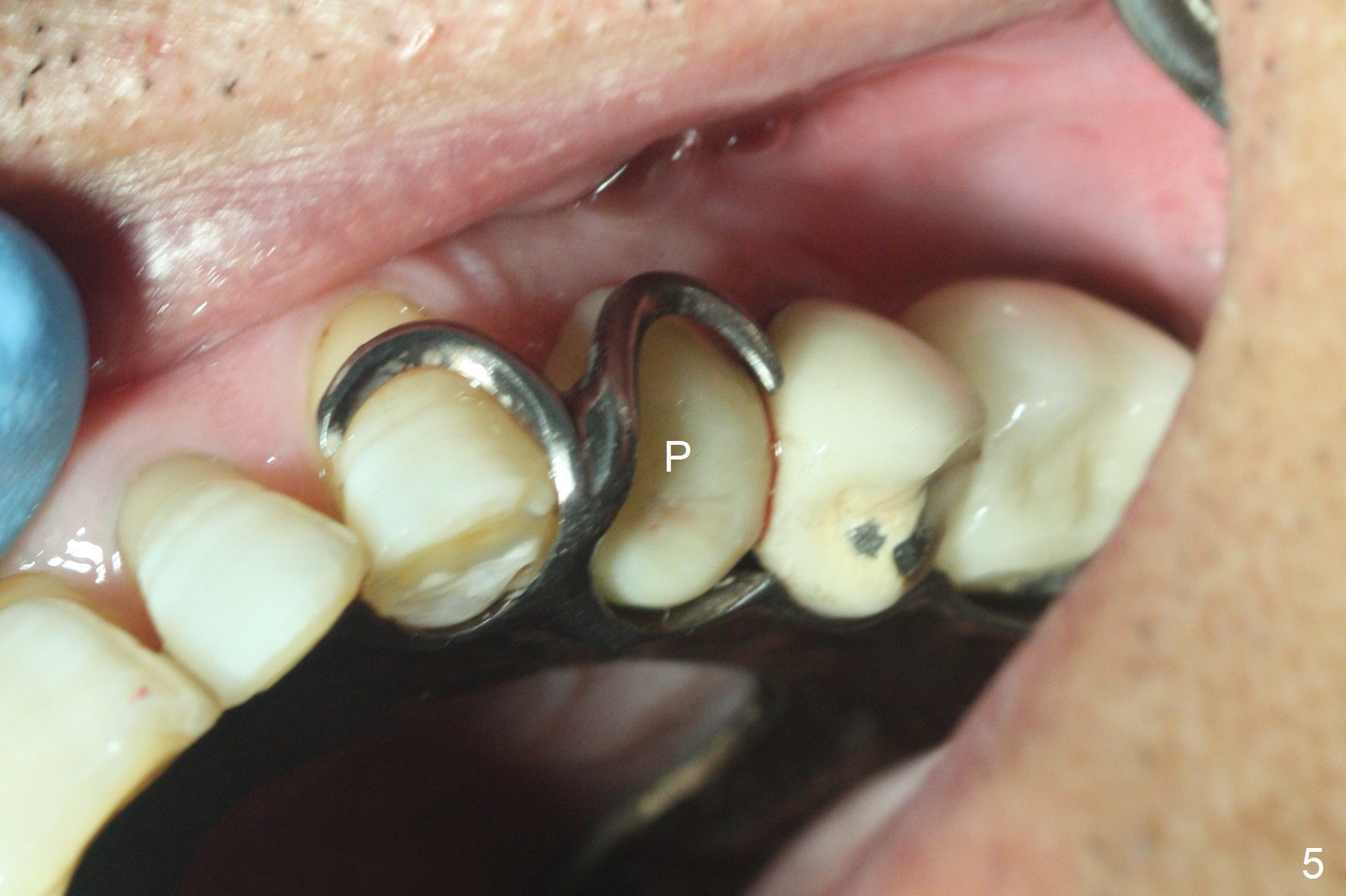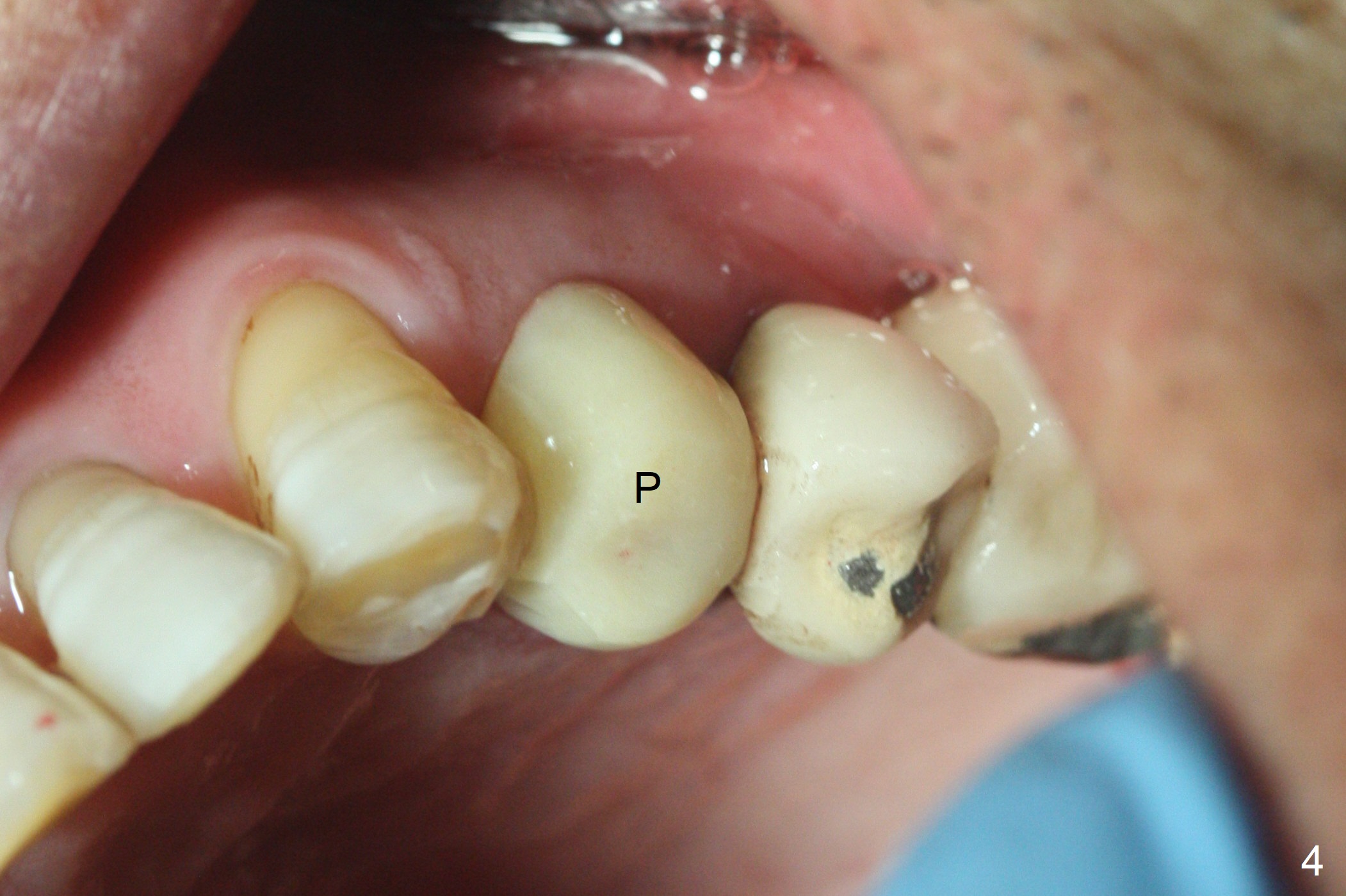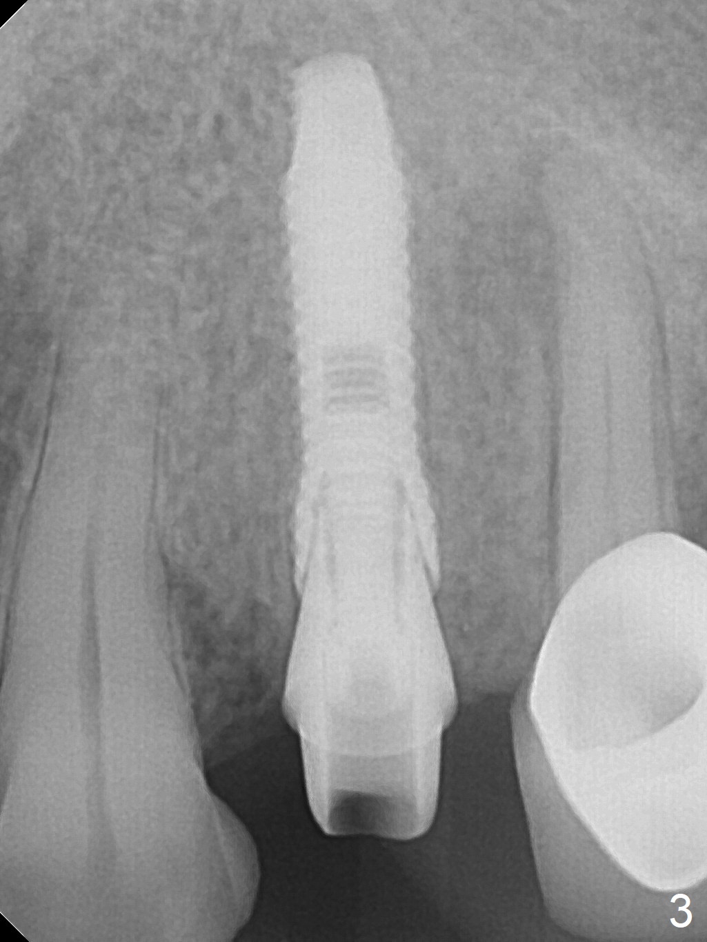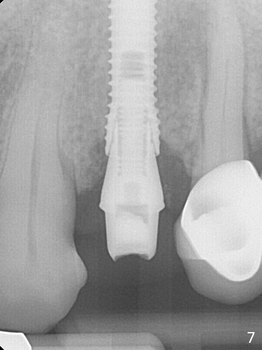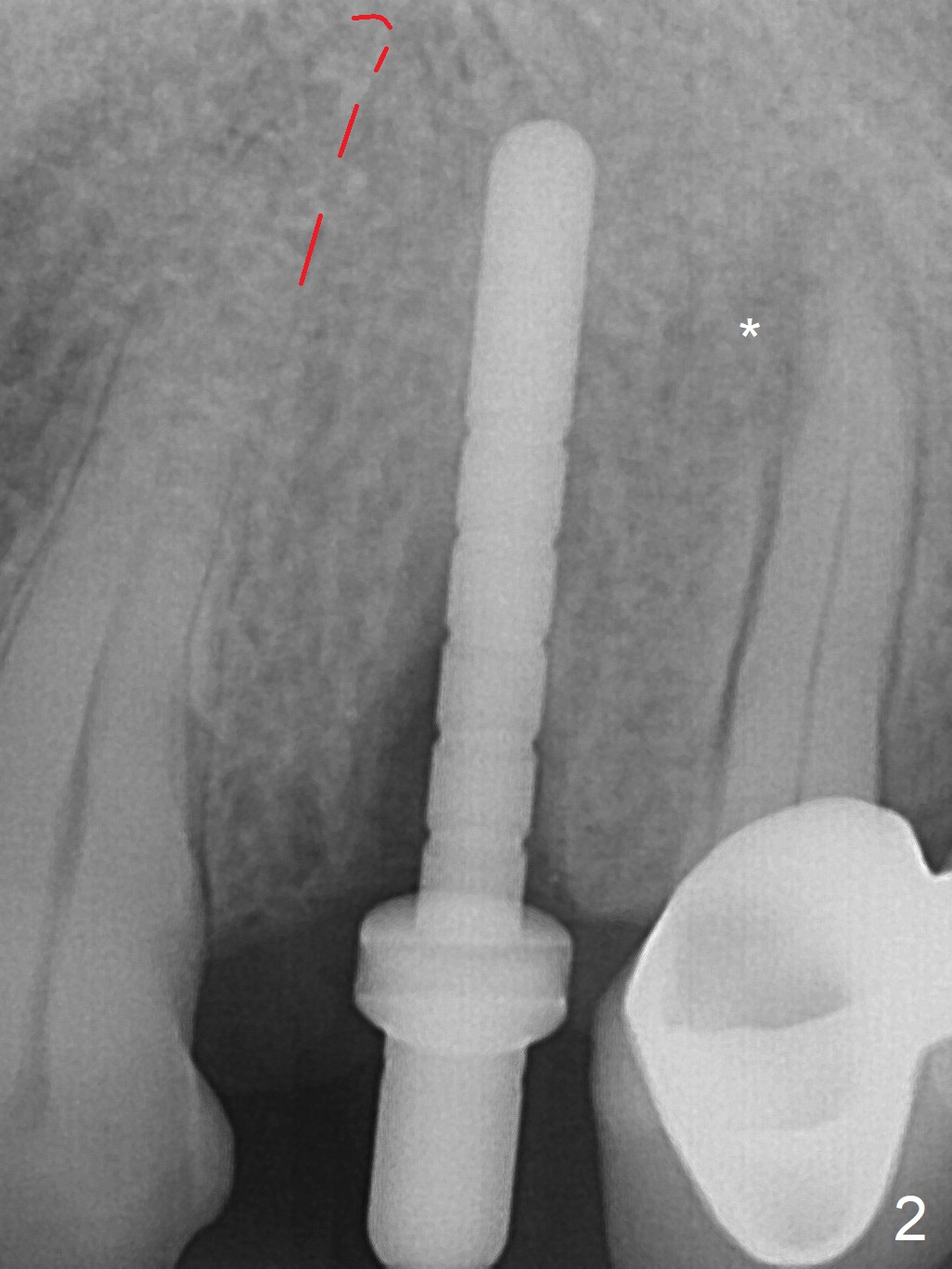 After extraction of the oval-shaped residual roots at #12 (Fig.1), osteotomy is initiated in the palatal socket for 18 mm; since the root of the canine curves distal (Fig.2 red dashed line), the osteotomy cannot afford to move mesial and extend more apical. A 3.8x15 mm implant is placed with > 50 Ncm (Fig.3). With immediate placement of a 4.5x4(3) mm abutment, an immediate provisional is fabricated to close the sockets (Fig.4 P). The provisional has clearance from the RPD clasps (Fig.5). In fact the implant could be longer, as shown by immediately postop panoramic X-ray (Fig.6). The implant seems to be osteointegrated 3 months postop (Fig.7). The tooth #13 is symptomatic with caries (Fig.8 C) 7 months post #12 crown cementation; the #13-15 FPD dislodges. The upper left quadrant is cold and hot sensitive 2.5 months post RCT (Fig.9); although there is mild percussion at #13, pulpal test shows that the tooth #15 has lingering pain. The FPD was recemented temporarily after RCT; it cannot be removed. The implant crown has been loose for several months during the pandemic before he returns 2 years 7 months post cementation. In fact the abutment has been not seated completely (from Fig.3 to 9). The crown/abutment is removed from the mouth; the crown is sectioned and separated from the abutment; the latter is reseated, but incompletely (Fig.10 <). With suspicion of the mesial crestal contact, profile drills 4.6 and 5.5 mm are used without effect. A new (old probably being worn) and longer (easy to turn in the narrow space) abutment is finally seated completely (Fig.11 (no gap)). After occlusal adjustment, abutment level impression is taken for a new crown.