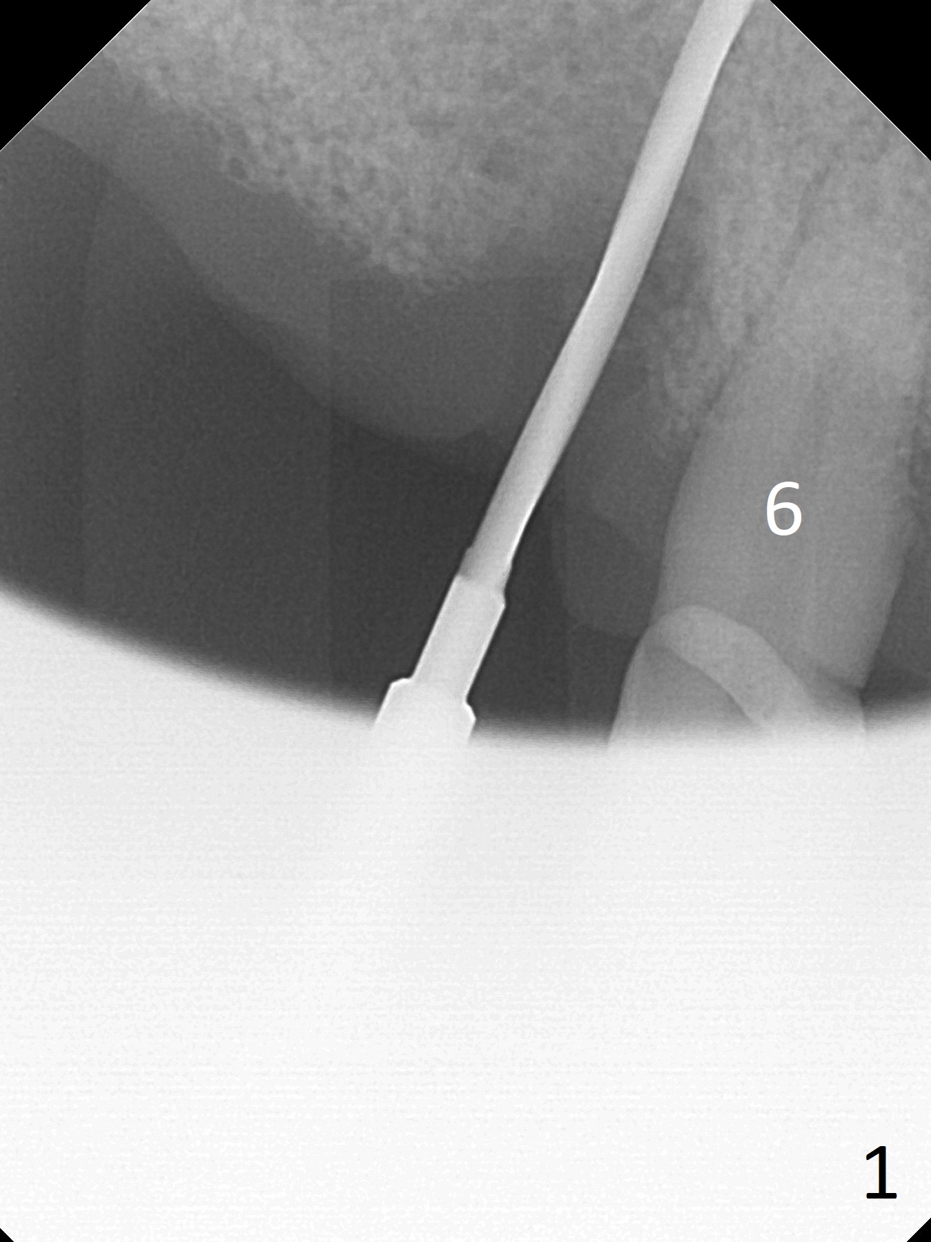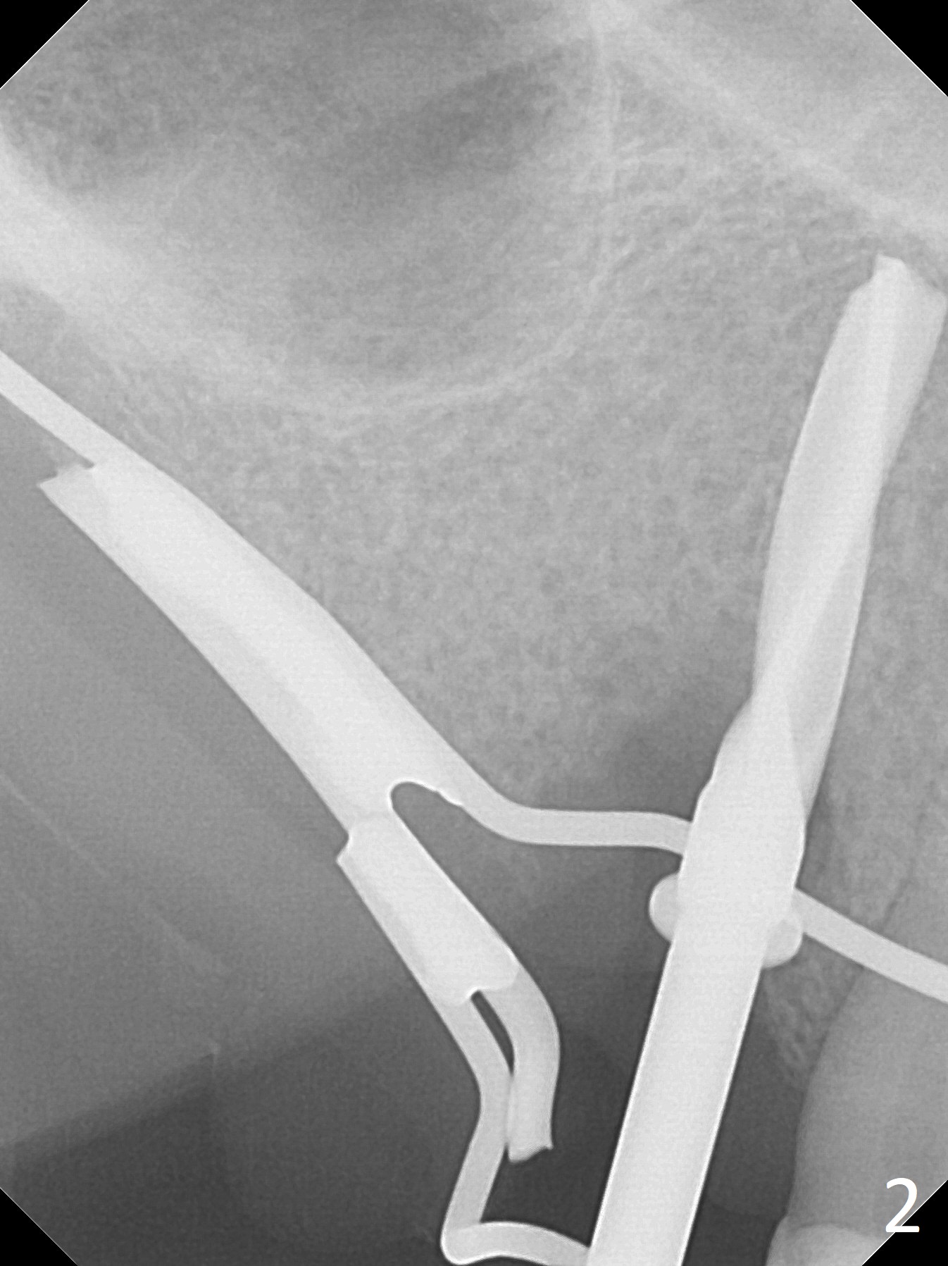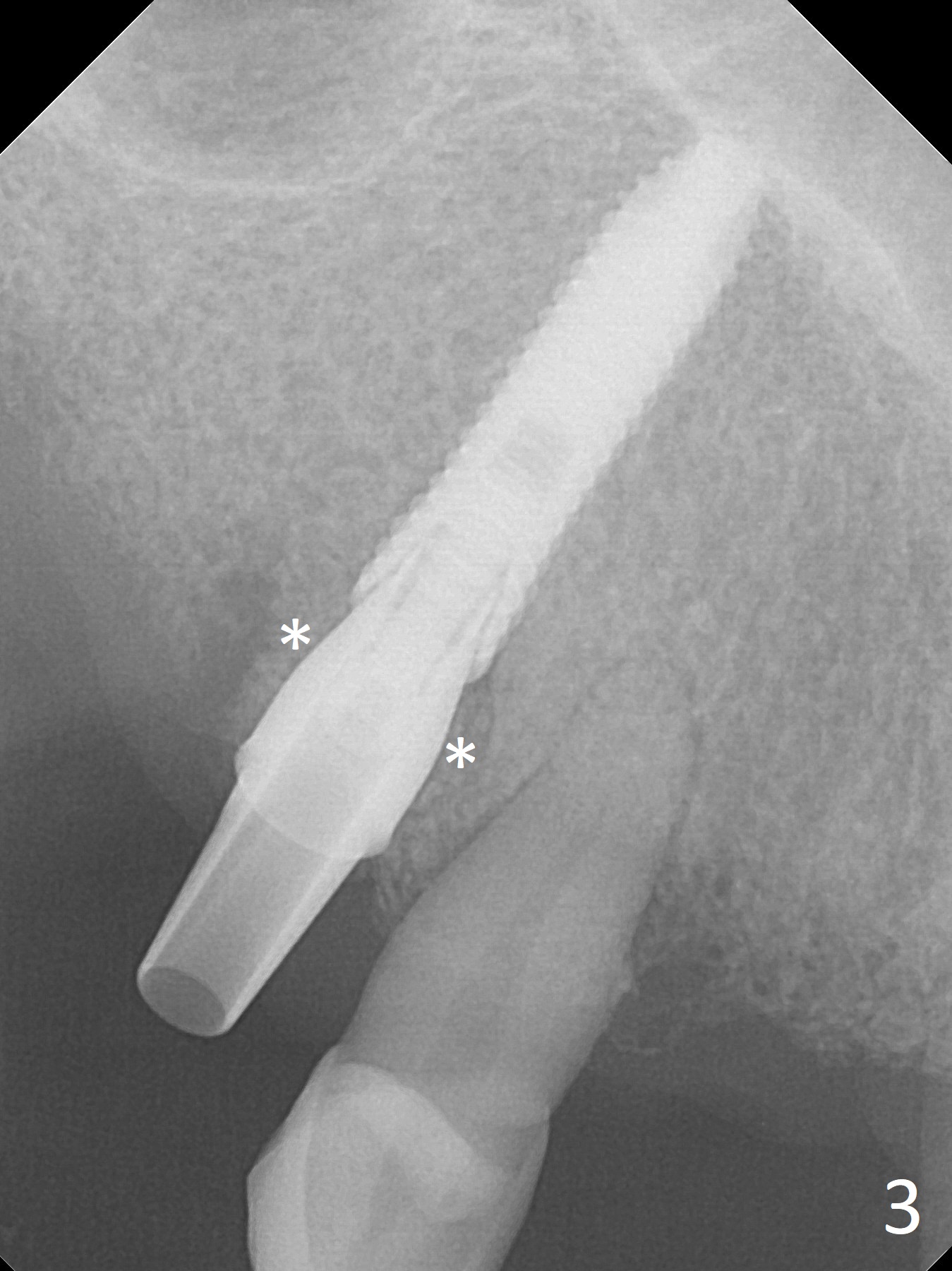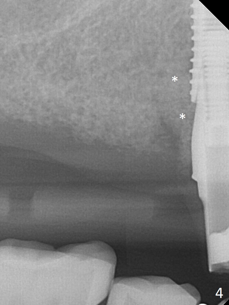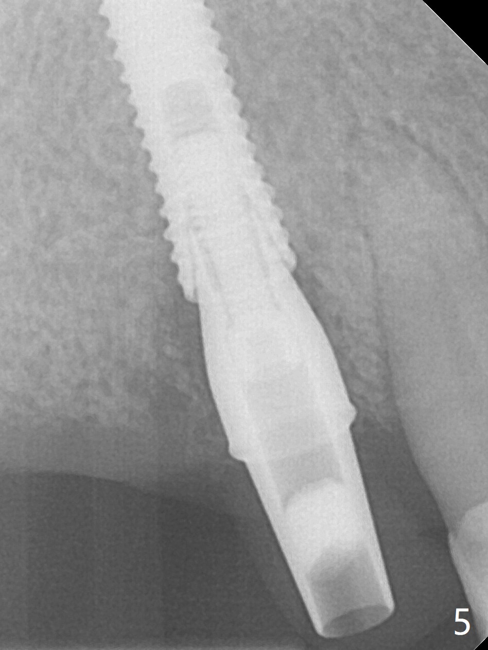 Extraction of the tooth #5 with mobility III reveals no buccal plate and low palatal plate. Osteotomy starts as palatal as possible (Fig.1). The bone density is low. After use of 2.7 mm drill (Fig.2), a 3 mm drill can be inserted into the osteotomy without resistance. A 4x16 mm implant is placed with insertion torque <30 Ncm. When an abutment is placed, the implant is found to have been placed distal. The implant is untorqued for change in trajectory. When a 4.5x7(5) mm abutment is placed, the abutment turns with the underlying implant (Fig.3). The former is kept to be turned with a hand driver until the latter is unable to turn. Following placement of allograft (Fi.g3,4 *), a mini-provisional is fabricated to retain the bone graft and at the same time not to be interfered with when a flipper is in and out. The bone graft in the former socket gap appears to have integrated into the native one 4.5 months postop (Fig.5).