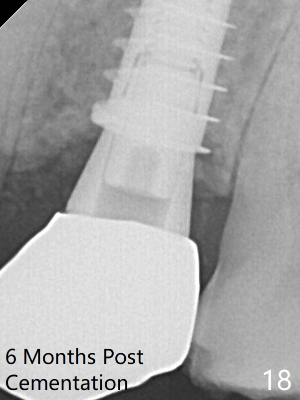 After allograft is placed around the implant, a 4.5x4(3) mm abutment is placed (Fig.10 A). Bitewing shows that the implant is not placed as deep as PA indicates. There is no bone loss 4 months postop (Fig.16). The crestal bone is denser 6 months post cementation (Fig.18).