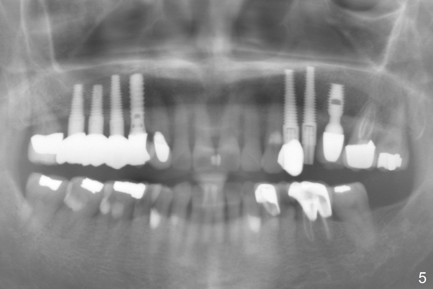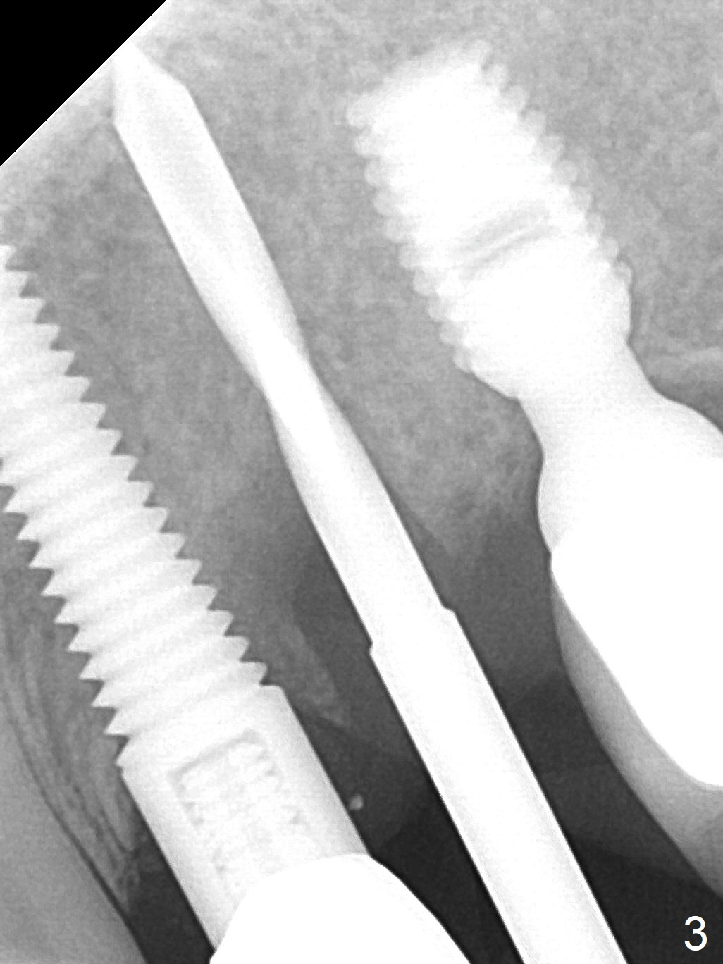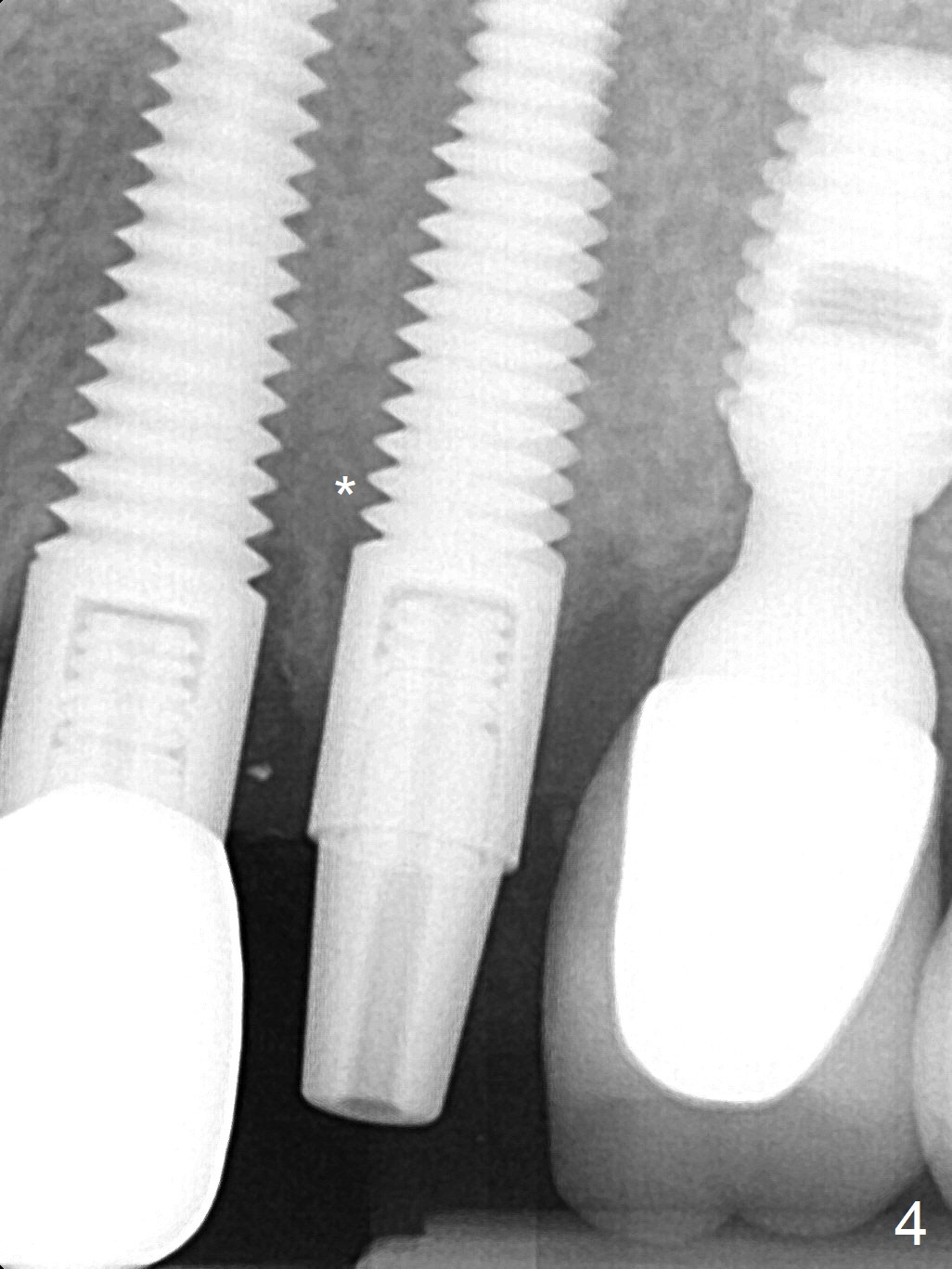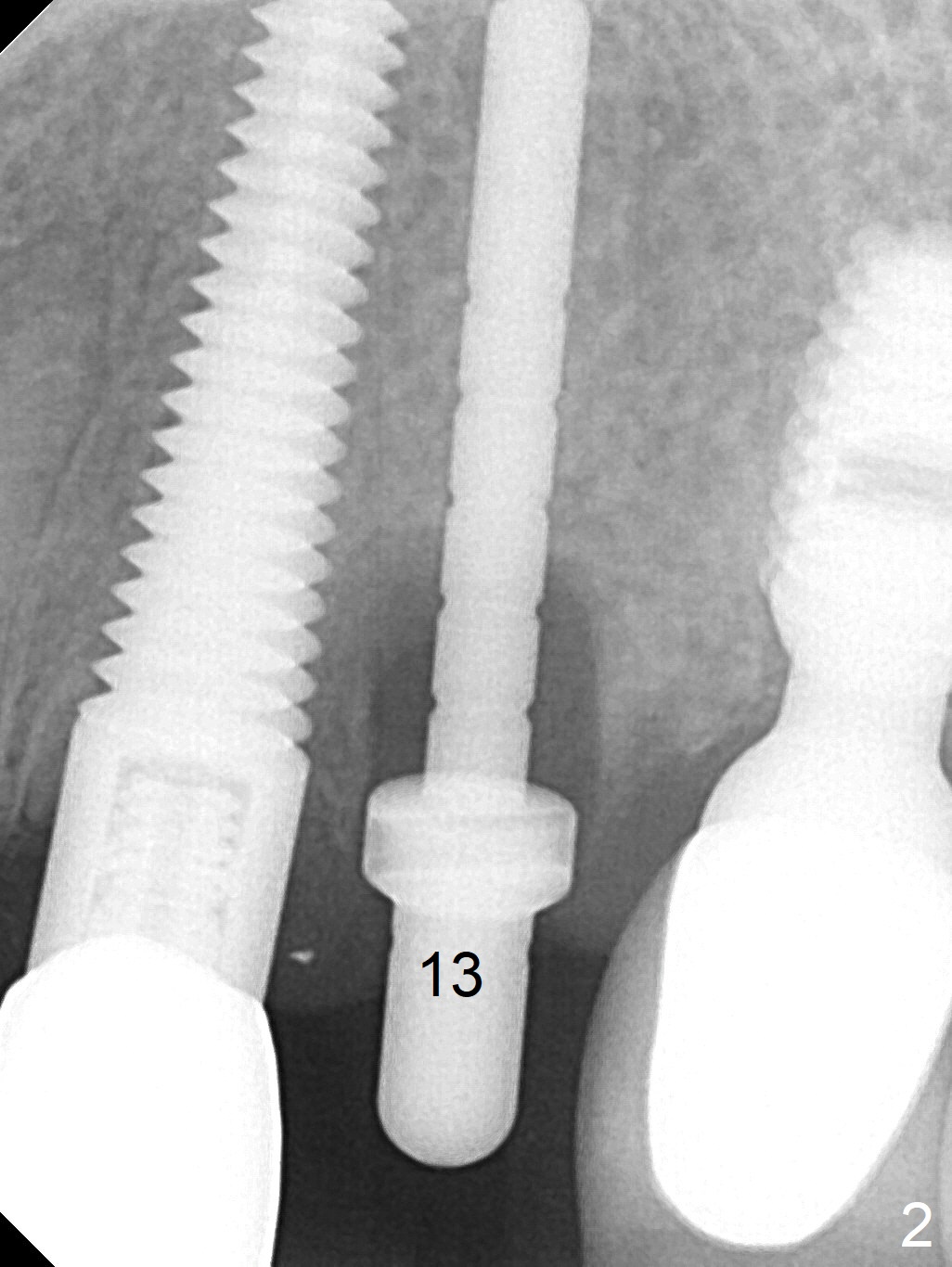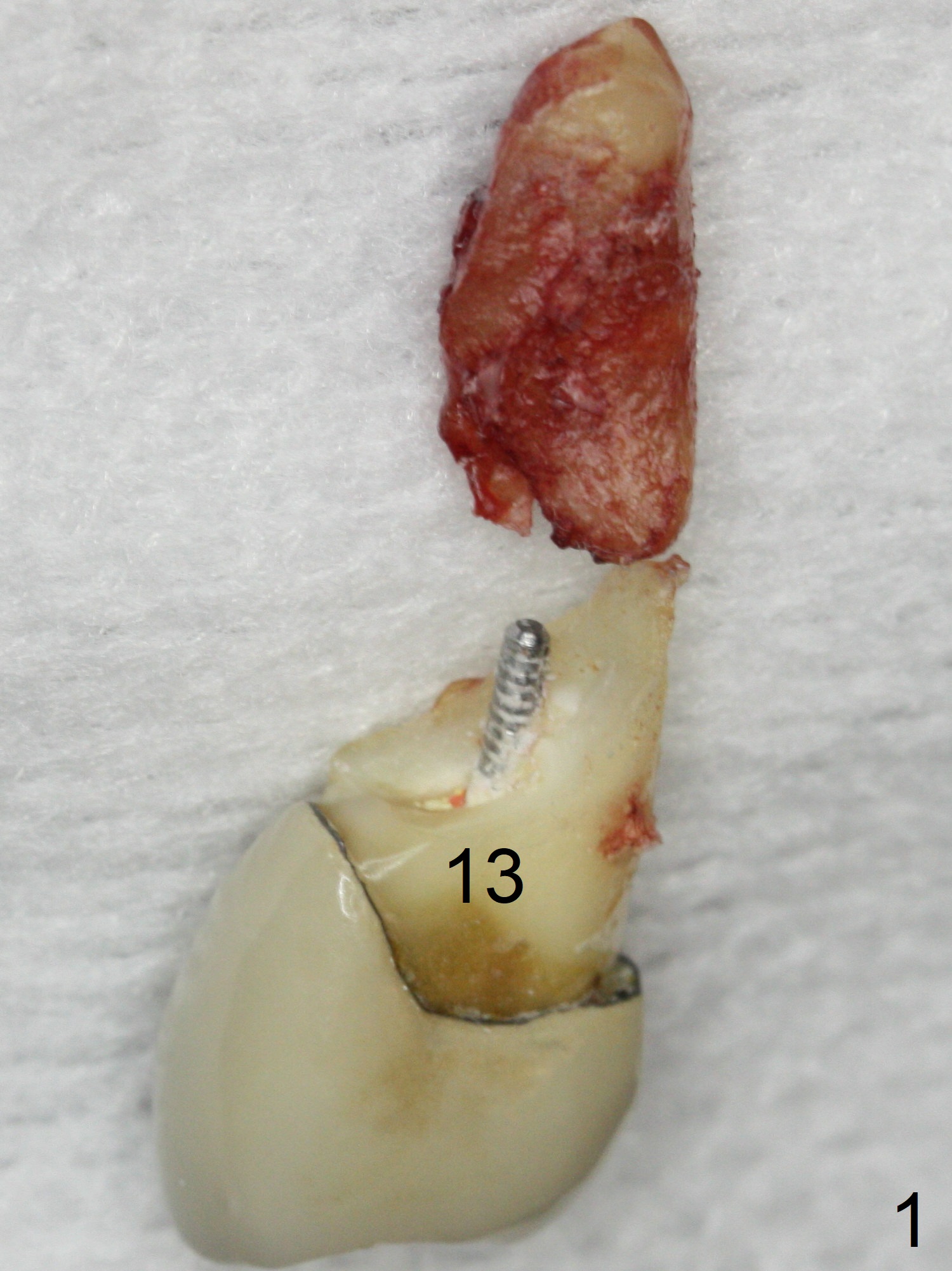 The root of the tooth #13 has an oblique fracture as related to a prefabricated post after 9 years of service (Fig.1). The trajectory of the initial osteotomy (Fig.2) is corrected with Lindamann bur and reuse of 2 mm drill (Fig.3). A 4x20 mm tissue-level implant is placed with > 60 Ncm, followed by tightening a 3.5x5 mm abutment (Fig.4,5); the mesiobuccal defect being filled with Vera Graft (Fig.4 *). An immediate provisional is fabricated. It appears that the implant should have been placed deeper (Fig.6: 5 months postop).